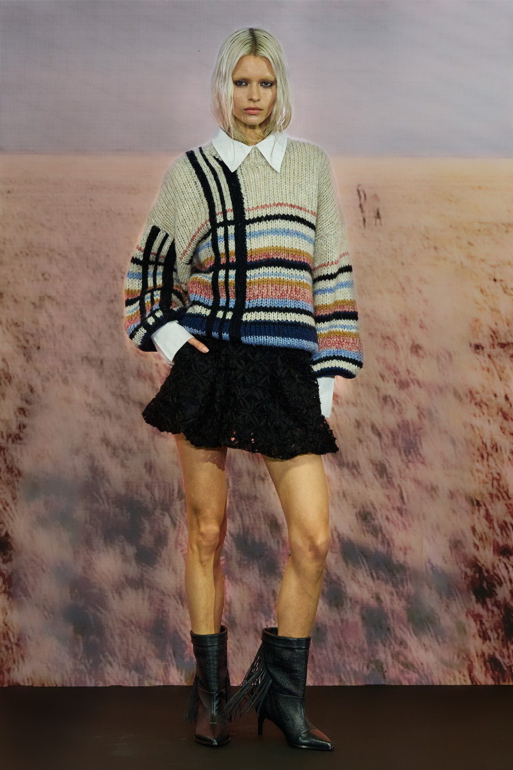 Также стоит отметить, что бренд представил свою первую коллаборацию с био-ателье Даши Цапенко. Художница создала уникальные вязаные фасоны из натуральной пряжи растительного происхождения, инфицированной спорами гриба-трутовика.