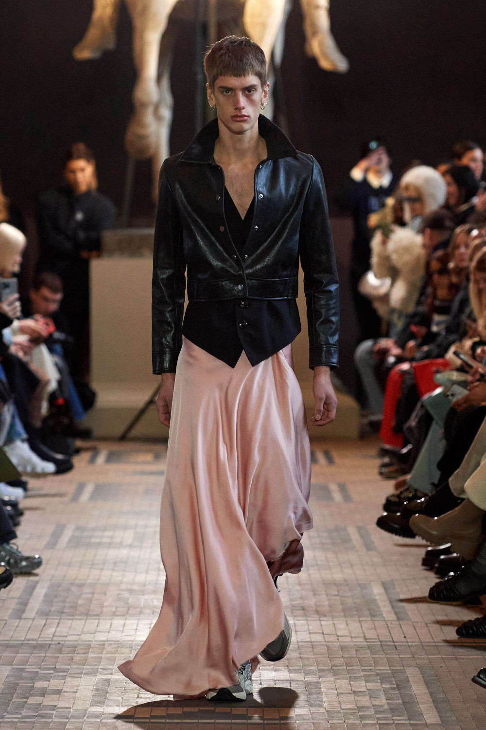 Тяжелые, словно поношенные куртки были накинуты вальяжным образом на плечи и сочетались с кремово-белым трикотажем и кружевом. В свою очередь, силуэты офисной униформы были переосмыслены посредством сверкающих деталей и кожи в винтажном стиле.