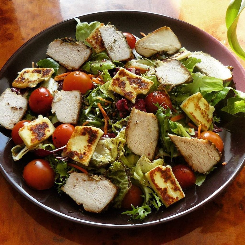 Достаньте сыр из холодильника и обваляйте каждый брусочек сначала в муке, потом в яйце и в сухарях. И отправляйте на сковороду. Обжаривайте с каждой стороны до появления румяной корочки. Добавьте сыр к овощам, посолите и поперчите по вкусу. При желании можно добавить обжаренное филе курицы, индейки или вареные креветки. Украсьте салат листиками базилика.