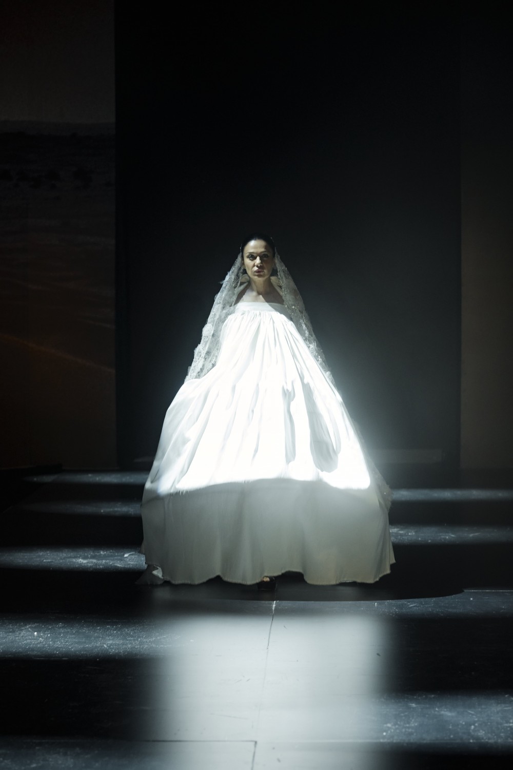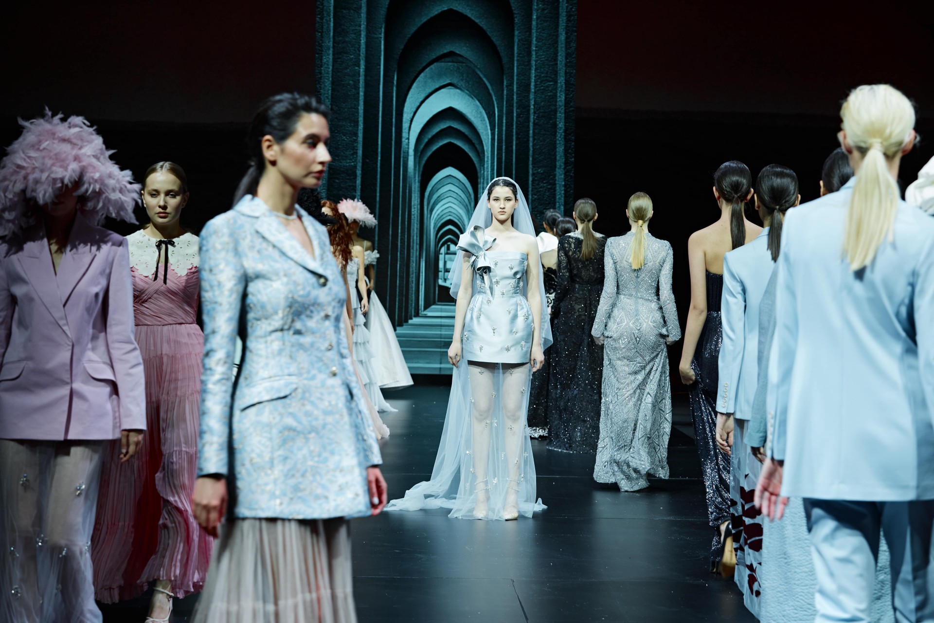 Модели на подиуме напоминали русалок, нимф и богинь, оживших со страниц сказок. Они предстали в платьях, сшитых из легких, сияющих тканей. Тюль и жаккард, инкрустация стразами и перья, цветочные аппликации и объемные рукава — все эти элементы подчеркивали хрупкость и нежность женского тела.