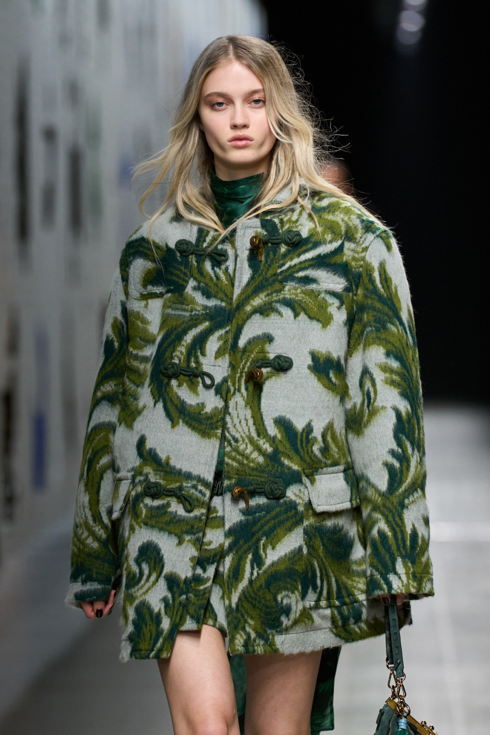 Сначала на подиуме появились массивные шерстяные пальто с узлами, завязанными вручную, объемные шапки и жакеты, напоминающие халаты. Затем в коллекции зазвучали мечтательные ноты: шелковые платья с крупными цветочными принтами, жаккард с фантастическими животными, деним с флористической графикой, словно перенесенной из таинственного гербария.