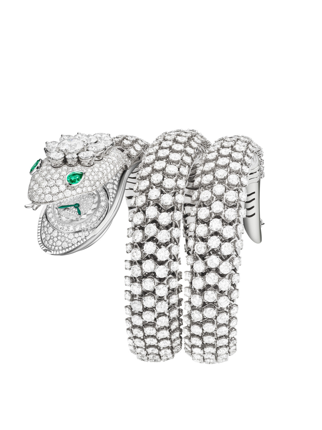 Serpenti Pallini с двойным витком, обладающие ослепительной гибкостью, нежно обвивают запястье. Их смелый дизайн, вдохновленный историческими моделями Pallini 1955 года, напоминает кожу экзотической змеи. Ее чешуя состоит из бесчисленных маленьких золотых бусин или бриллиантов классической огранки, каждый из которых индивидуально закреплен на золотой сетке, с использованием техники, основанной на методе «en tremblant», придуманном в Париже в XVIII веке.