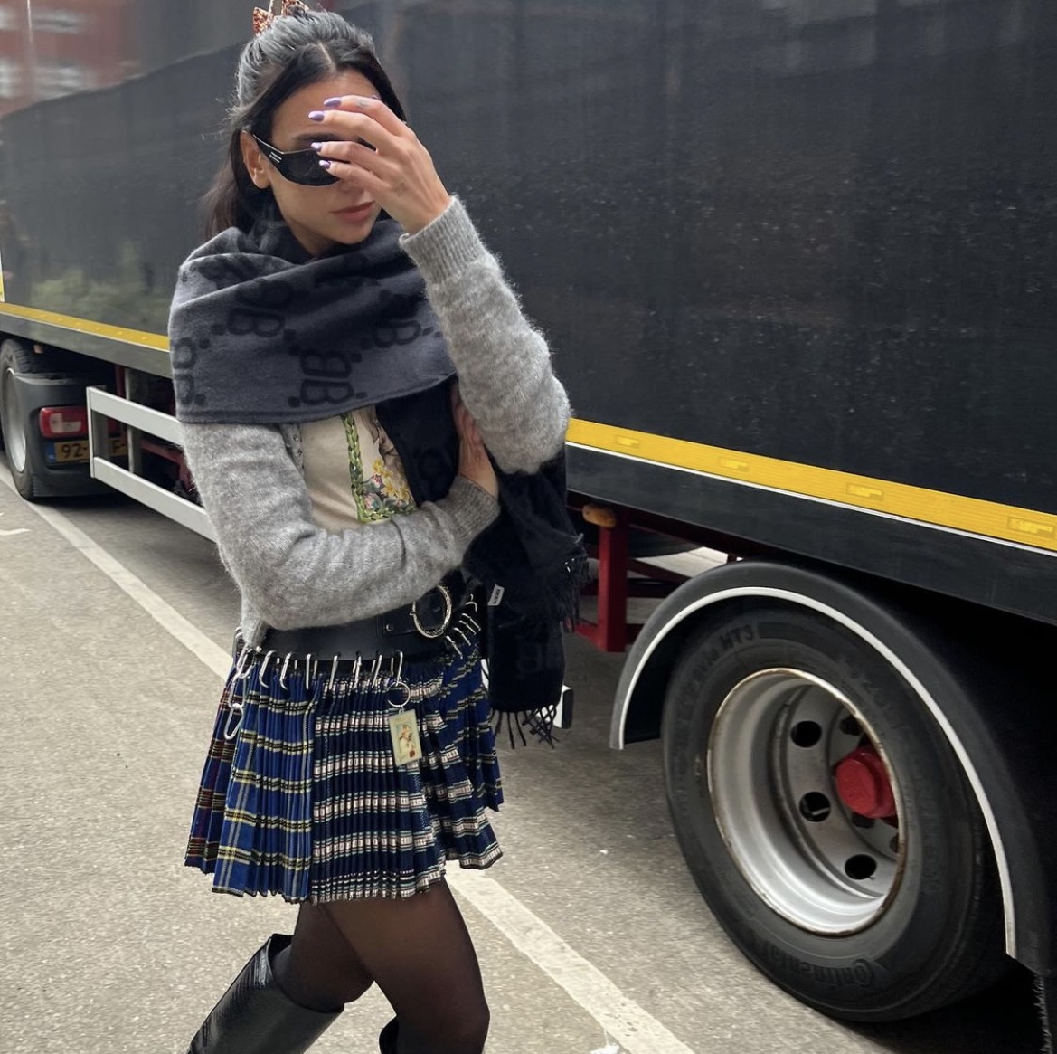 В среду Липа опубликовала пост, где позирует в клетчатой мини юбке. Получилось очень задорно и стильно. Наверх Дуа надела принтованную футболку и серый укороченный кардиган. Образ дополнил темно-синий объемный шарф из коллаборации Balenciaga и Gucci, черные сапоги с тиснением под крокодила и солнцезащитные очки в тон. В таком наряде звезда вполне бы составила конкуренцию Серене ван дер Вудсен - главной героине сериала "Сплетница".