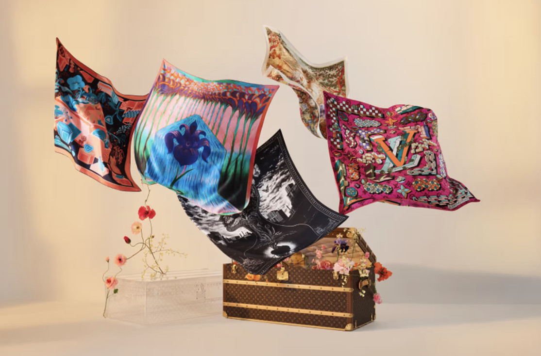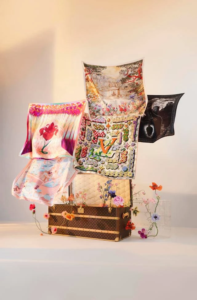 Платок Maze of Precious, созданный eBoy, представляет собой многоцветный лабиринт, в центре которого находится логотип LV. В свою очередь, изделие от Ицинори посвящено легендарному процессу изготовления чемоданов, который принес основателю бренда первый успех, а Лоренцо Маттоти — цветку ириса, который когда-то украшал витражи в доме семьи Виттон.