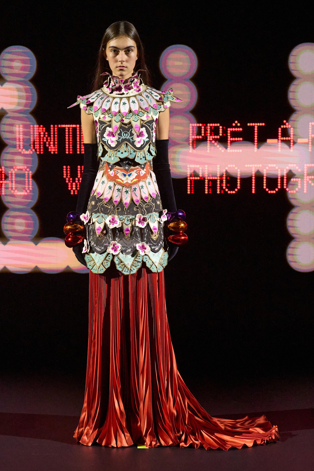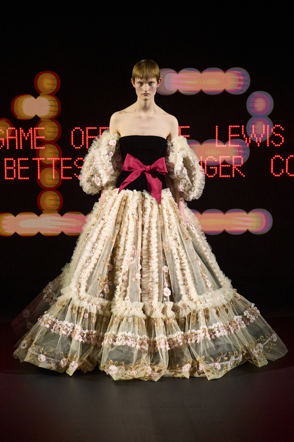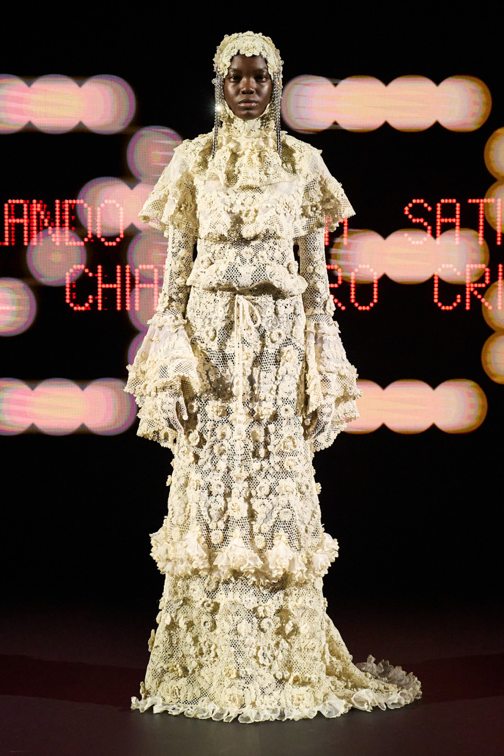 Первый образ задал тон всей коллекции: объемная платье из тюля, напоминающее образ «Арлекино», стала визуальным манифестом — сочетанием средневекового кроя и футуристического духа. На его создание потребовалось около 1 600 часов ручной работы. Далее на подиуме были представлены платья, полностью выполненные из старинных гобеленов, юбки из жесткого кринолина, а также маски, некоторые из которых были похожи на те, что носили борцы Lucha Libre (прим. ред. — мексиканская разновидность рестлинга ), турецкие фески, а также нежные и одновременно готические вуали.