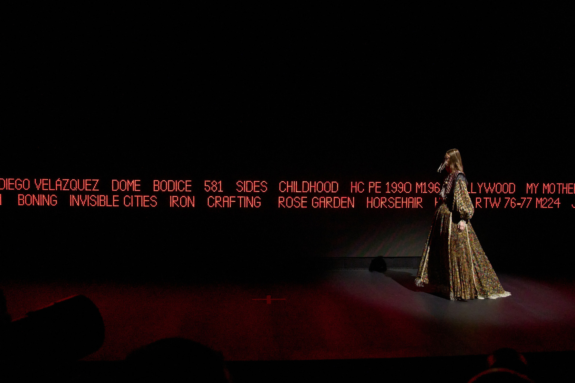 Пространство показа было оформлено в виде стадиона, а модели выходили одна за другой, замирая на зеленой «X» в центре сцены. За их спинами мерцали красные слова, выпадающие из потока сознания: «контраст», «созерцание», «галактика», «аллюзия». Это был перформанс, пробуждающий ощущение временной петли, где прошлое и будущее сплетаются в единое целое. Модный ребус, который можно разгадывать часами.