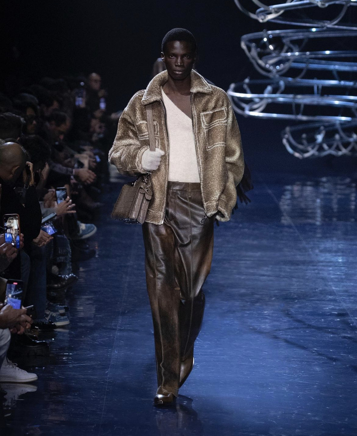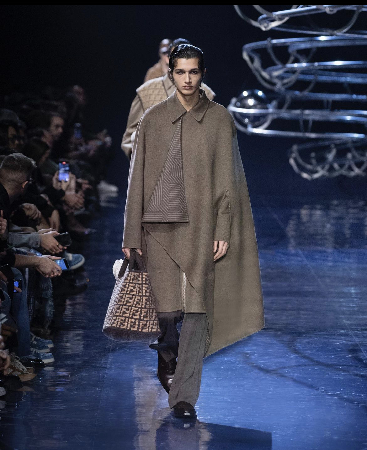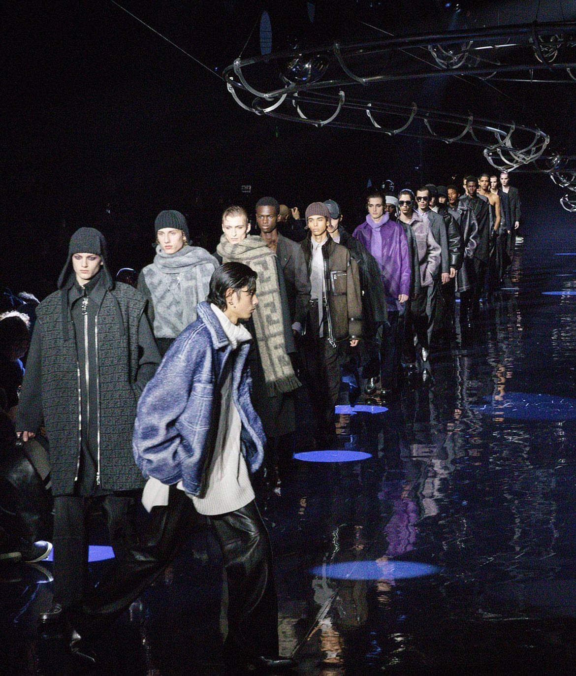 Сильвия Вентурини Фенди при создании мужской коллекции руководствовалась одной целью — она хотела создать образы, в которых можно отправиться на танцплощадку прямиком с работы, а после вернуться обратно. Вдохновение дизайнер черпала из своей юности, когда она пропадала днями и ночами на диско-вечеринках Рима и Нью-Йорка. Именно поэтому для проведения дефиле было выбрано пространство, в котором над головами зрителей кружились диско-шары.