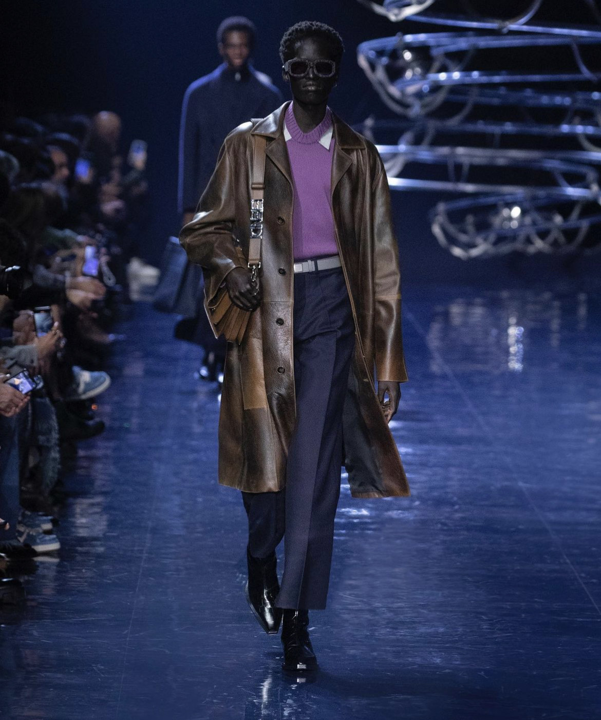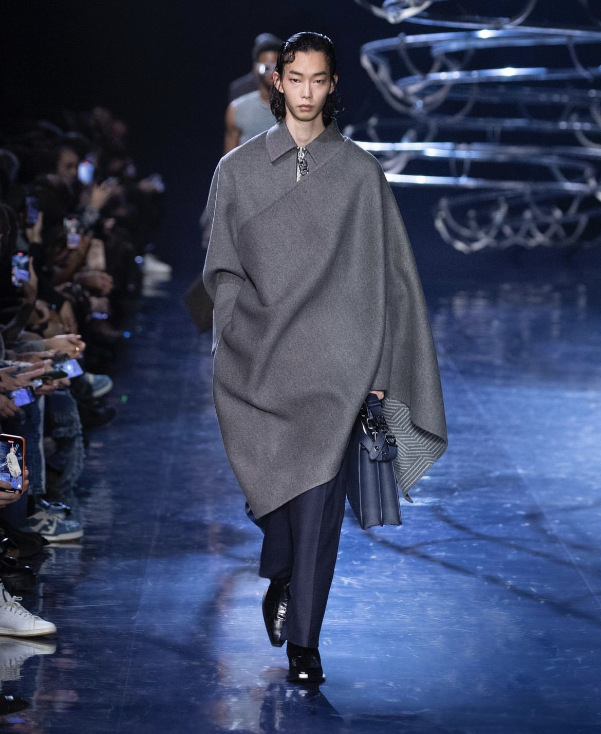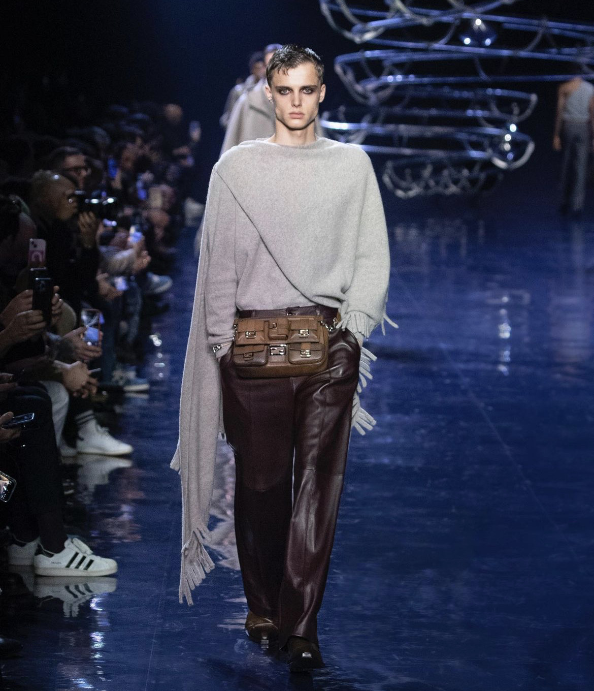 Сильвия Вентурини Фенди при создании мужской коллекции руководствовалась одной целью — она хотела создать образы, в которых можно отправиться на танцплощадку прямиком с работы, а после вернуться обратно. Вдохновение дизайнер черпала из своей юности, когда она пропадала днями и ночами на диско-вечеринках Рима и Нью-Йорка. Именно поэтому для проведения дефиле было выбрано пространство, в котором над головами зрителей кружились диско-шары.