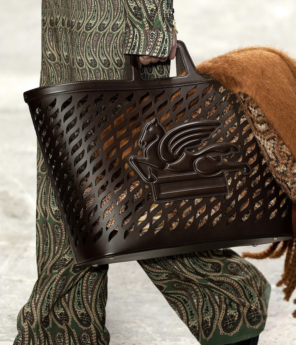 В 1968 году Etro стартовал как компания по производству текстиля. Марко взял за основу архивные принты и ткани Etro 1970-х и представил посредством их новые современные силуэты. Пальто-покрывала, куртки-гобелены, пижамные костюмы и кардиганы-пледы — показ переместил зрителей на домашнюю уютную вечеринку. Также в коллекции были продемонстрированы более классические образы — брючные костюмы в стиле этой эпохи из тартана, двубортные приталенные блейзеры, что надевались поверх расклешенных брюк или длинных плиссированных килтов.
