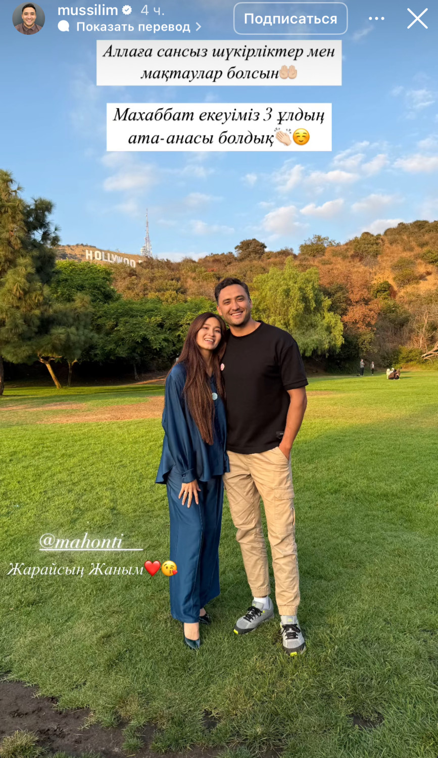 «Аллаға сансыз шүкірліктер мен мақтаулар болсын. Махаббат екеуіміз үш ұлдың ата-анасы болдық. Жарайсың, жаным!»,