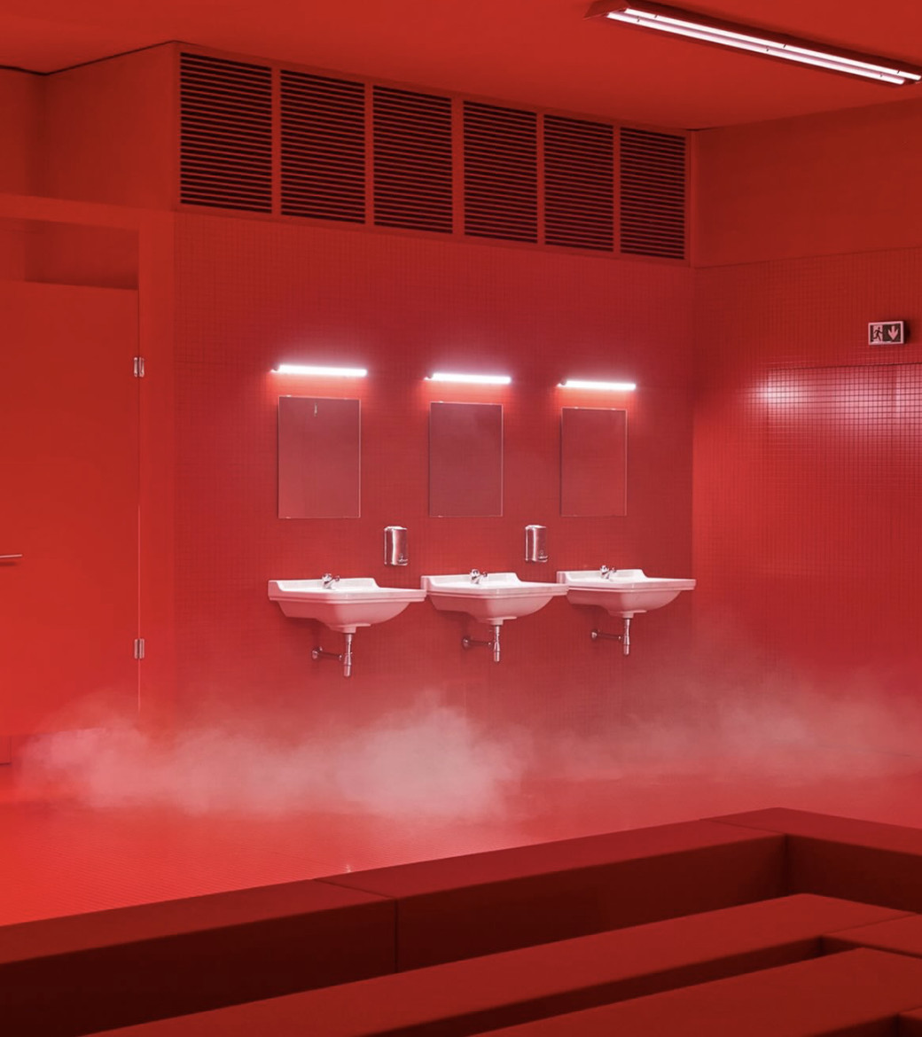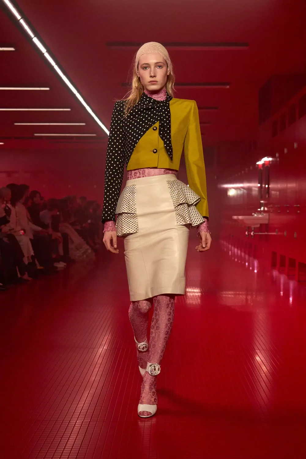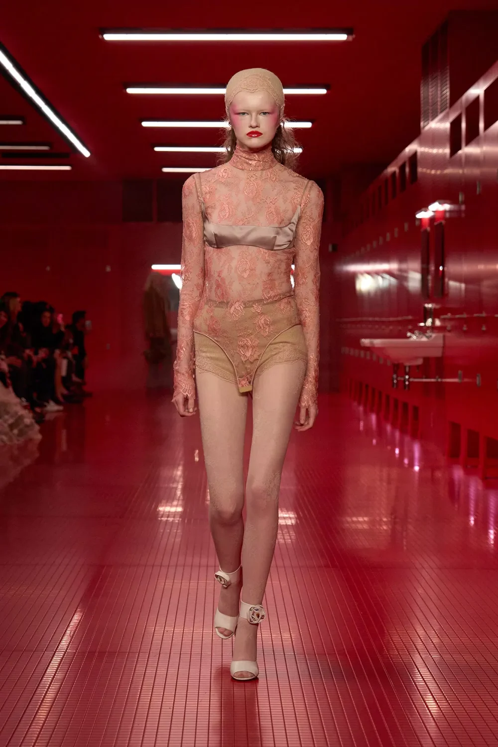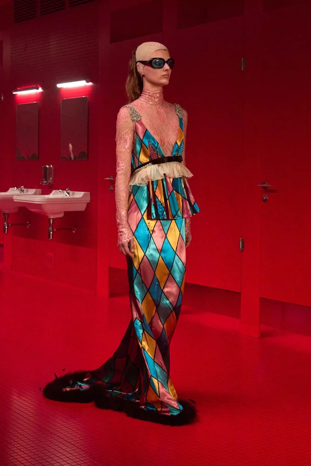 Красный свет, мигающие лампы и томный голос Ланы Дель Рей, поющей Gods & Monsters, — Микеле превратил подиум в нечто среднее между раздевалкой и туалетом ночного клуба. Модели выходили из кабинок, кокетливо поправляя макияж у зеркала — словно завсегдатаи дамской комнаты, где под слоями помады и блеска зачастую кроются самые искренние признания.