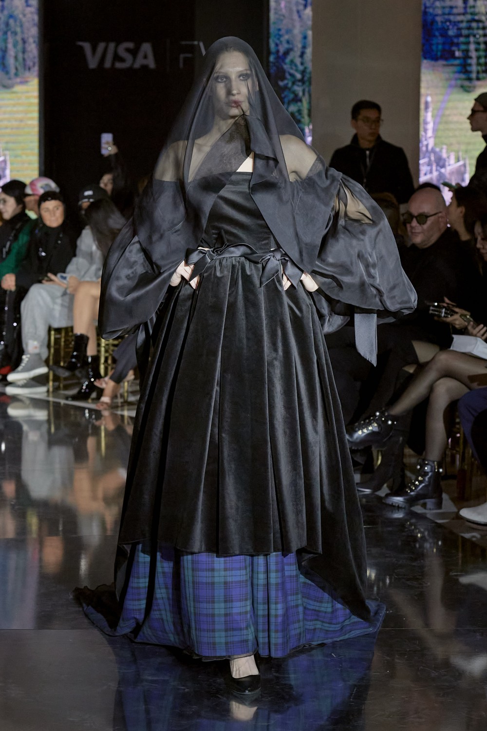 Показ открыл вечерний образ, состоящий из платья длины макси с объемными рукавами и вуалью — так Сакен решил почтить память королевы Елизаветы II. В коллекции за основу был взят черный цвет, который был дополнен элегантным принтом — шотландской клеткой «тартан». Дизайнер обратился к необычным сочетаниям тканей: бархат и шелк, мех и органза.