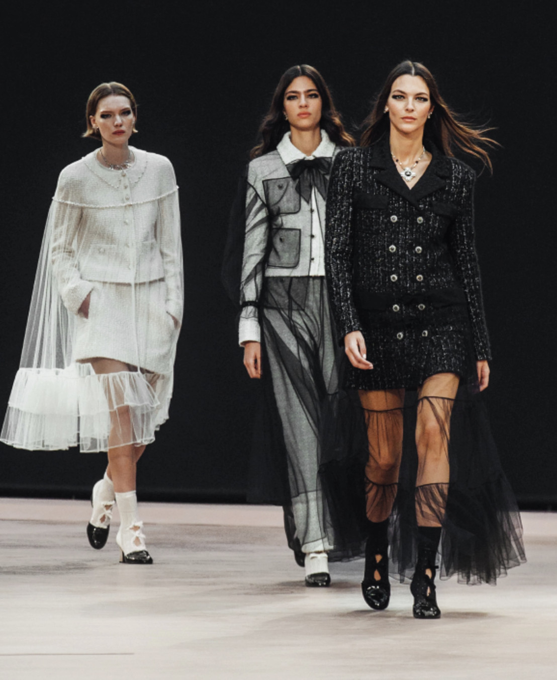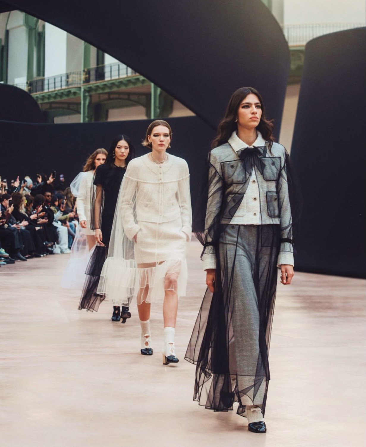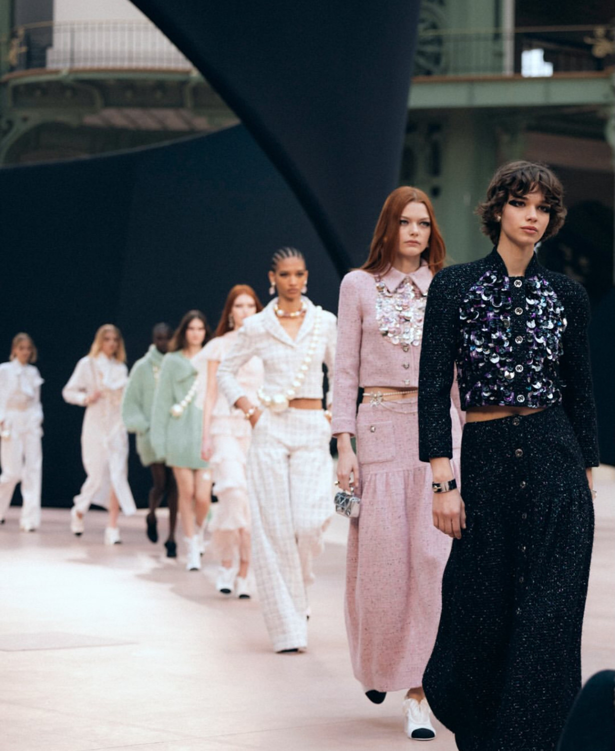 Дизайнеры Chanel назвали коллекцию «театром иллюзий, навеянных сновидениями» — и эта идея прослеживалась в каждом образе. Легкие накидки, воздушные блузы и многослойные юбки словно окутывали моделей облаком тумана, заставляя их парить по подиуму. А высокие жабо-воротники, вдохновленный эпохой Карла Лагерфельда, кокетливо выглядывали из-под приталенных жакетов, добавляя образам выразительную театральность.