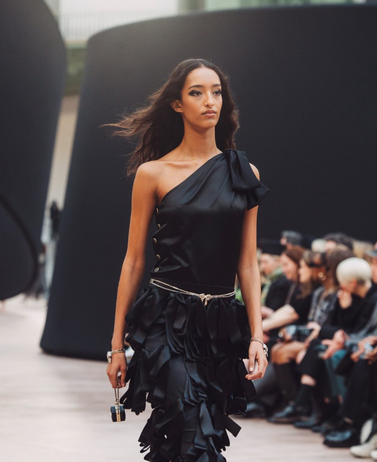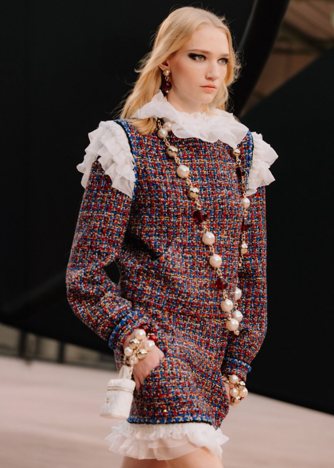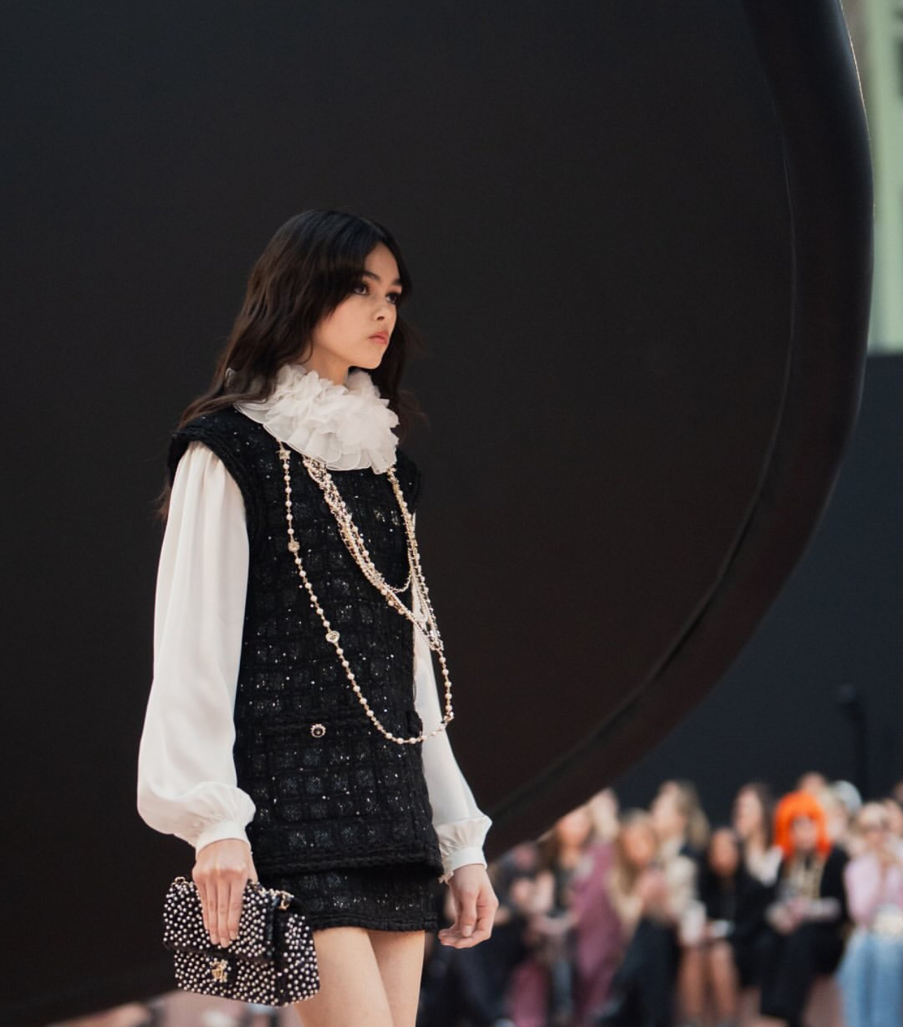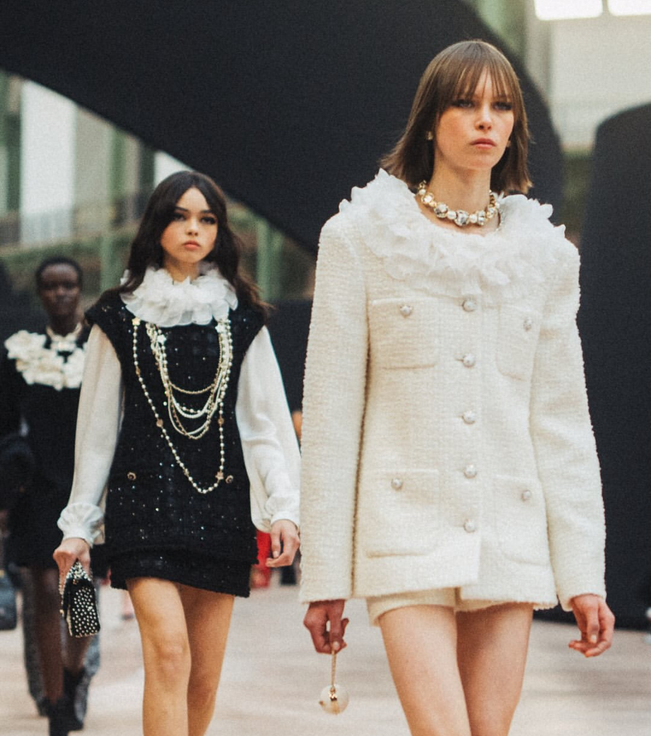 Дизайнеры Chanel назвали коллекцию «театром иллюзий, навеянных сновидениями» — и эта идея прослеживалась в каждом образе. Легкие накидки, воздушные блузы и многослойные юбки словно окутывали моделей облаком тумана, заставляя их парить по подиуму. А высокие жабо-воротники, вдохновленный эпохой Карла Лагерфельда, кокетливо выглядывали из-под приталенных жакетов, добавляя образам выразительную театральность.