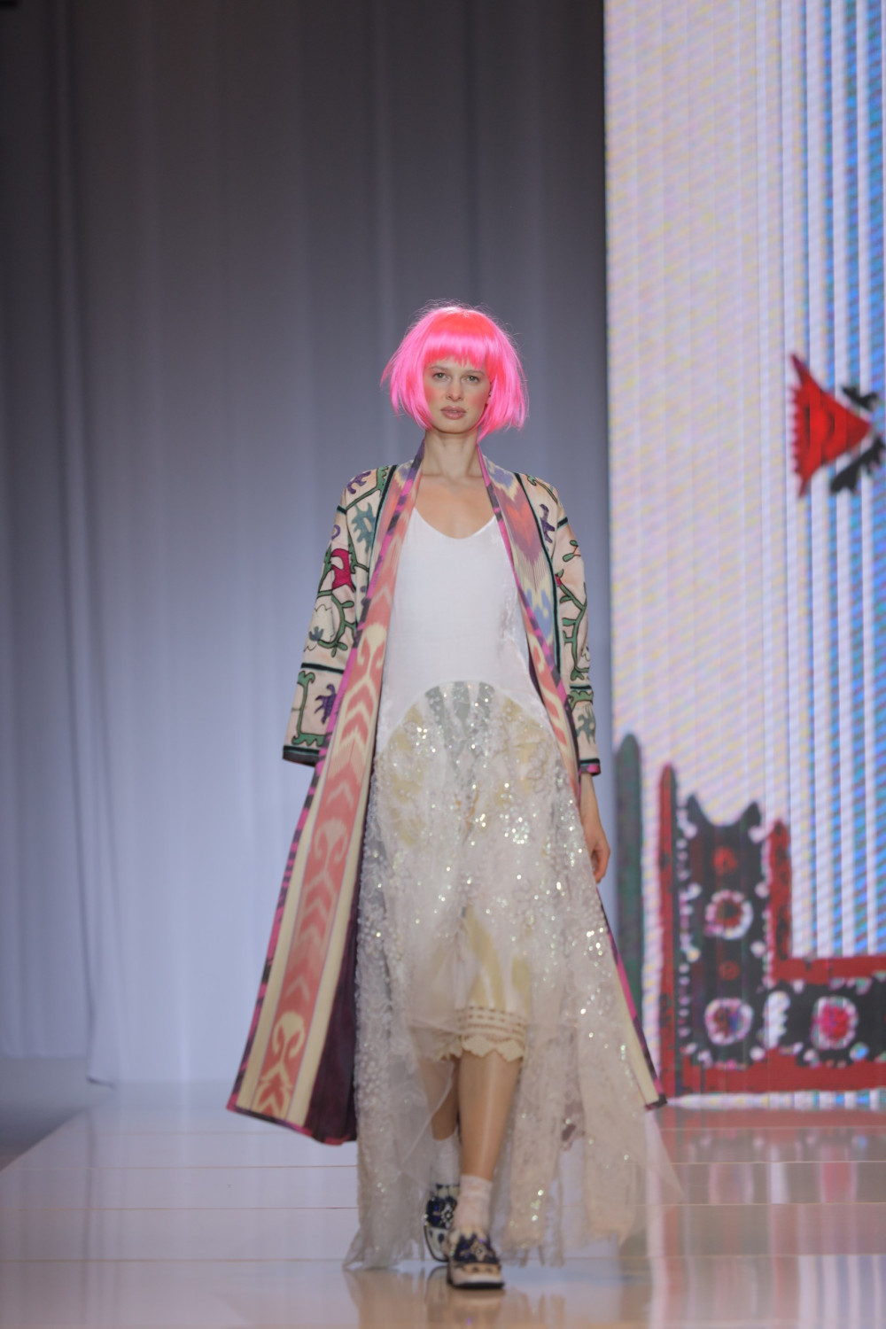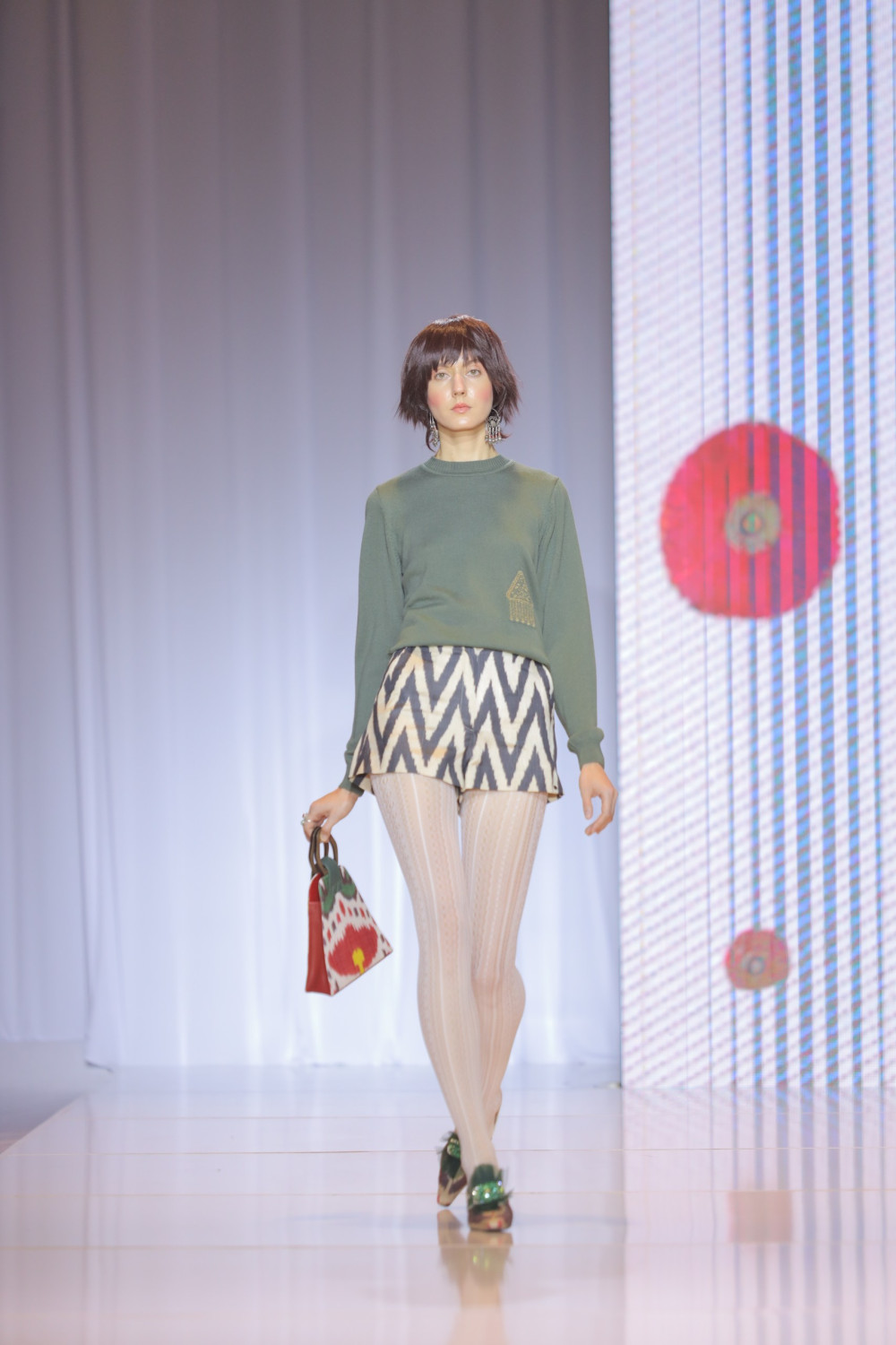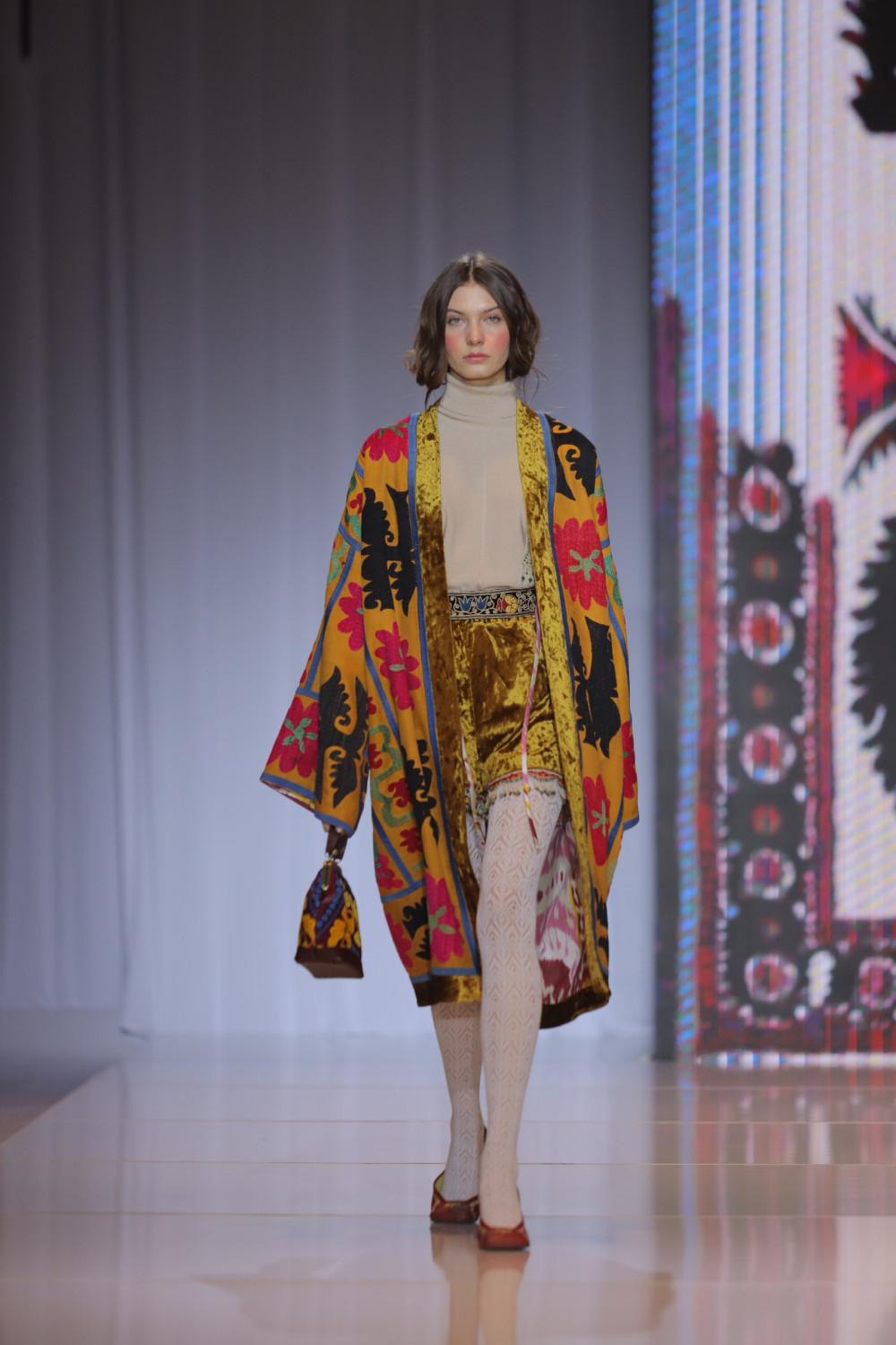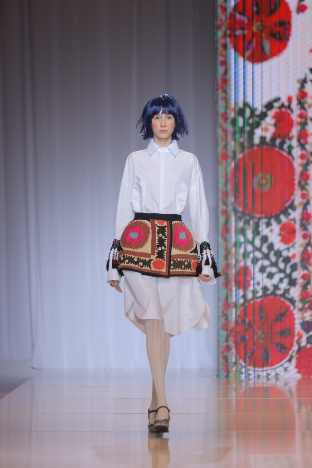 Каждый образ передавал дух таинственной, сильной и независимой женщины, ценящей национальный колорит, — все благодаря тонкому сочетанию цветов и ювелирной ручной работе. В новом сезоне кутюрье предлагает нам сочетать однотонные водолазки с миди-юбками с национальным колоритом и придавать игривости платье-рубашке из хлопка с помощью баски с узбекским принтом.