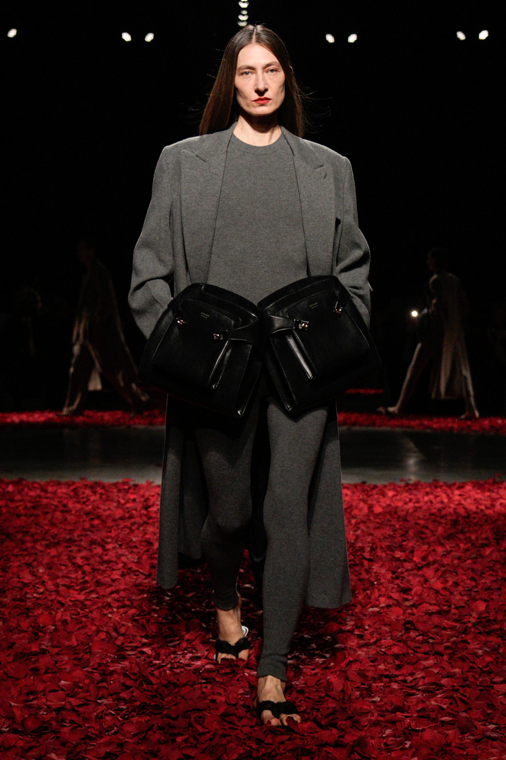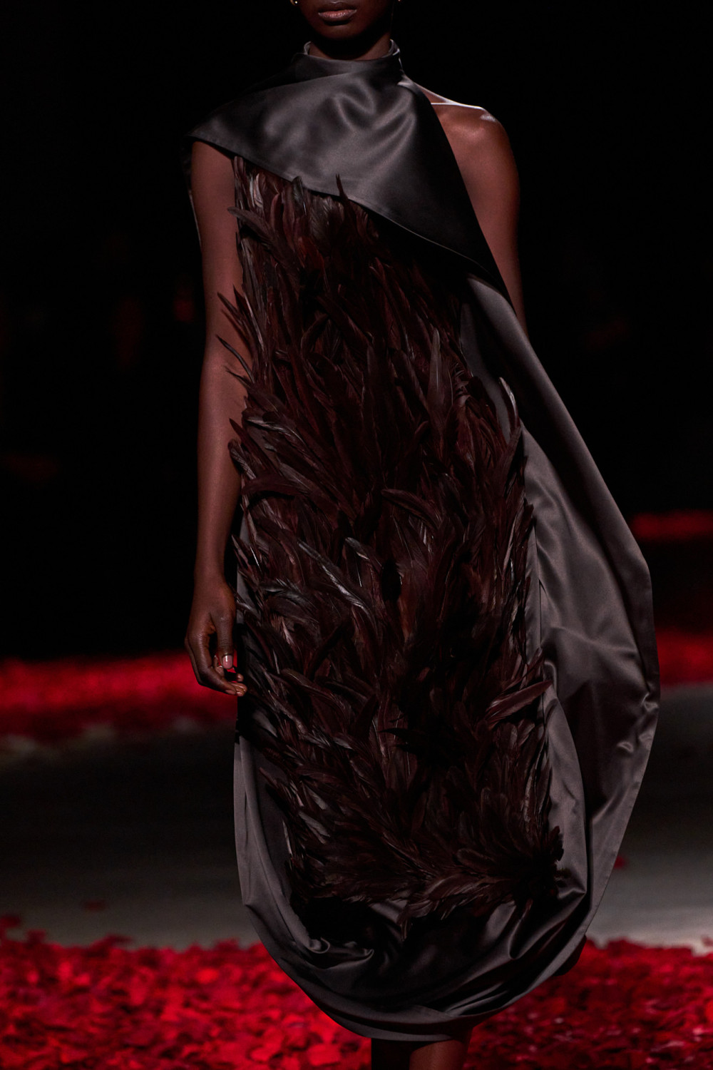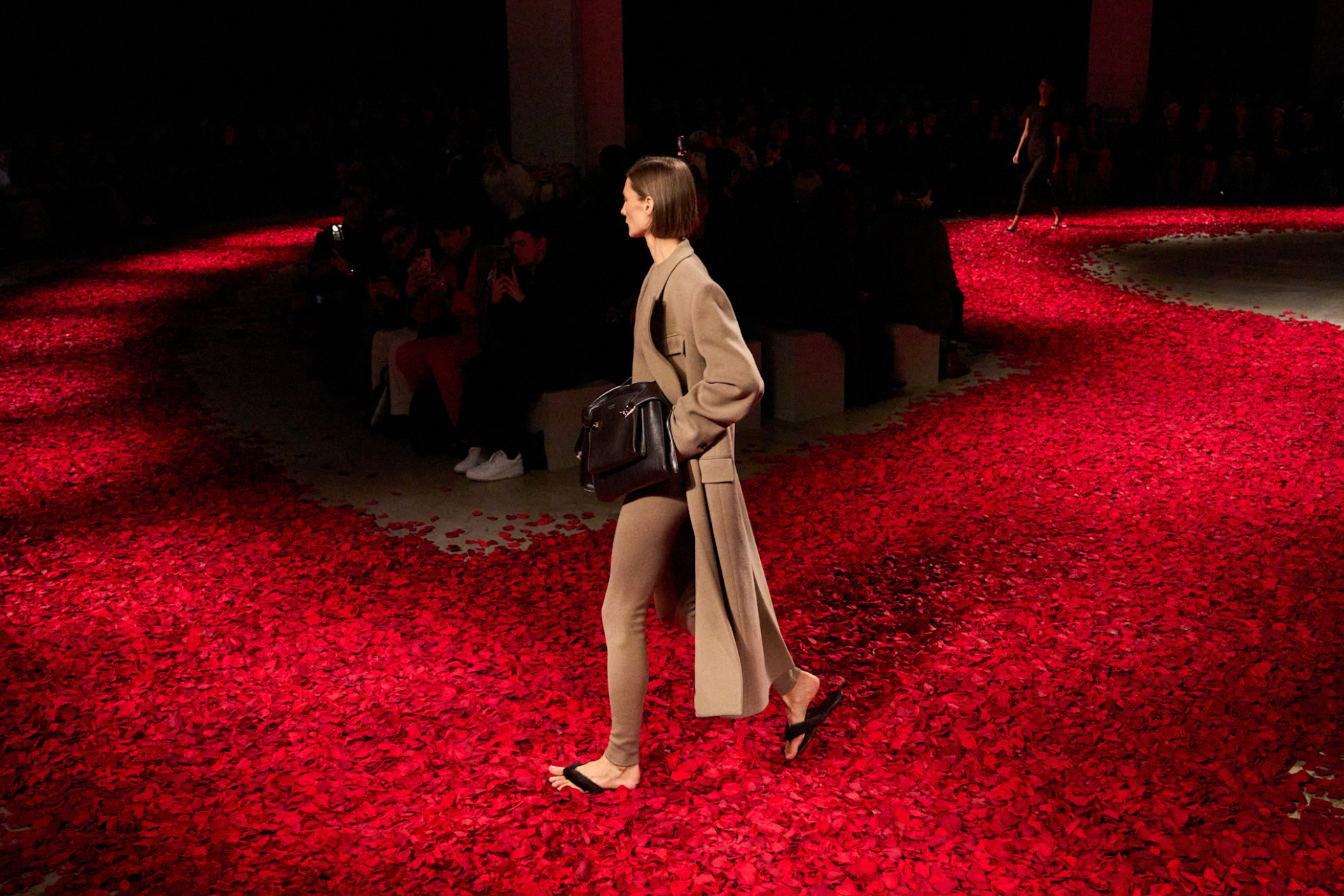 Подиум, утопающий в лепестках, словно перенесенный из постановки Бауш, стал идеальным фоном для одежды, воспевающей легкость и свободу движения. Плащи из шелковистой ткани мягко «стекали» с плеч, повторяя контуры тела и каждый шаг модели, а платья, юбки и сумки, украшенные перьями, добавляли образам тактильного объема, словно вторя вихрям танца.