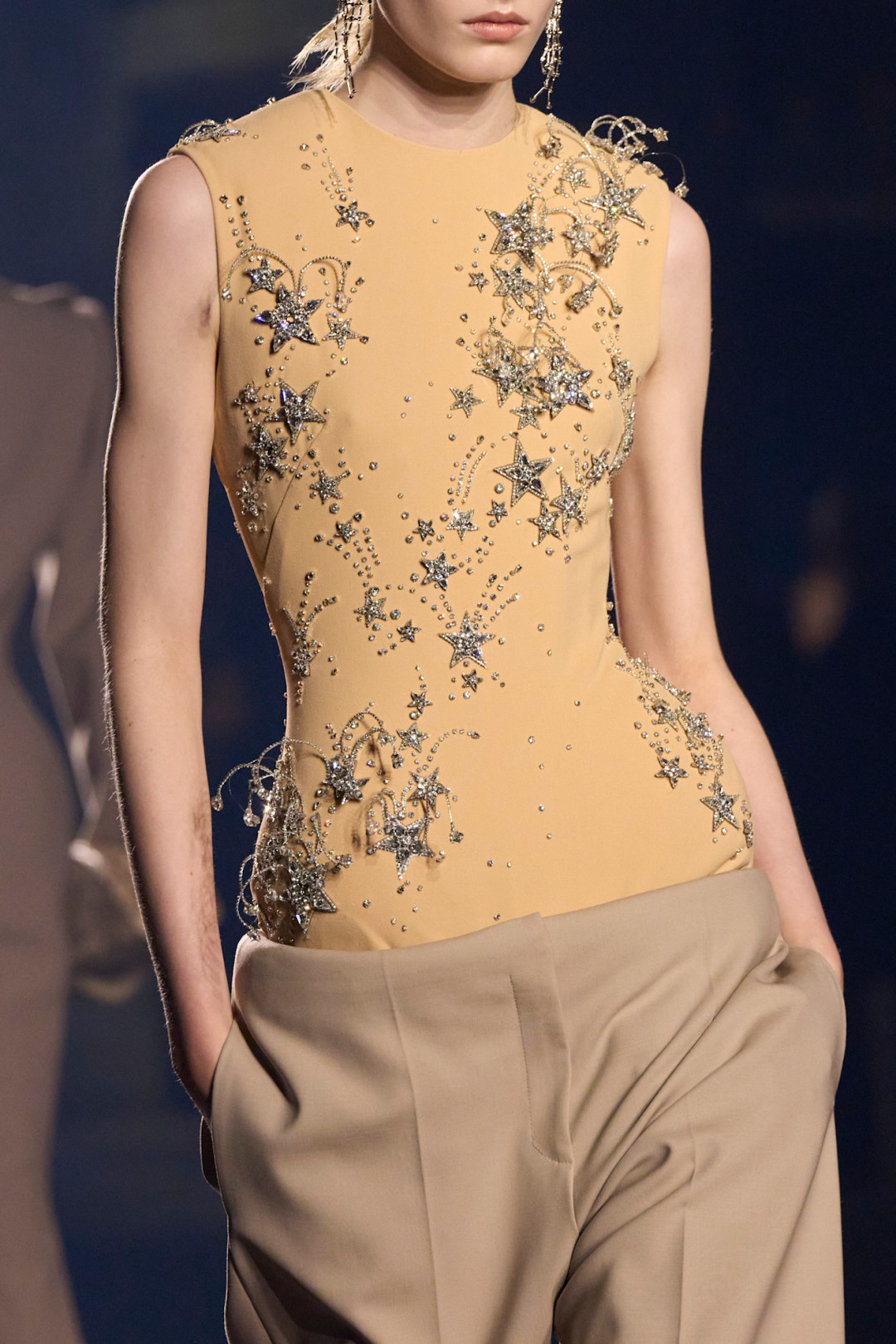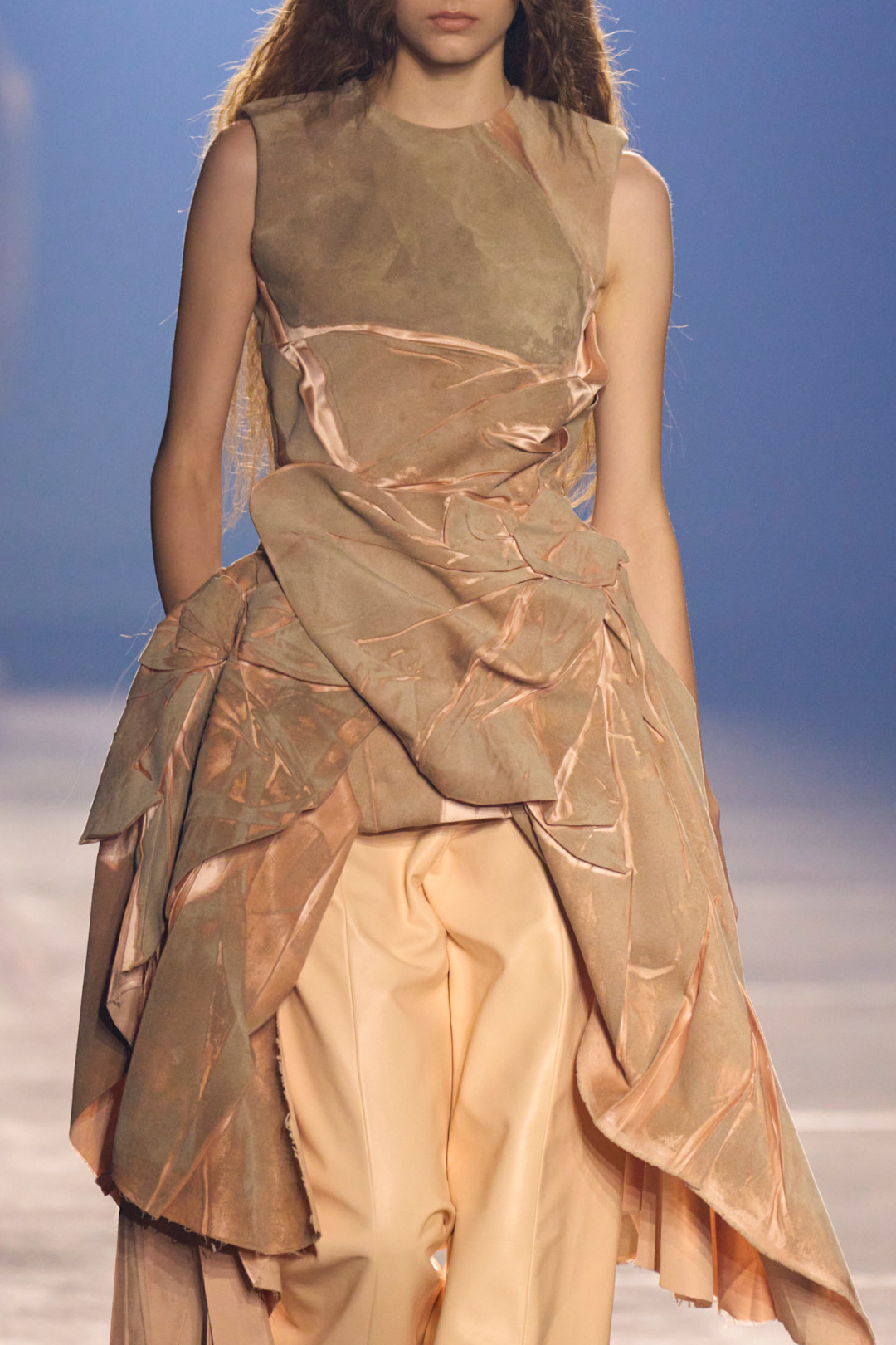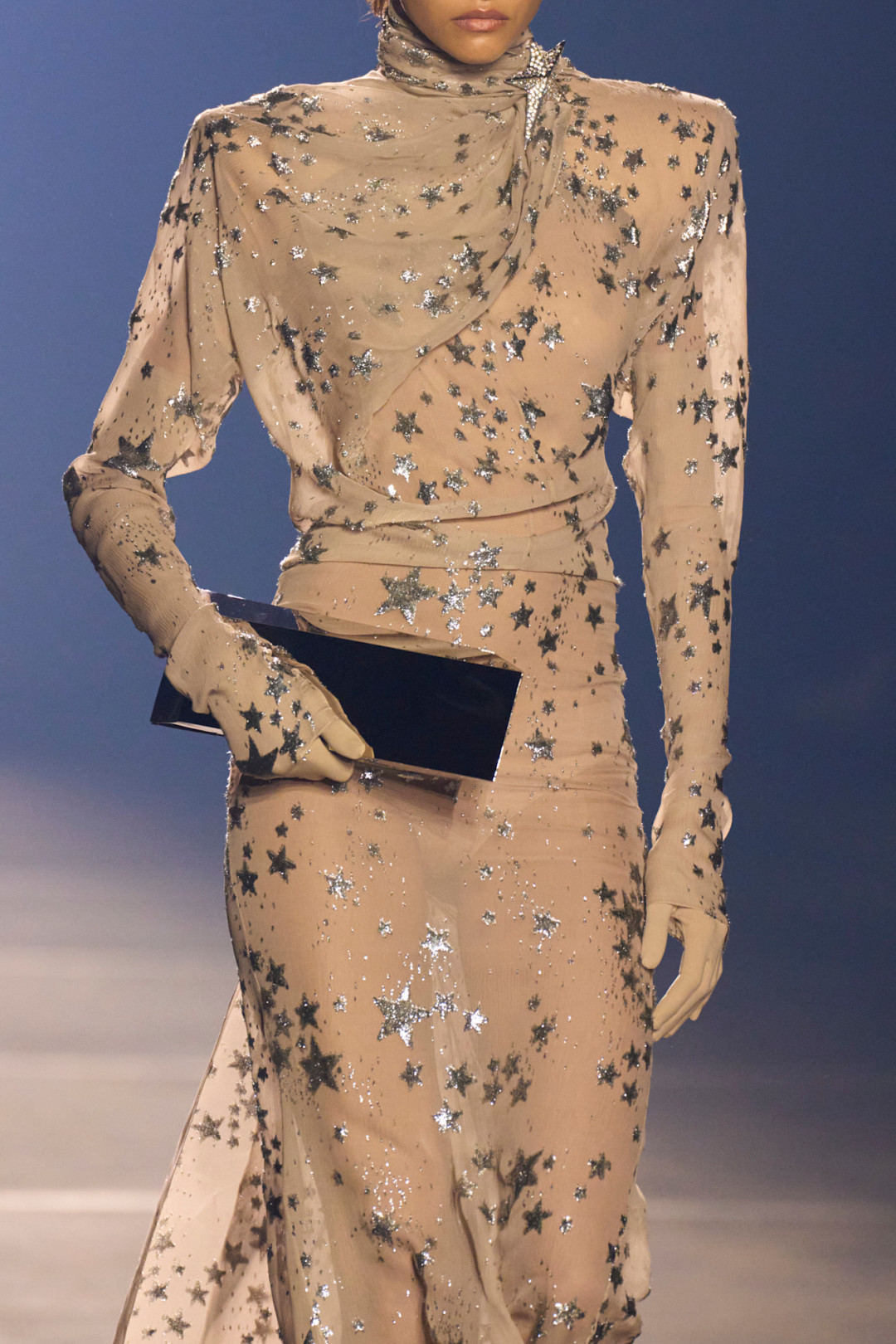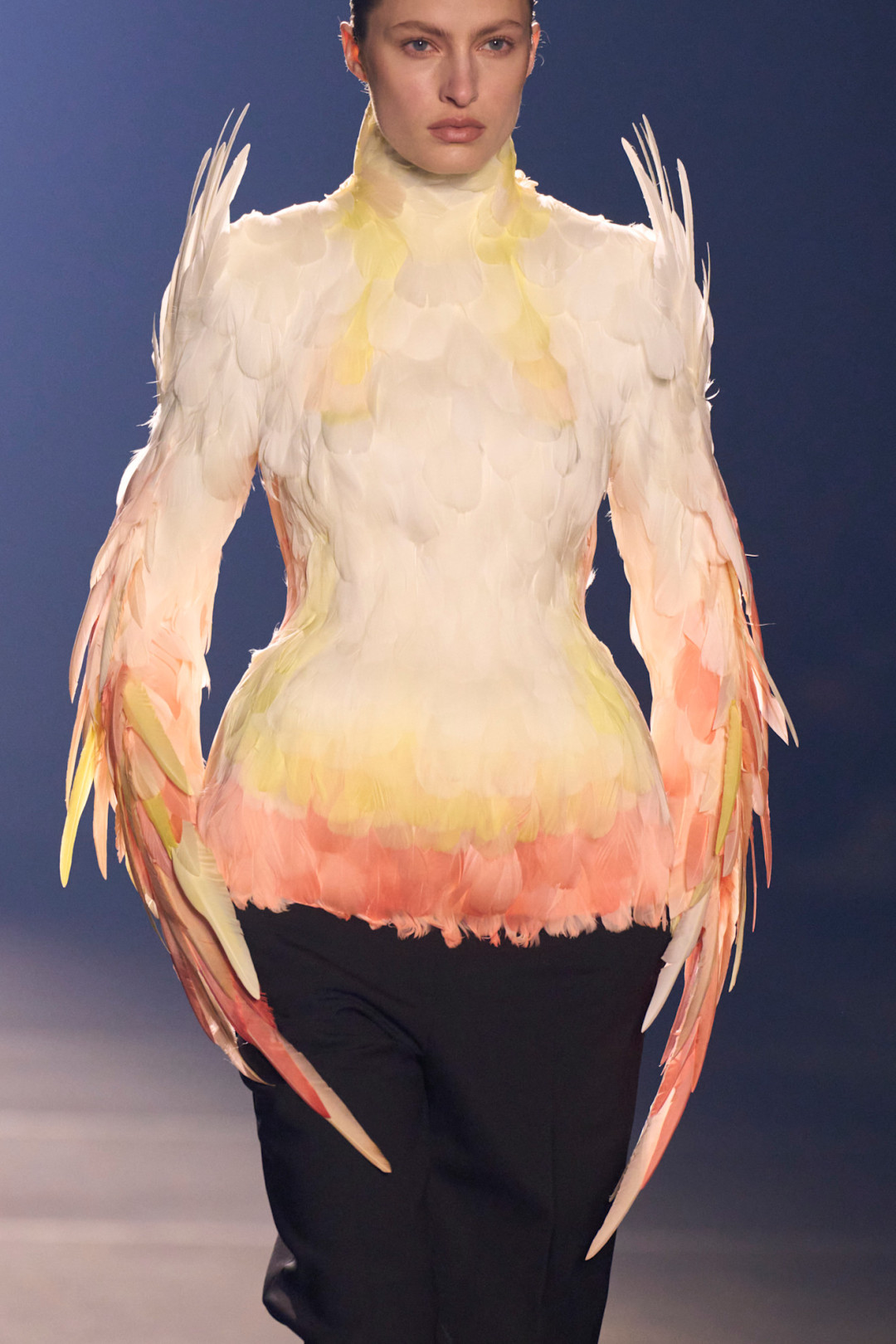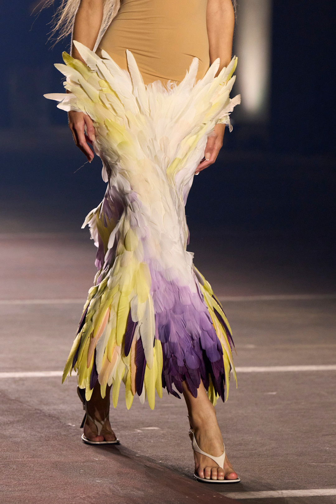 Одни модели демонстрировали блейзеры с экстремально узкой талией, костюмы из золоченой ткани с встроенными перчатками, а другие — силиконовые наряды с утрированными бедрами и полупрозрачные платья с вышивкой звезд, где бретельки свисали с обнаженных пирсингов сосков. Виниловые юбки и классические брюки с низкой посадкой, в свою очередь, соседствовали с телесными боди-чулками, а скульптурные топы с перьями напоминали крылья экзотических птиц.