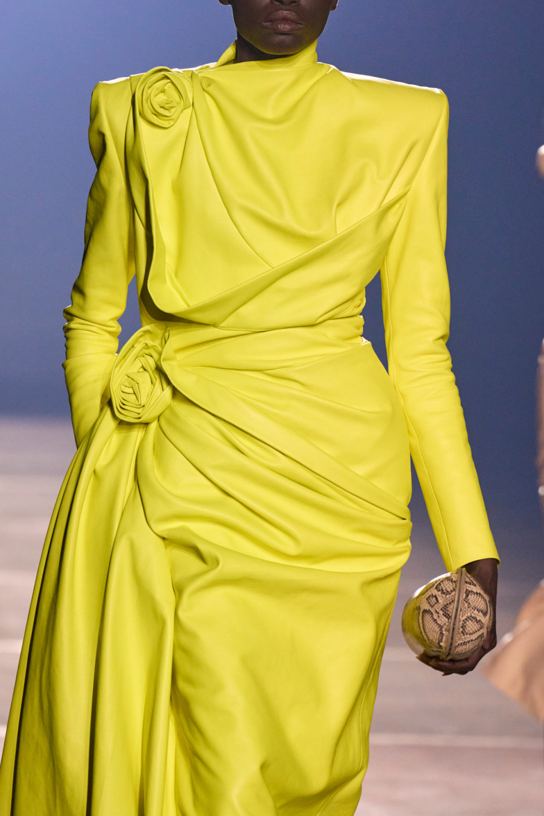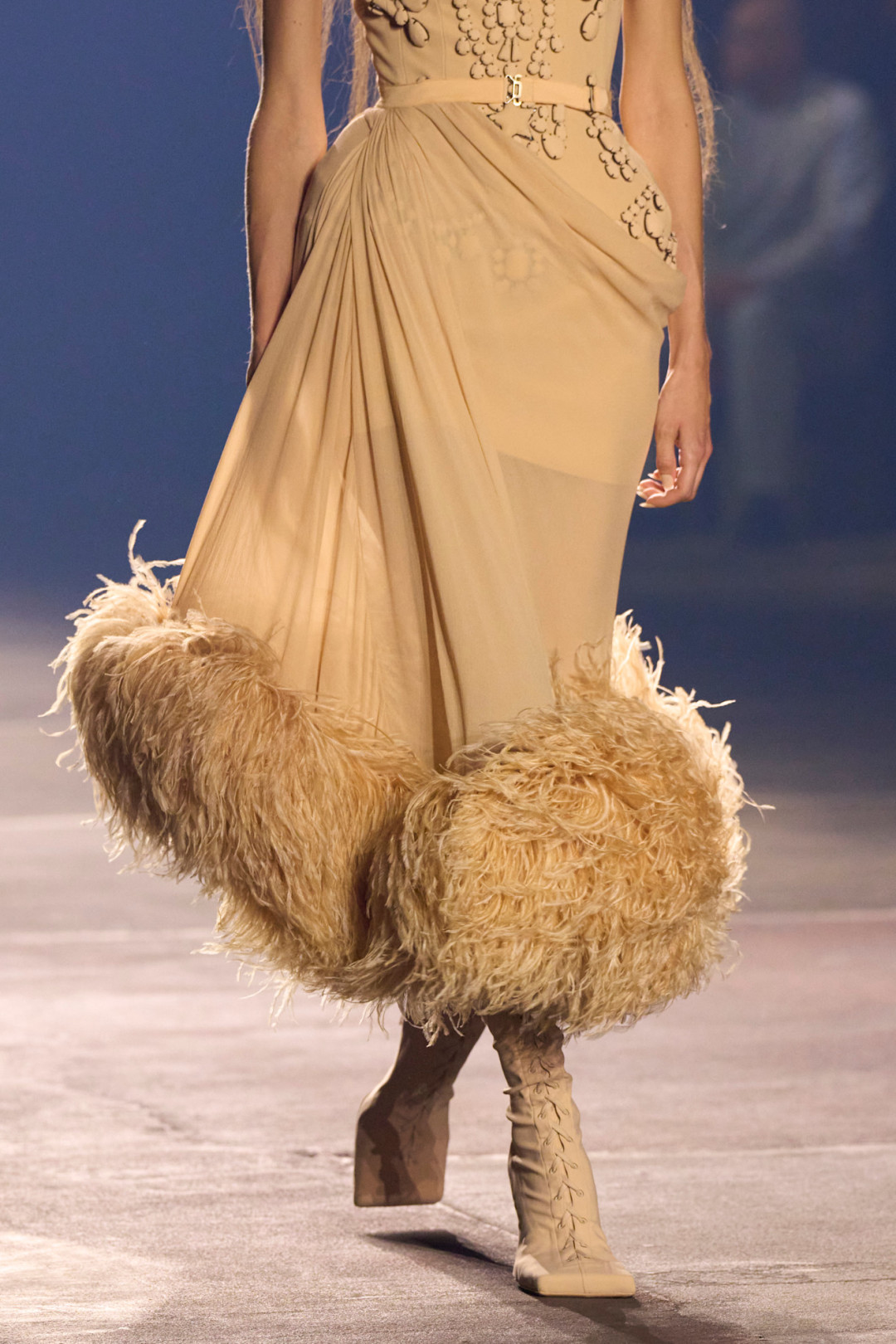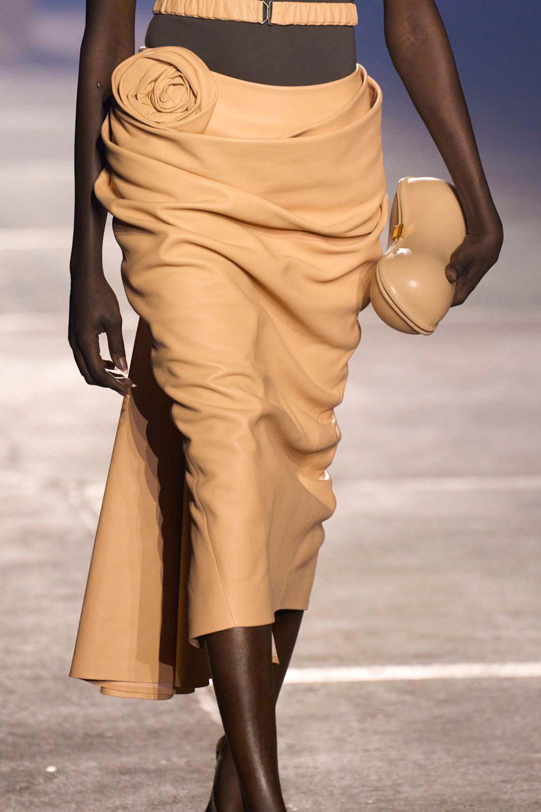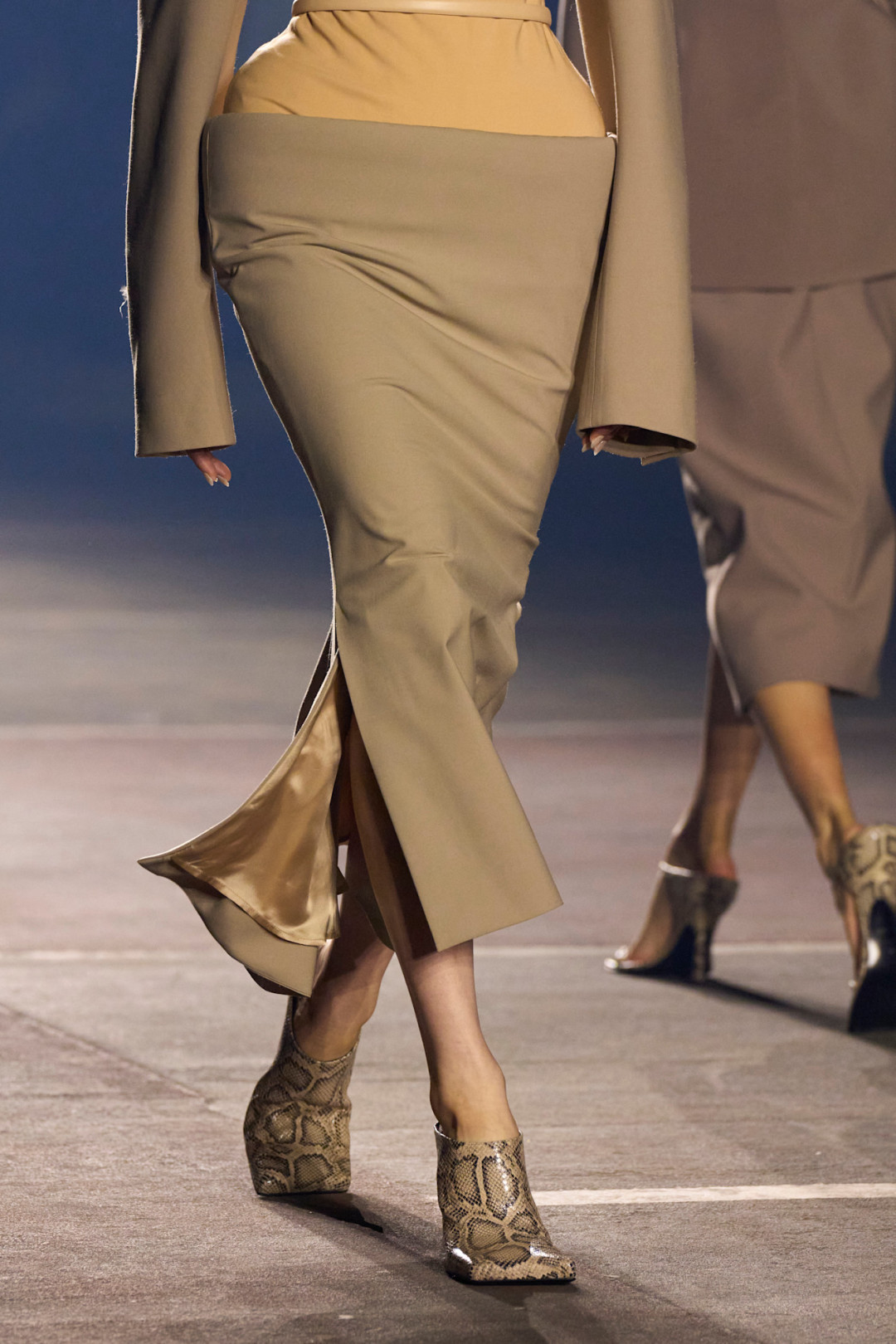 Переходя от холодной чистоты белого к мягким отблескам цитрусовых — мандарина и лимона, — коллекция раскрывалась как тщательно выстроенная гамма эмоций. В ней звучали и спокойные бежевые акценты, напоминающие о наследии Max Mara, где Фрейтас оттачивал свое видение долгие годы. Но здесь он переступил привычные границы, сделав ставку на высший пилотаж мастерства, драматичность и ту самую театральность, которые сделали Mugler культовым.
