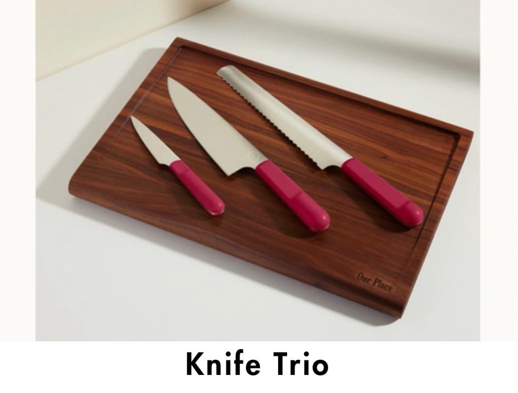 Коллекция также включает в себя трио ножей Our Place, в которое входят нож шеф—повара, зазубренный нож и нож для очистки овощей — в двух новых цветах.