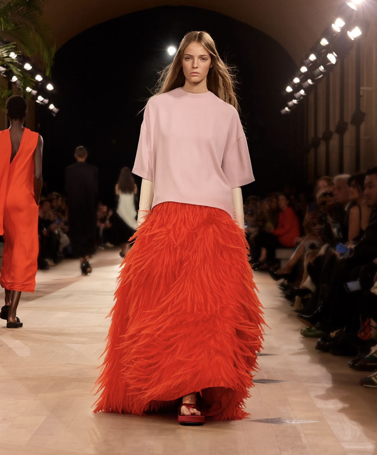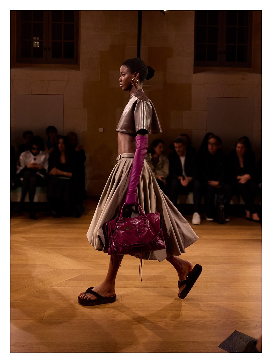 При Демне героиня Balenciaga напоминала подростка с рейва, а теперь она обрела зрелость — уверенную, самостоятельную, но все же дерзкую в мелочах. Днем она выходит на улицу в кожаном кроп-топе, а вечером отправляется на вечеринку у озера Комо в юбке с перьями. Этот контраст и есть суть новой Balenciaga.
