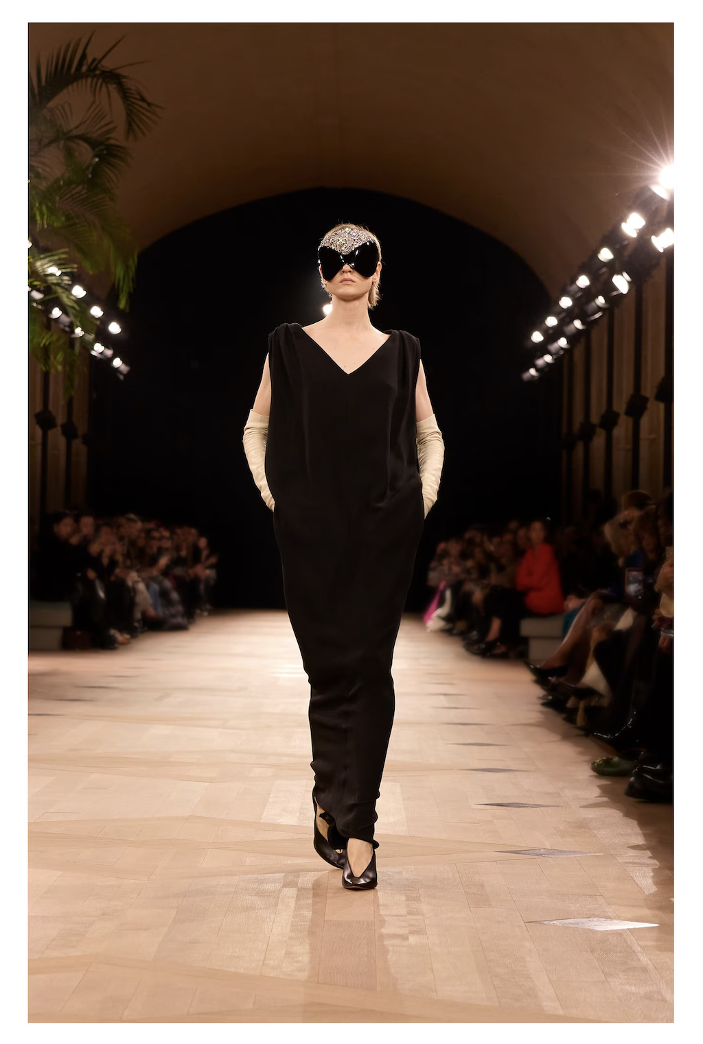 Главный прием Пиччоли — «перекалибровка» архивов. Он не просто цитировал знаковые образы Balenciaga, а перенастраивал их под сегодняшние коды. Так, показ открывало черное платье-мешок — прямая отсылка к революционному Sack Dress 1957 года (ставшему вызовом Dior New Look), дополненное белыми перчатками и очками с инкрустацией. «Это платье так актуально и так важно, потому что оно освободило женщин от ограничений», — объяснил свой выбор позднее дизайнер за кулисами.