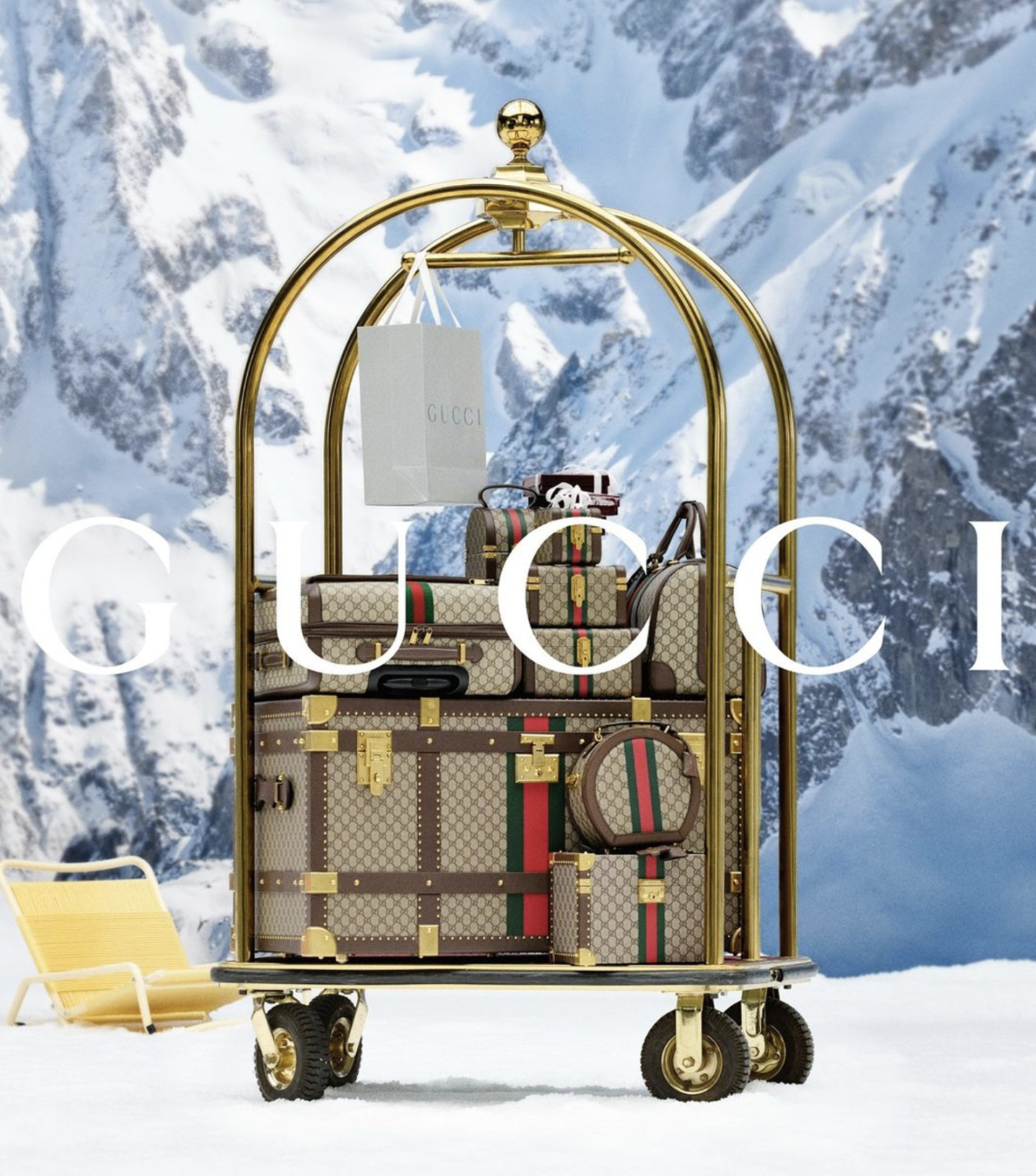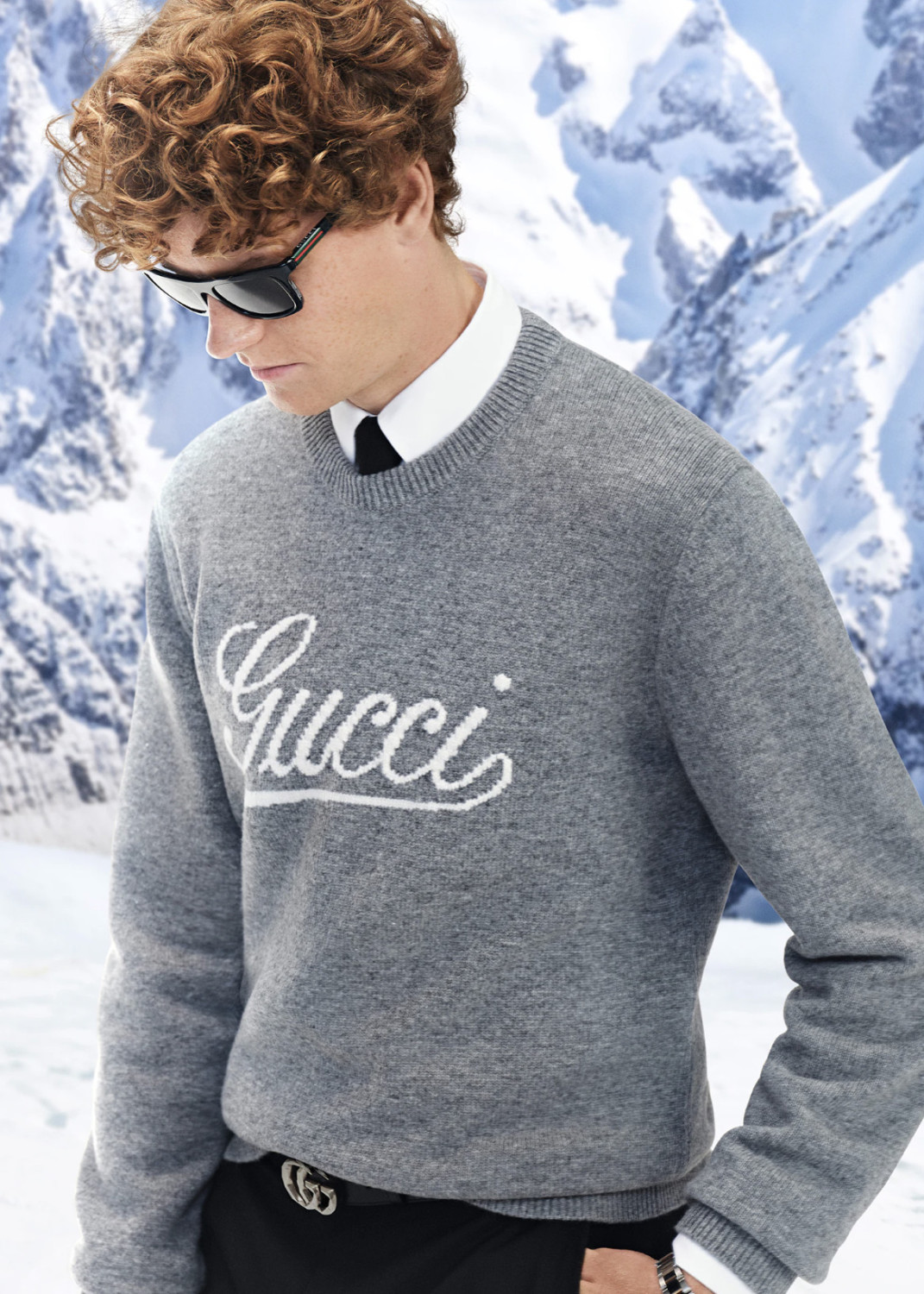 На фоне покрытых снегом гор дуэт наслаждается атмосферой умиротворения и предвкушения, представляя сезонные новинки — от верхней одежды до кроссовок Gucci Re-Web с кристаллами и золотых украшений. Кендалл позирует в костюме GG Monogram, украшенном кристаллами, дополняя образ новой сумкой GG Marmont, а Янник — в трикотажном свитере и с серебристой дорожной сумкой GG Monogram.