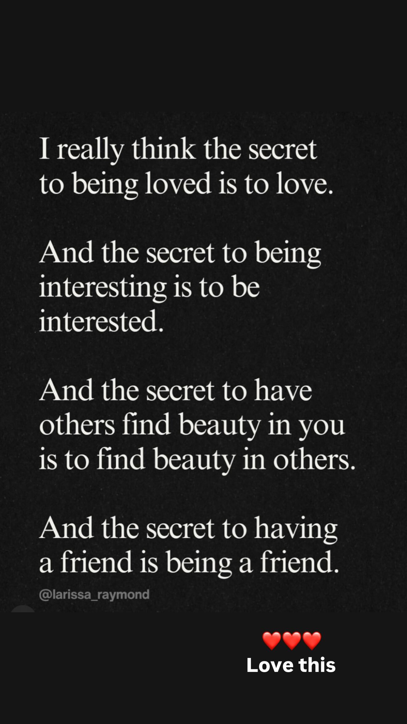 «Я действительно думаю, что секрет того, чтобы быть любимым, — это любить. А секрет того, чтобы быть интересным, — это быть заинтересованным. А секрет того, чтобы другие находили в вас красоту, — это находить красоту в других. А секрет того, чтобы иметь друга, — это быть другом»,