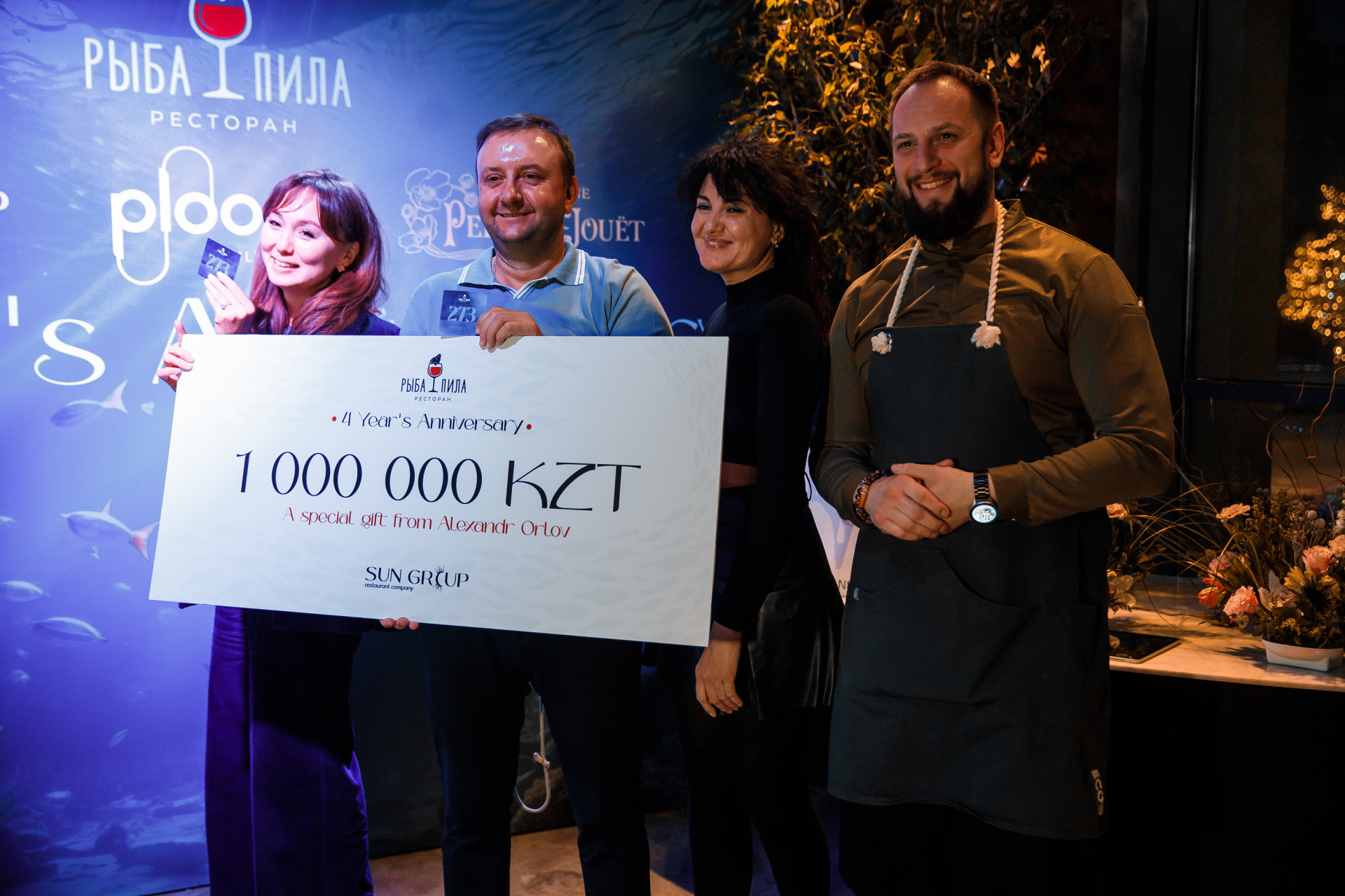 Праздник не обошелся без сюрпризов от ресторана и партнеров: среди гостей разыграли ценные призы, включая карты лояльности от модного дома Shoqan, выездной ужин от шефа, шиша-вечеринку и главный подарок — сертификат на 1 000 000 тенге в проекты холдинга Sun Group от генерального партнера Александра Орлова.