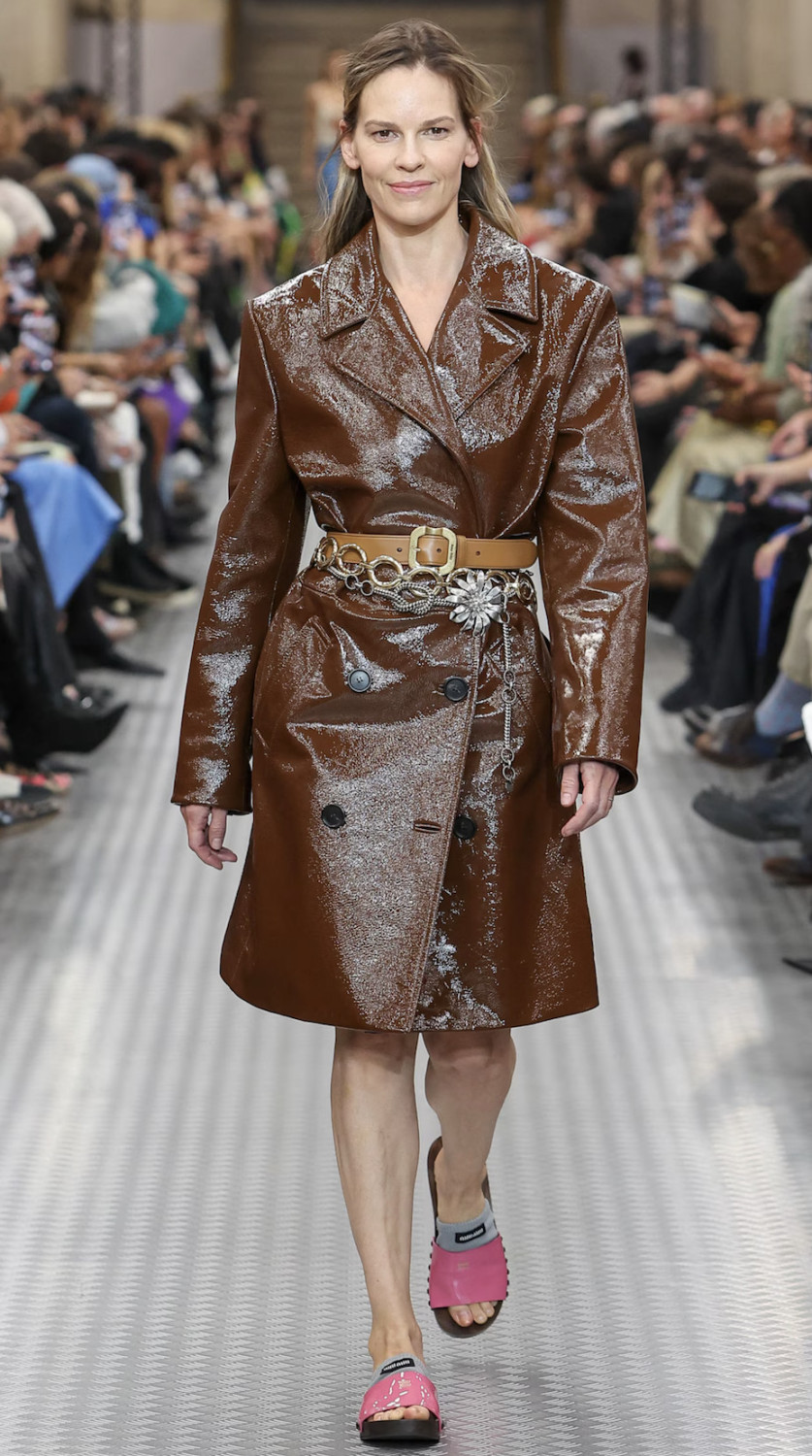 50-летняя Суонк блистала в коричневом кожаном пальто с акцентом на широкие плечи, которое гармонично сочеталось с многослойными поясами и спортивными розовыми сандалиями. Дефо, в свою очередь, стал завершающим аккордом шоу, выйдя на подиум в элегантном темно-синем пальто и серых брюках, отражающих дух Miu Miu.