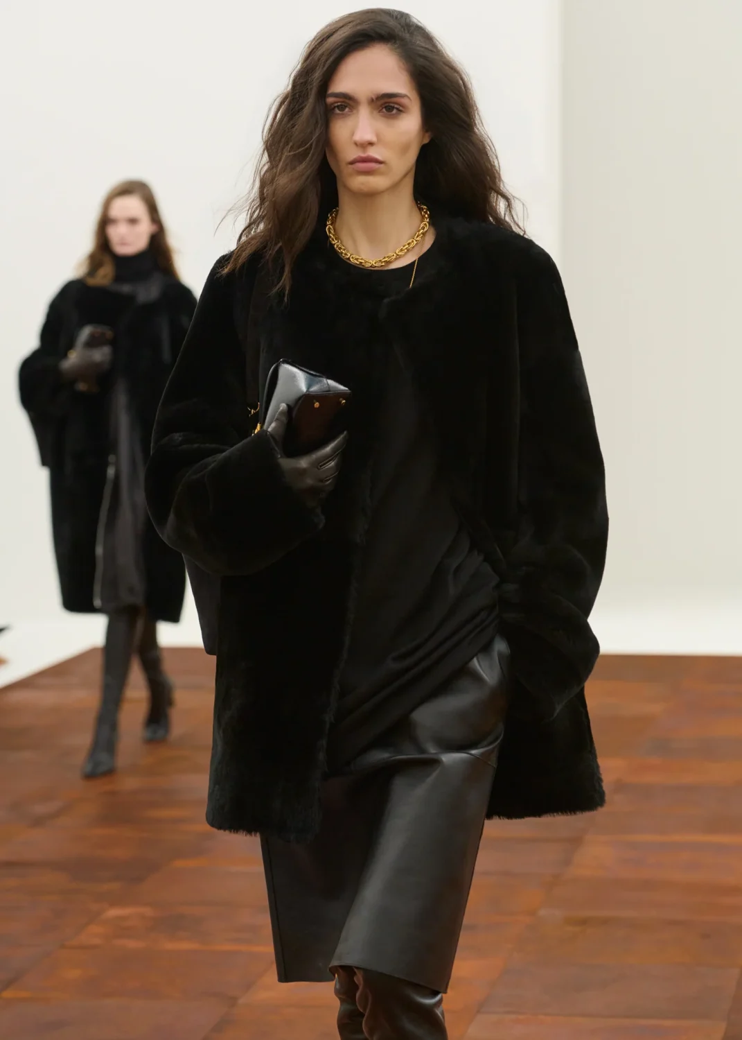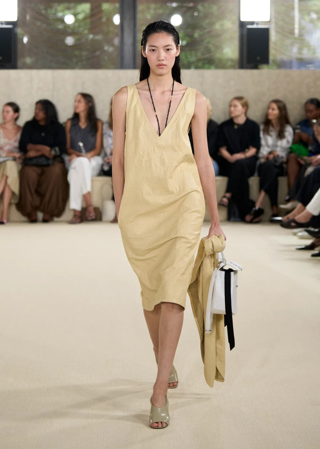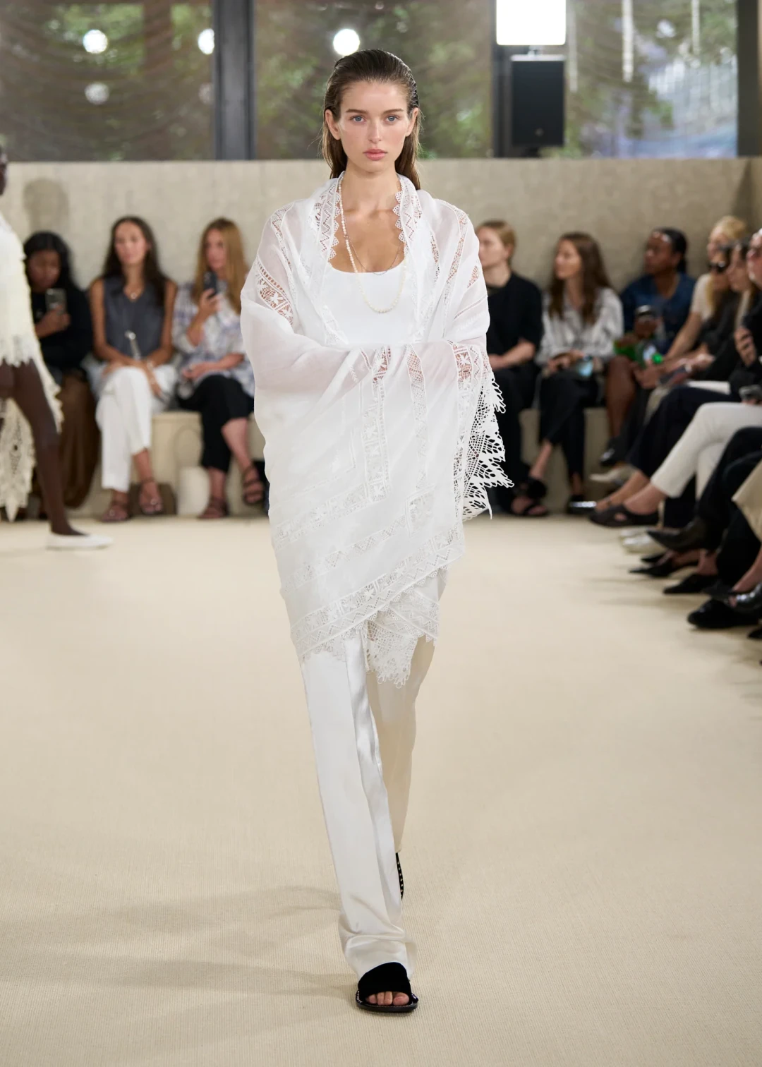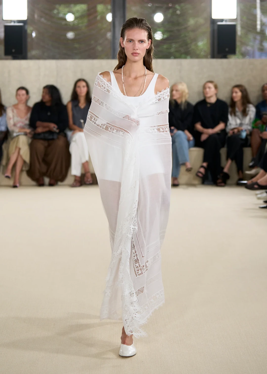 Стоит отметить, что Эллин Клин впервые заговорила о мечте развивать swim-направление, и новая коллекция Toteme ощущается как нежный тизер этой будущей линии. В финале показа появились боди, купальники и накидки из шведского кружева, будто только что вынутые из холодных волн Скандинавии.