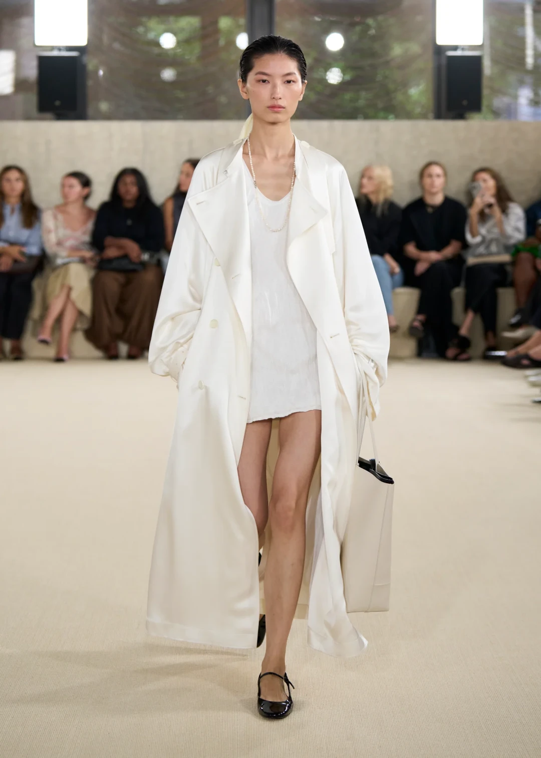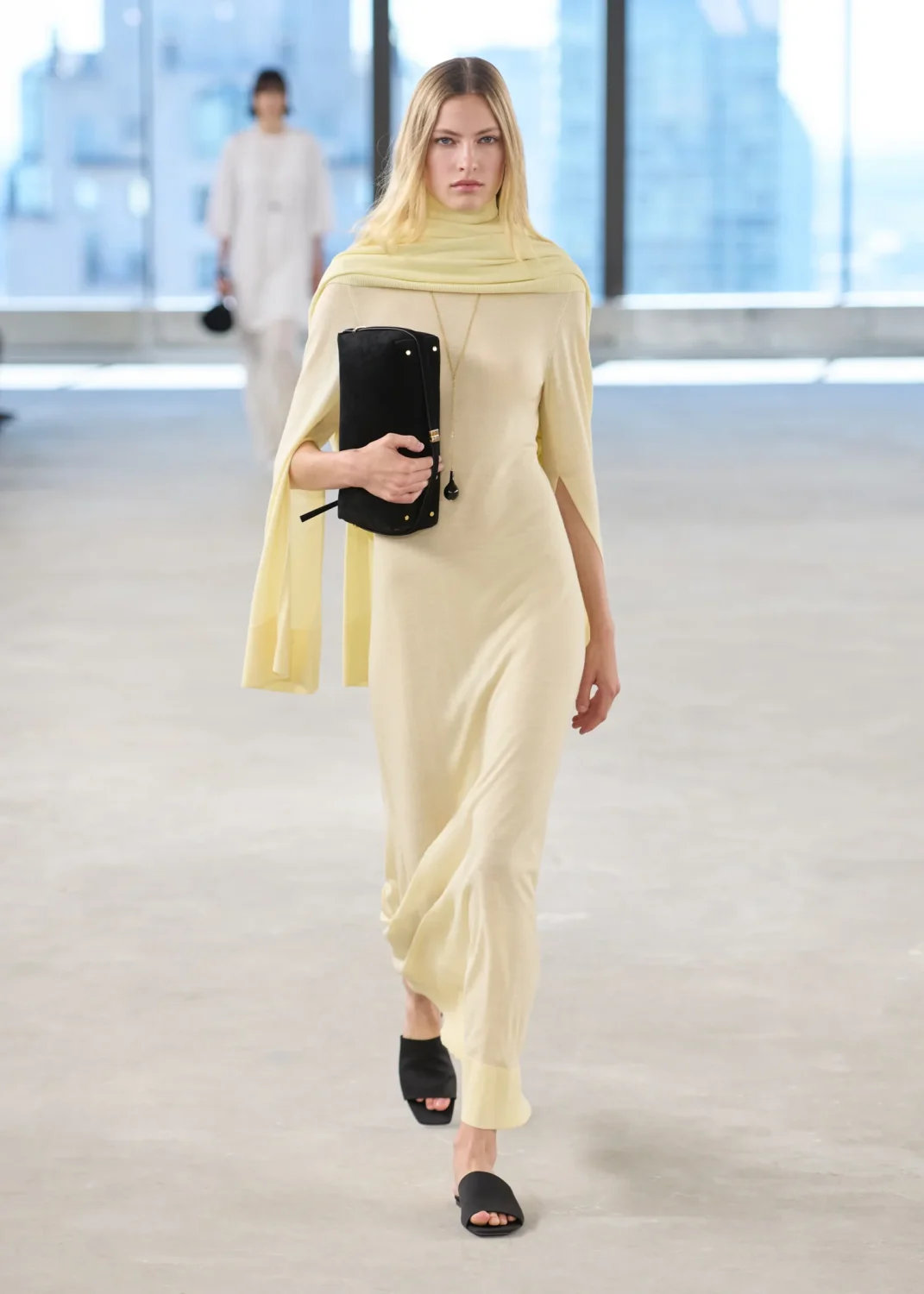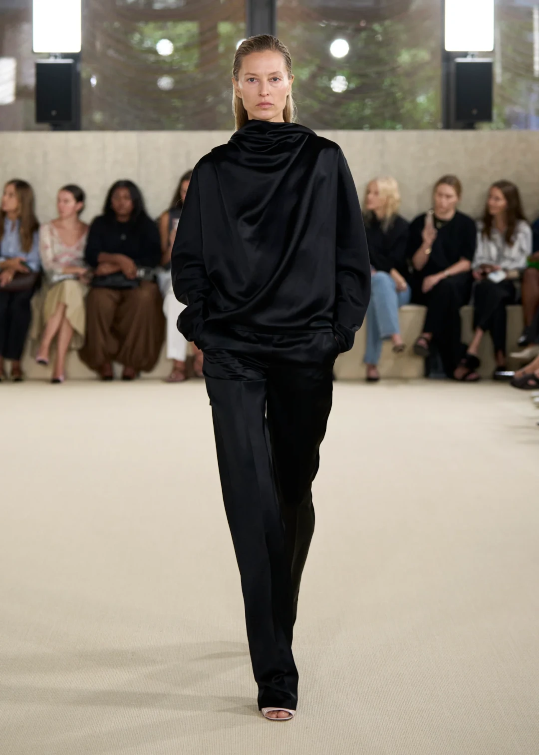 В этом сезоне Toteme с коллекцией SS ’26 пригласили нас в тишину. Ту самую, где слышен каждый шорох, где взгляд замедляется и останавливается на деталях. Элин Клин и Карл Линдман — скандинавский дуэт, основавший бренд в 2014 году — показали, что минимализм — это не отказ от цвета, а особый способ видеть. Черно-белая гамма коллекции звучала громче любых оттенков, заставляя всматриваться в пропорции, фактуру, в то, как свет медленно скользит по складкам ткани. И именно это внимание к нюансам становилось важнее самой вещи.