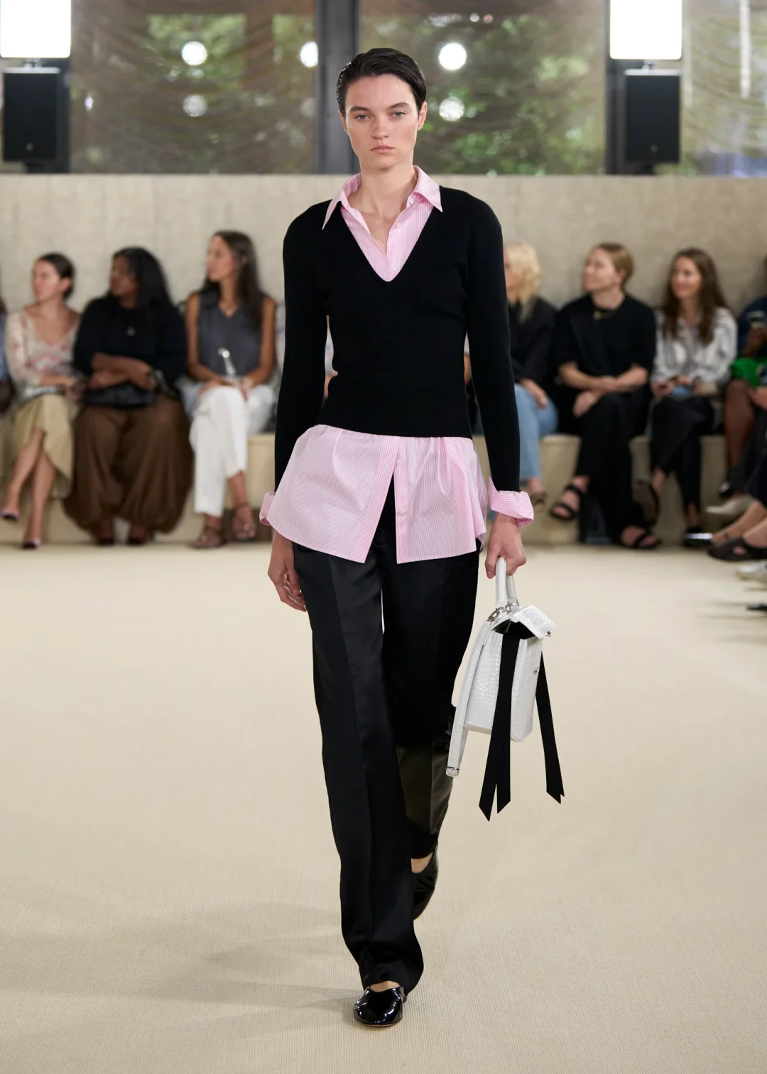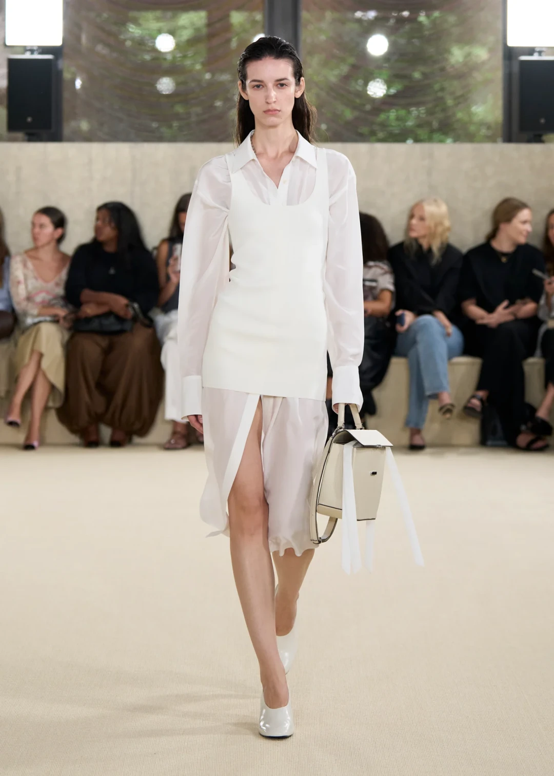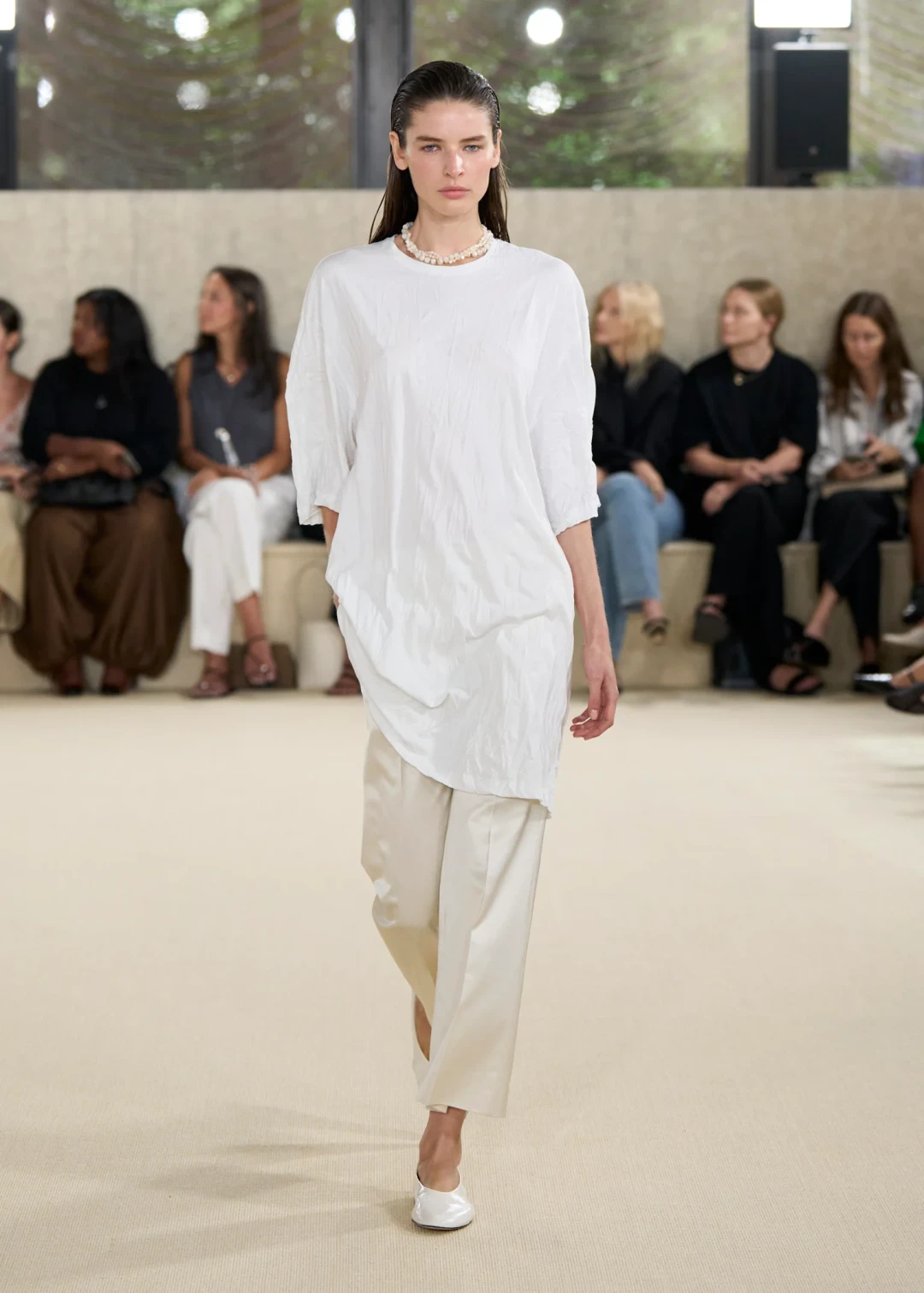 Чуть прозрачный, слегка помятый, с небрежно спущенным плечом и дополнительным слоем под низом — белый топ, открывший показ, выглядел как продуманная случайность. Это был образ, который хотелось разглядывать, словно он только что сошел с кинопленки. Та же легкость прослеживалась и в других нарядах. Одни модели демонстрировали oversize-футболки поверх строгих плиссированных брюк или укороченные тренчи, другие — рубашки, превращенные в платья, и шорты, выглядывающие из-под полу расстегнутых подолов. Казалось, одежда сама по себе двигалась, готовая в любую секунду соскользнуть с тела, и именно в этой хрупкости заключалась ее красота.