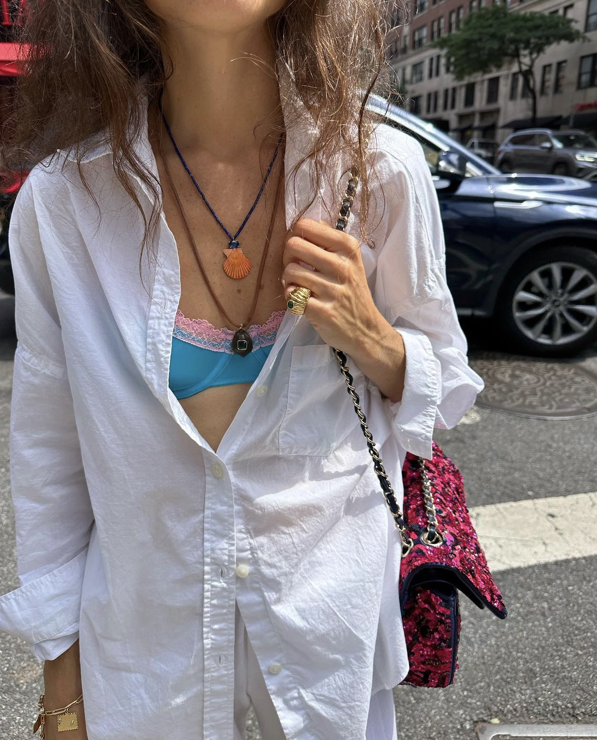 Модница из Нью-Йорка Леандра Медин — та еще бунтарка. В последней fashion-рассылке девушка предложила под классический костюм из льна надеть нижнее белье яркого цвета с кружевом. Она уверена, что такую красоту скрывать нельзя. Расстегиваем верхние пуговицы — образ на грани игривости и сдержанности готов!