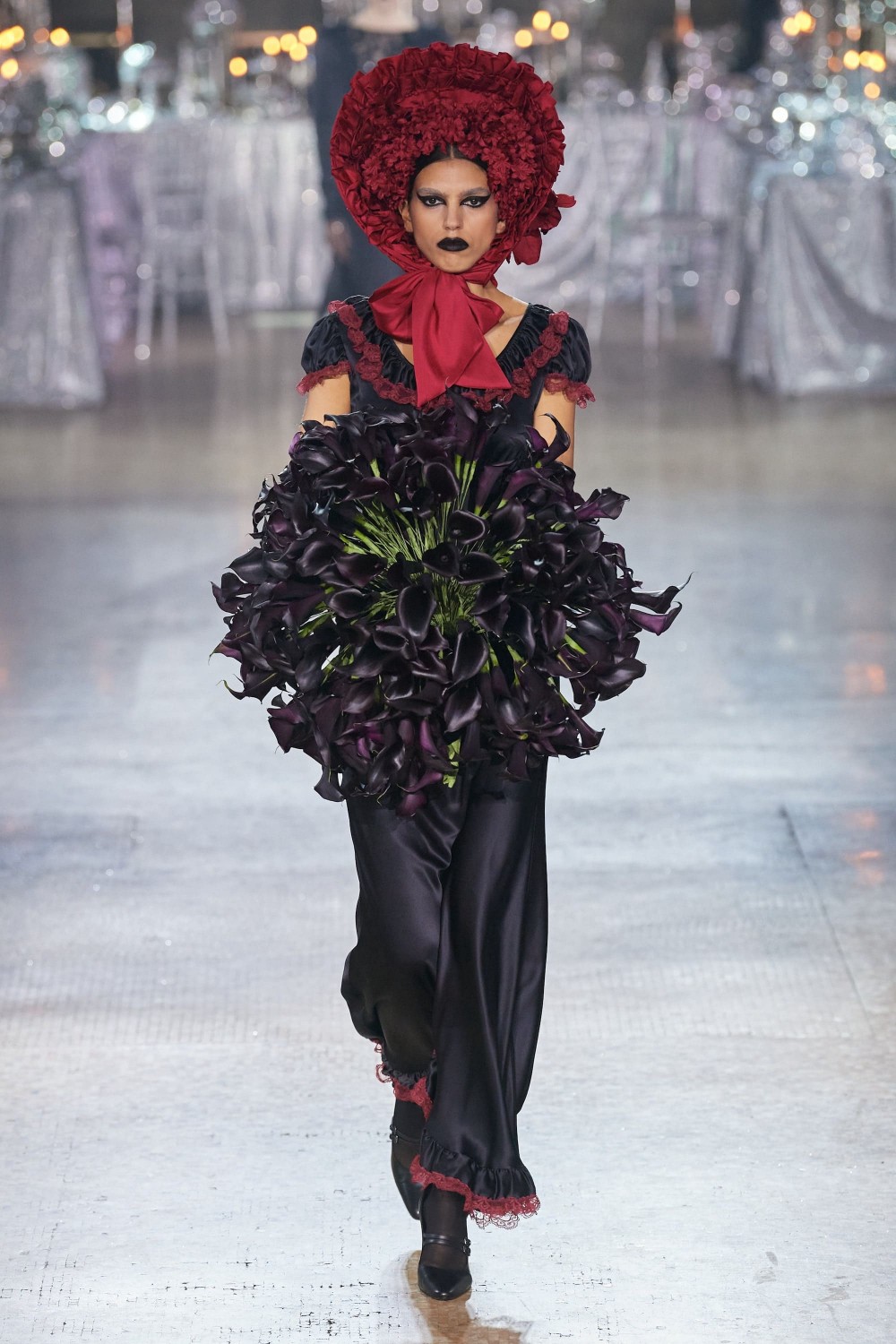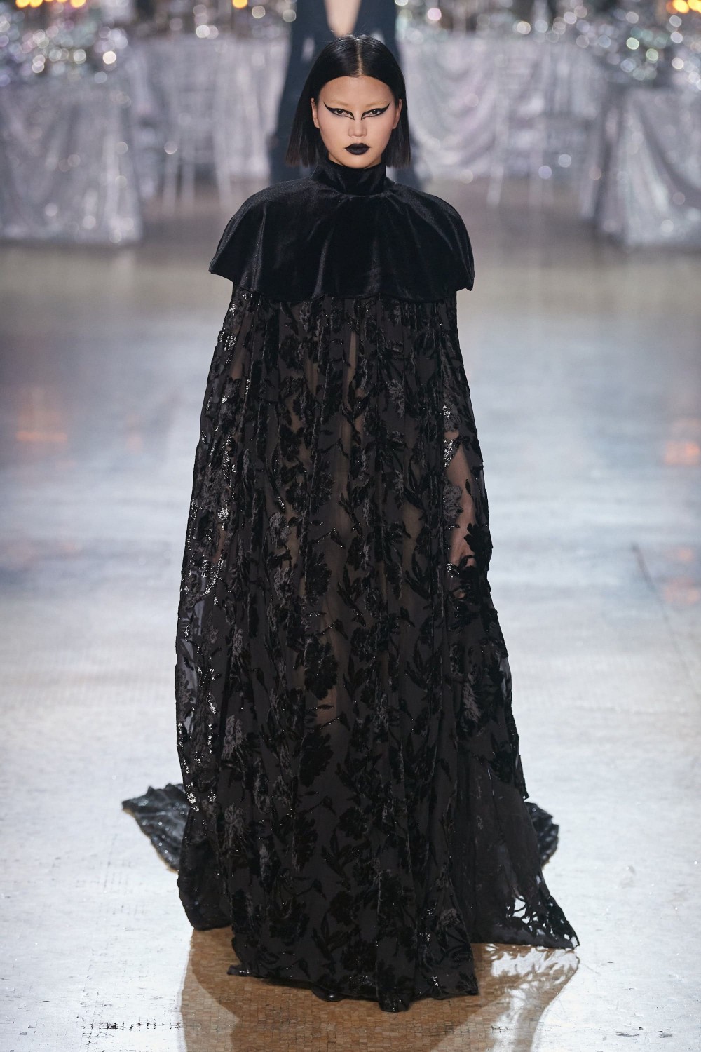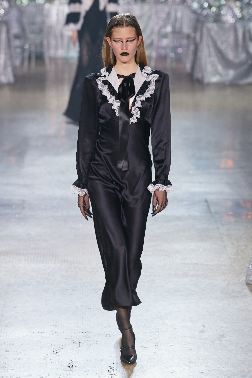 Rodarte открыли Неделю моды, представив готическую лесную сказку: образы преимущественно в темных тонах, экстравагантный макияж и некоторая мрачность. Удлиненные рукава напомнили нам стилистику Мортиши Аддамс, а шляпы с оборками и кружевные мантии – наряды середины XIX-го века. В коллекции присутствовали и оригинальные принты в виде фей, которые были помещены на развевающиеся шелковые платья. Образы также были дополнены серебряными волшебными ушами, коронами и изысканными головными уборами — они идеально дополняли повествование о ночной сказке. Отдельного внимания заслуживают платья, полностью выполненные из металлической бахромы. Именно они привнесли в коллекцию эффект причудливости и погрузили в мир фантазий.