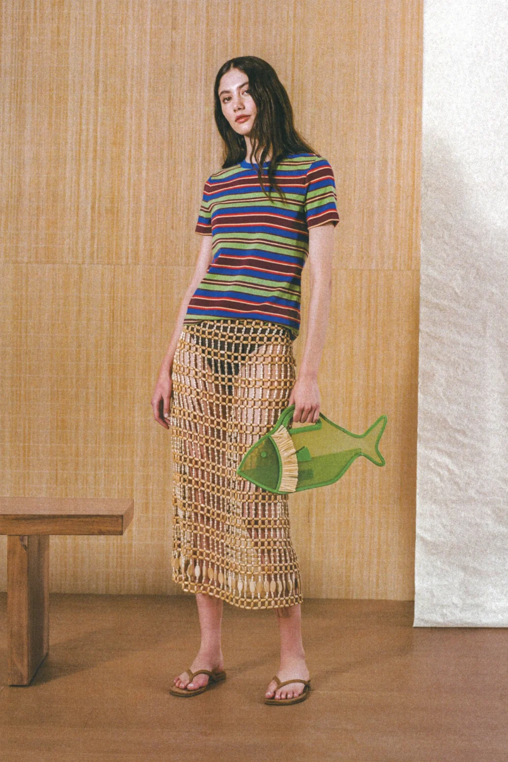 Каждый элемент коллекции — от полосатой футболки, надетой поверх бикини, до макраме-юбки и брюк с кружевной отделкой — погружает в атмосферу беззаботного отдыха в летнюю пору и приглашает к самовыражению. Отдельного внимания заслуживают забавные сумки в форме рыбок Pesce, выполненные из ПВХ и рафии.