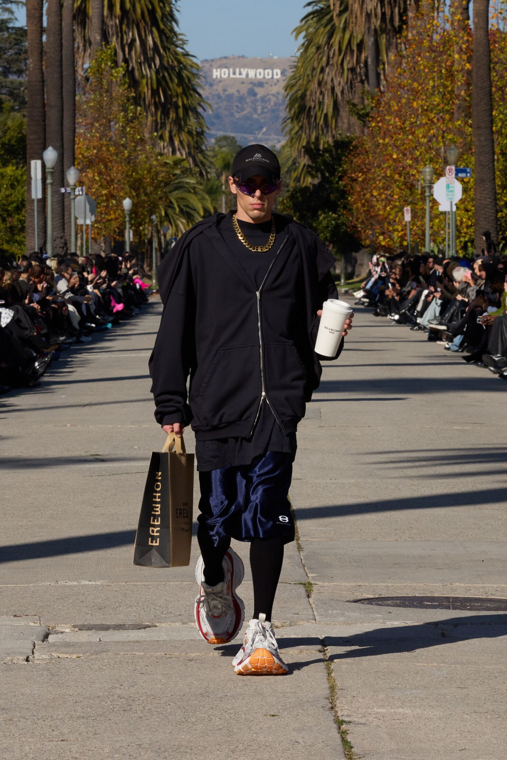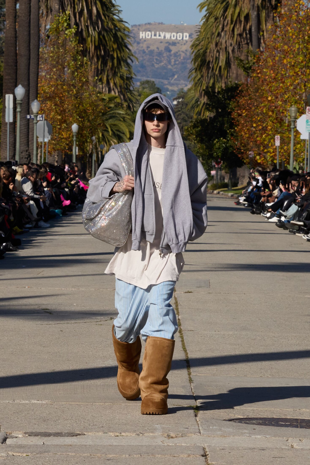 «Это мой любимый город. Все мое культурное образование в подростковом возрасте, когда я рос в постсоветском вакууме, пришло отсюда. Из фильмов и музыки. Я хотел показать всю многогранность того, что представляет для меня Лос-Анджелес», — заявил дизайнер перед шоу. Открыли показ наряды, вдохновленные стереотипным образом жизни в Лос-Анджелесе. Толстовки, наброшенные на куртки-бомберы, шорты с ожерельями из золотых цепочек и торчащие стринги из-под поясов спортивных костюмов — все они также отсылали к фотографиям папарацци из гламурной эпохи Y2K.