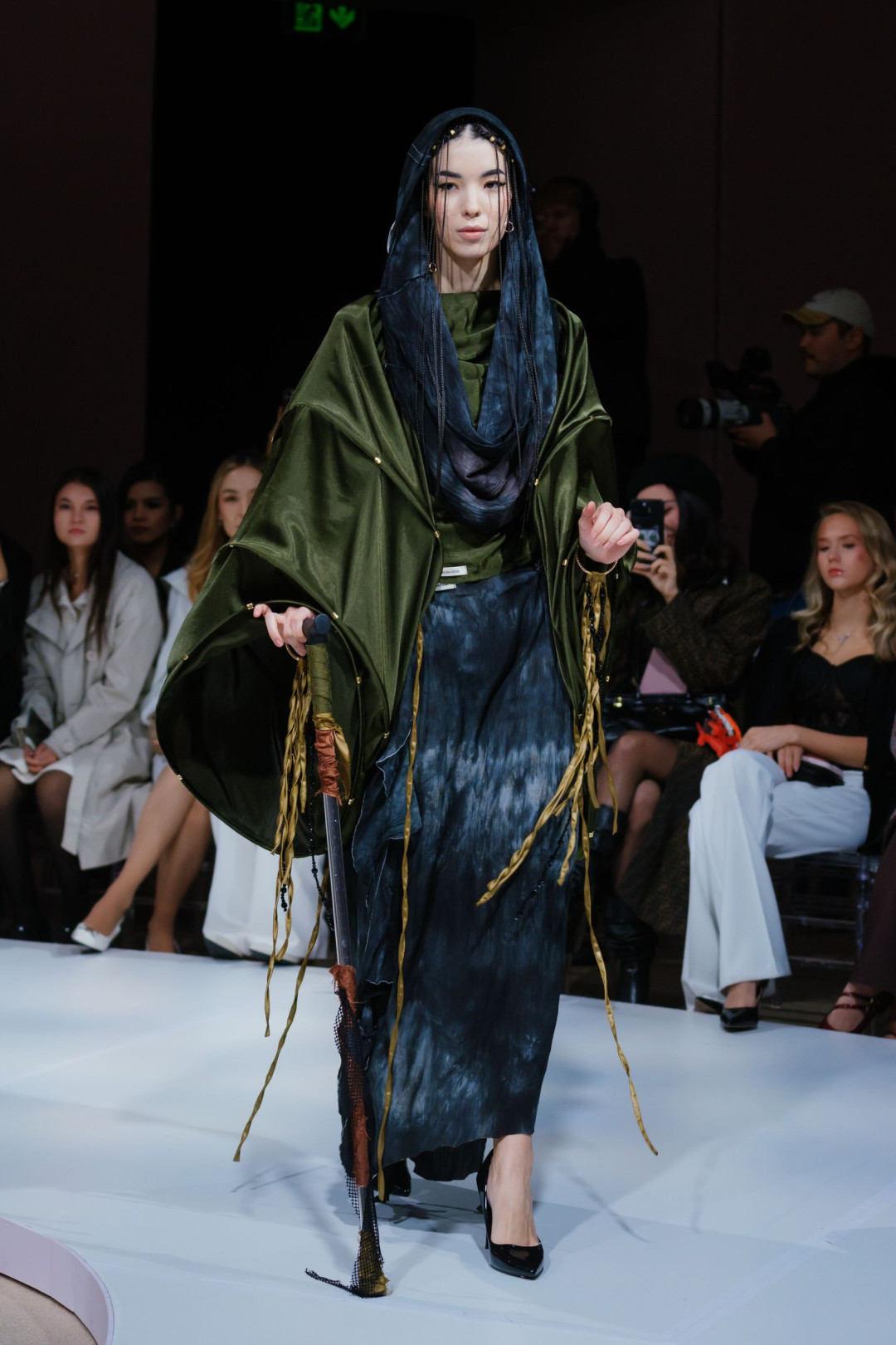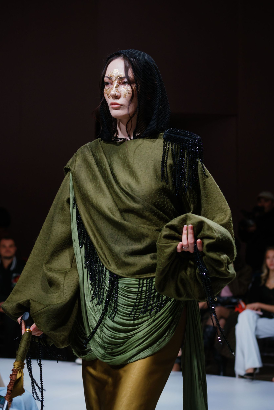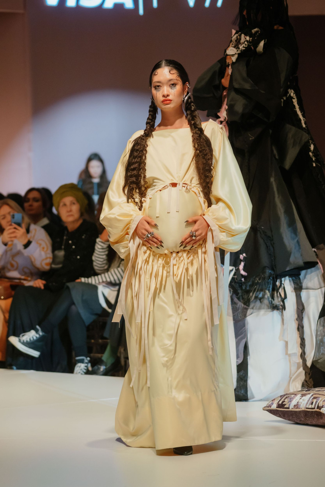 Следом свою коллекцию представил Zhalt Zhult, победитель Next Designer Award Empowered by Visa. Свет приглушился, музыка обрела напряженность — и на подиум вышли модели в длинных темных одеяниях с нашивками рук и луны. Эти первые выходы определили настроение показа — собранное, драматичное, полное памяти и скрытой тревоги.