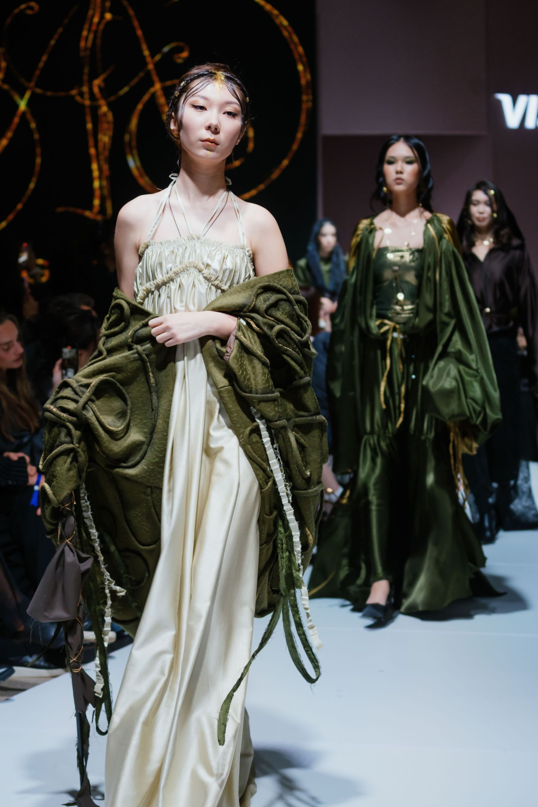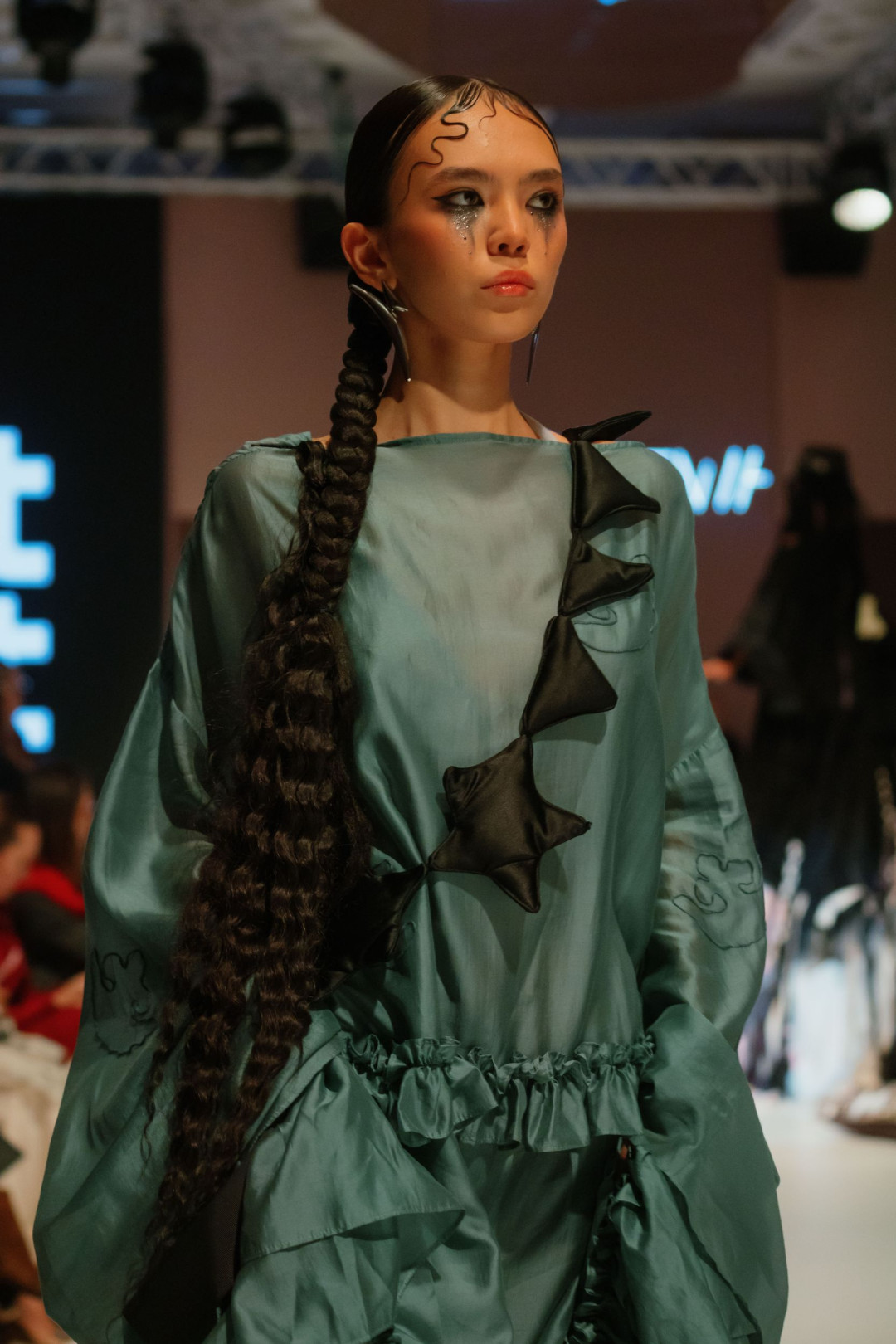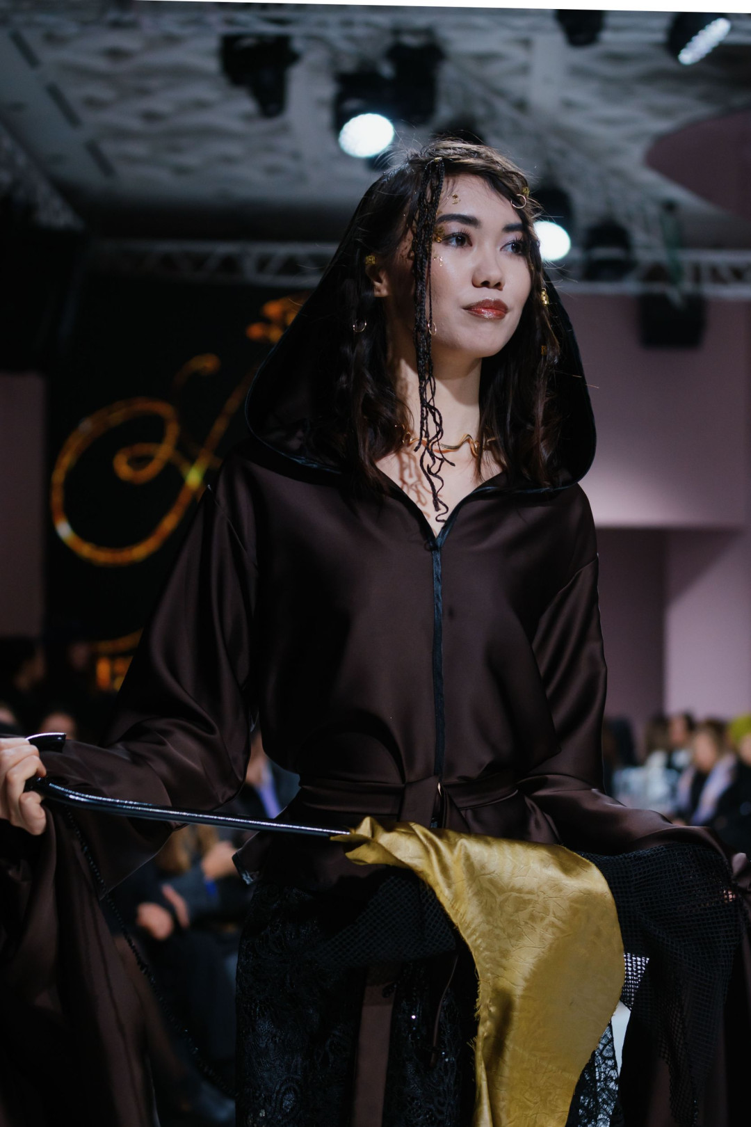 Следом свою коллекцию представил Zhalt Zhult, победитель Next Designer Award Empowered by Visa. Свет приглушился, музыка обрела напряженность — и на подиум вышли модели в длинных темных одеяниях с нашивками рук и луны. Эти первые выходы определили настроение показа — собранное, драматичное, полное памяти и скрытой тревоги.