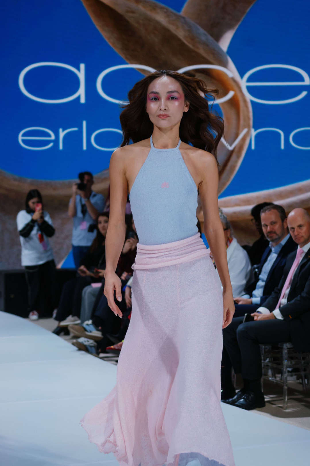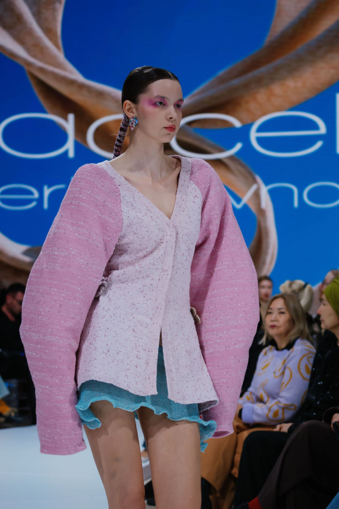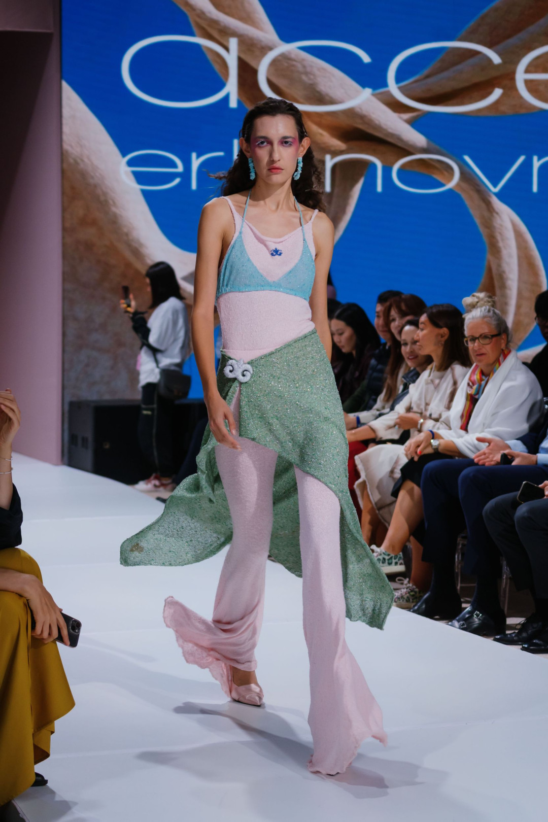Коллекция «Желең», представленная на VFW Almaty, стала доказательством того, что трикотаж способен говорить на языке роскоши — и далеко не только в привычном «уютном» контексте. Асель вдохновилась духом 2000-х — эпохи блеска, дерзости и смелых экспериментов, — но не стала воспроизводить ее буквально. Она извлекла из прошлого легкость и игривость и перевела их в современные формы. Брюки-клеш из розового трикотажа вытягивали силуэт и соседствовали с асимметричными накидками цвета морской пены. Мини-юбки сочетались с удлиненными кардиганами на одной пуговице, превращая привычную вещь в кокетливый жест. А прозрачные платья в духе «второй кожи» создавали иллюзию хрупкости — той самой, за которой всегда скрывается безупречная уверенность.
