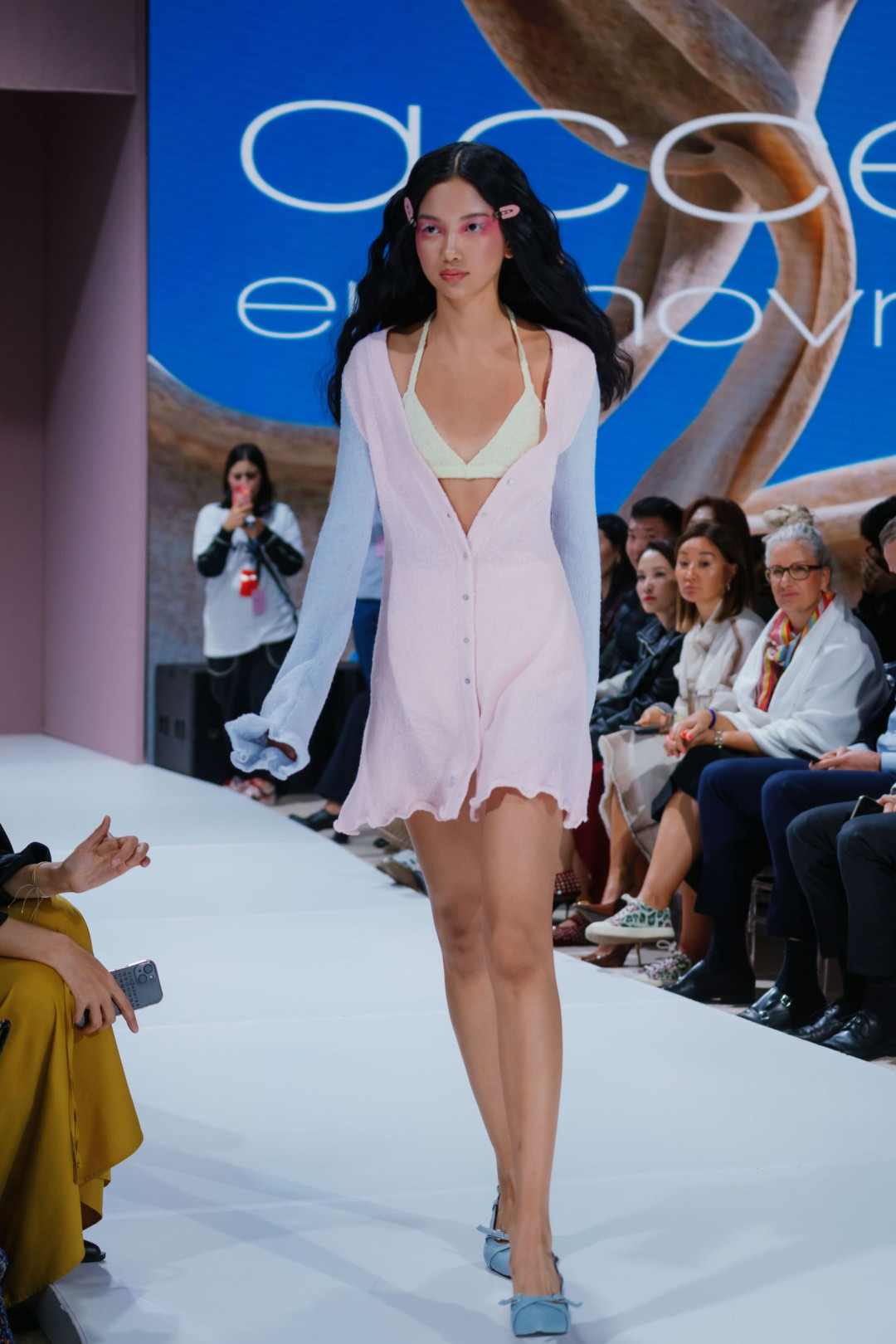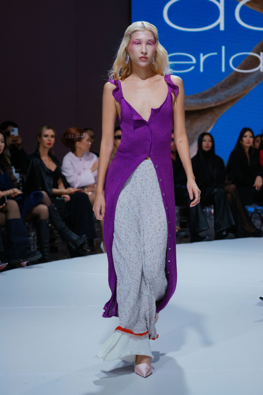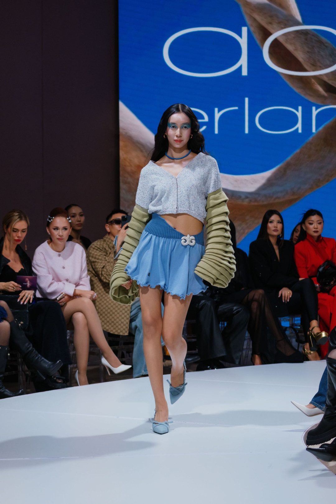 Коллекция «Желең», представленная на VFW Almaty, стала доказательством того, что трикотаж способен говорить на языке роскоши — и далеко не только в привычном «уютном» контексте. Асель вдохновилась духом 2000-х — эпохи блеска, дерзости и смелых экспериментов, — но не стала воспроизводить ее буквально. Она извлекла из прошлого легкость и игривость и перевела их в современные формы. Брюки-клеш из розового трикотажа вытягивали силуэт и соседствовали с асимметричными накидками цвета морской пены. Мини-юбки сочетались с удлиненными кардиганами на одной пуговице, превращая привычную вещь в кокетливый жест. А прозрачные платья в духе «второй кожи» создавали иллюзию хрупкости — той самой, за которой всегда скрывается безупречная уверенность.