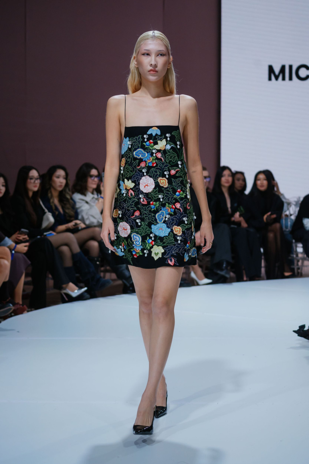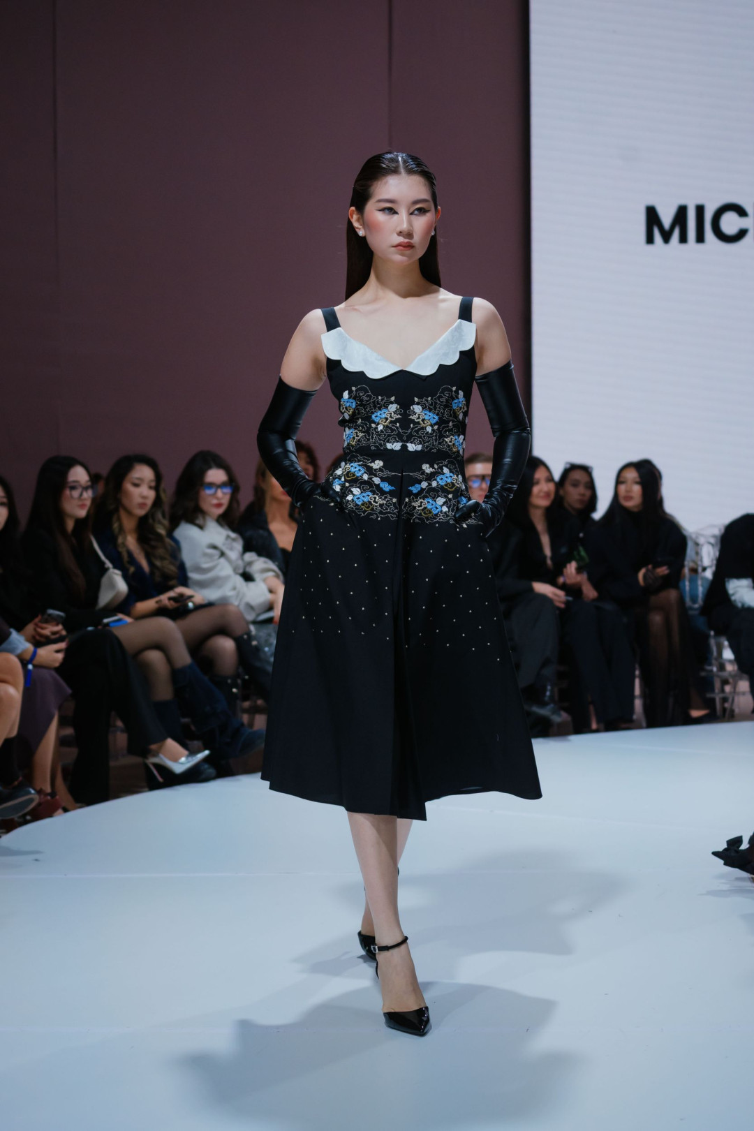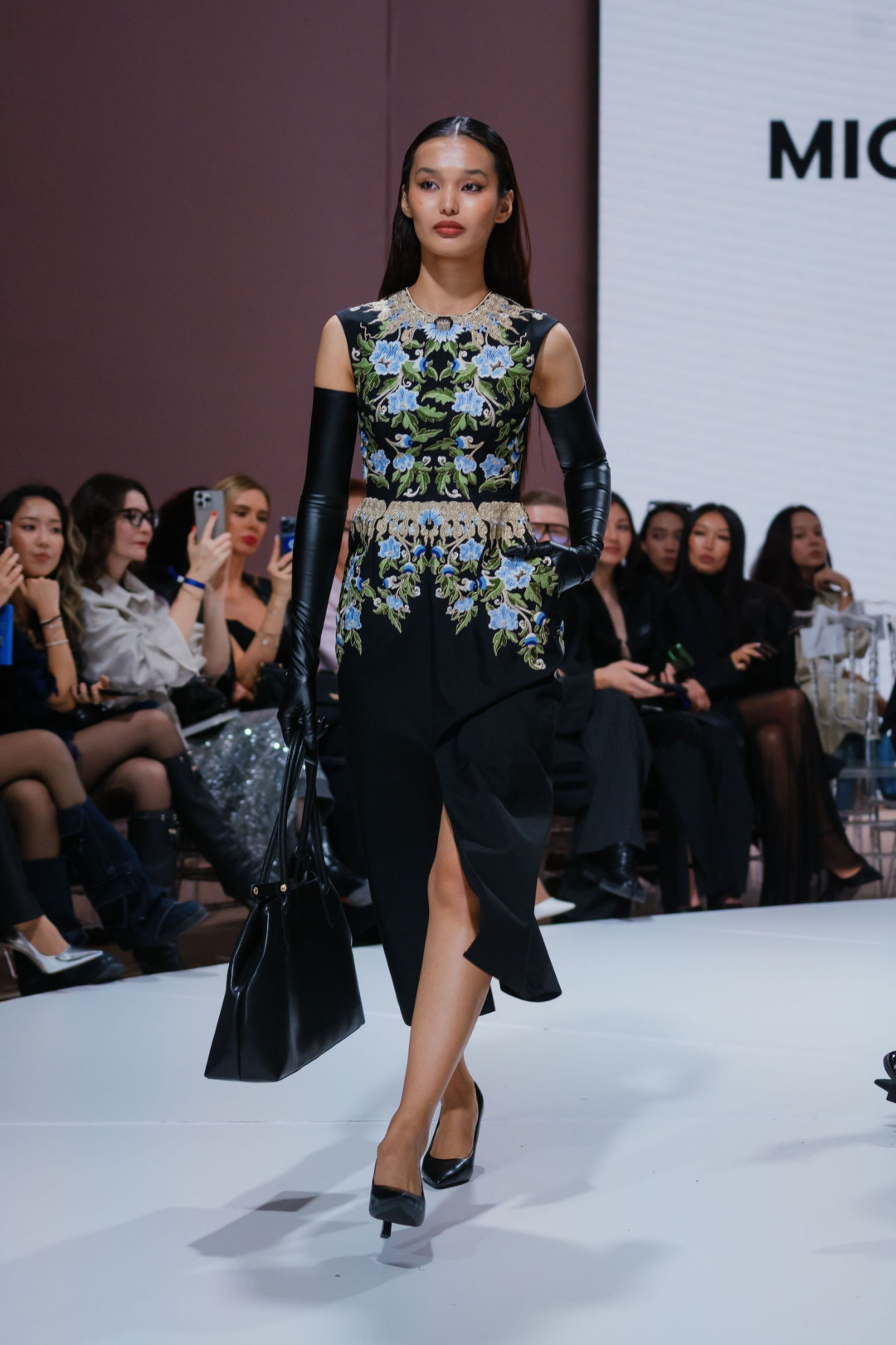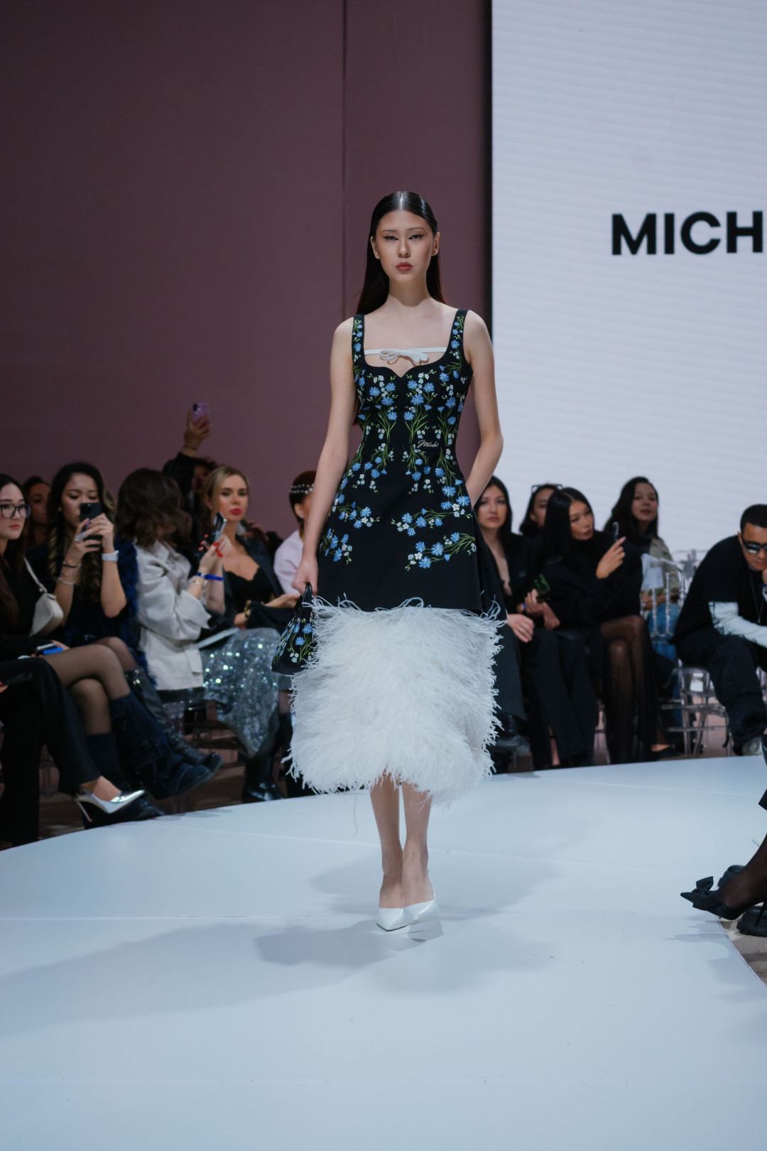 Фаворит редакции? Черное платье, расшитое голубыми цветами и завершенное подолом из белых перьев. В нем соединились урбанизм и степная поэтичность. Вышивка напоминала о полевых цветах, перья — о движении ветра над степью, а вместе они создавали образ героини Michel & Amazonka — свободной, независимой и сильной.