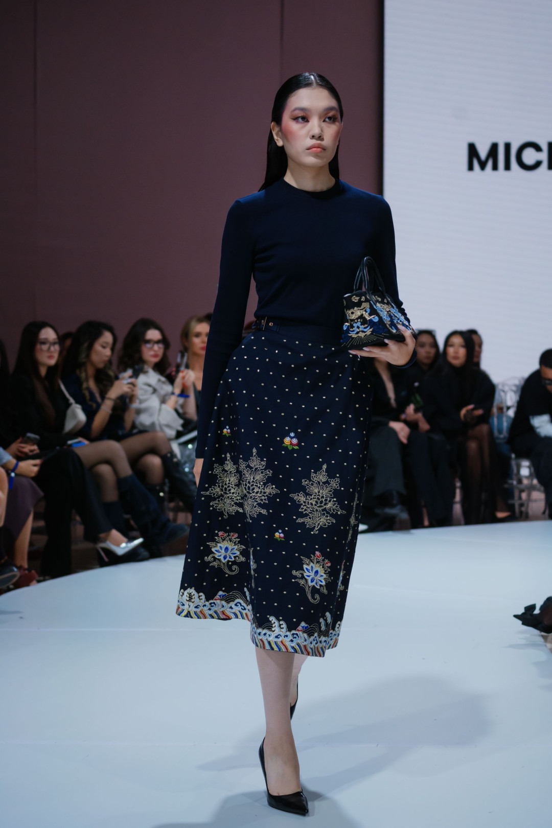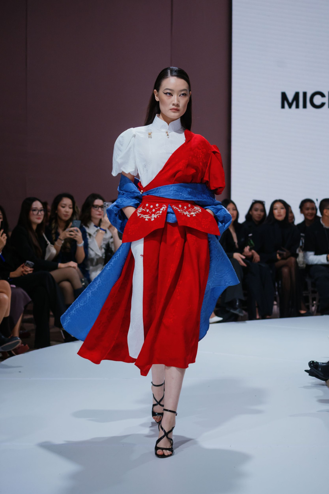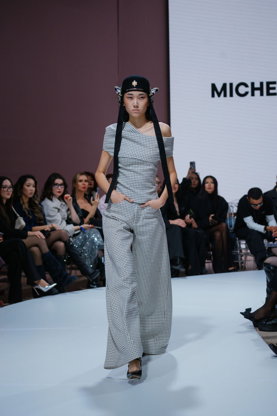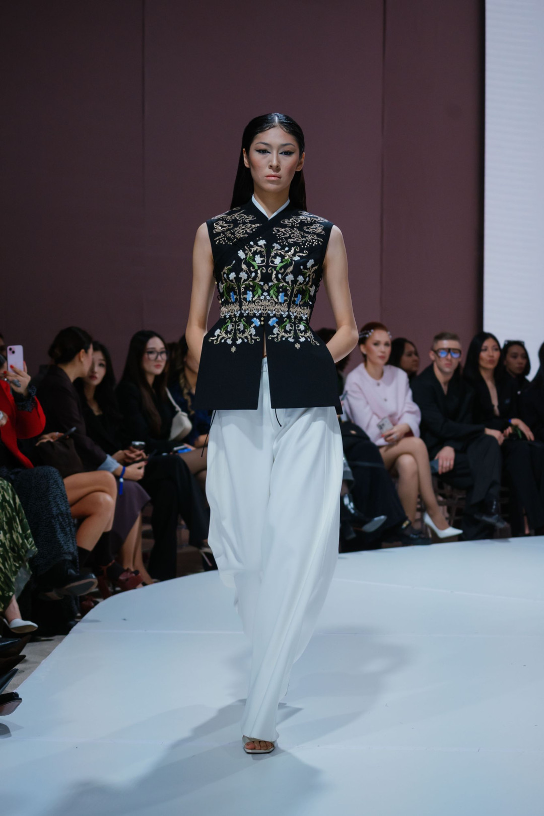 Новая коллекция стала продолжением этого пути — на этот раз не спортивного, а художественного. На подиуме она звучала как тонкий диалог между прошлым и настоящим. Строгие силуэты служили фоном для флористической вышивки, похожей на оживший гобелен. Красный и синий, переплетаясь с белым, рождали образы, вдохновленные традиционными костюмами, но переосмысленные заново. Клетчатый костюм с асимметричным плечом выглядел как современная вариация делового гардероба, а в сочетании с национальным головным убором приобретал культурную глубину.