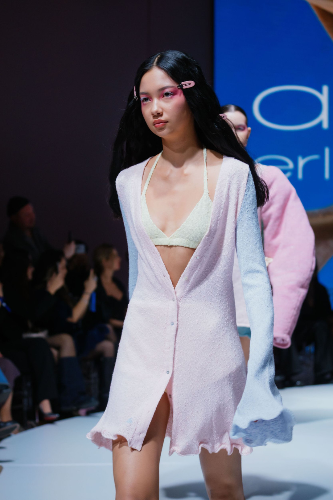 Финал показа стал кульминацией. На подиуме появились два платья — черное и небесно-голубое. Их драпировки ложились широкими волнами, превращая ткань в архитектуру, а линии напоминали лепестки, раскрывающиеся навстречу будущему.