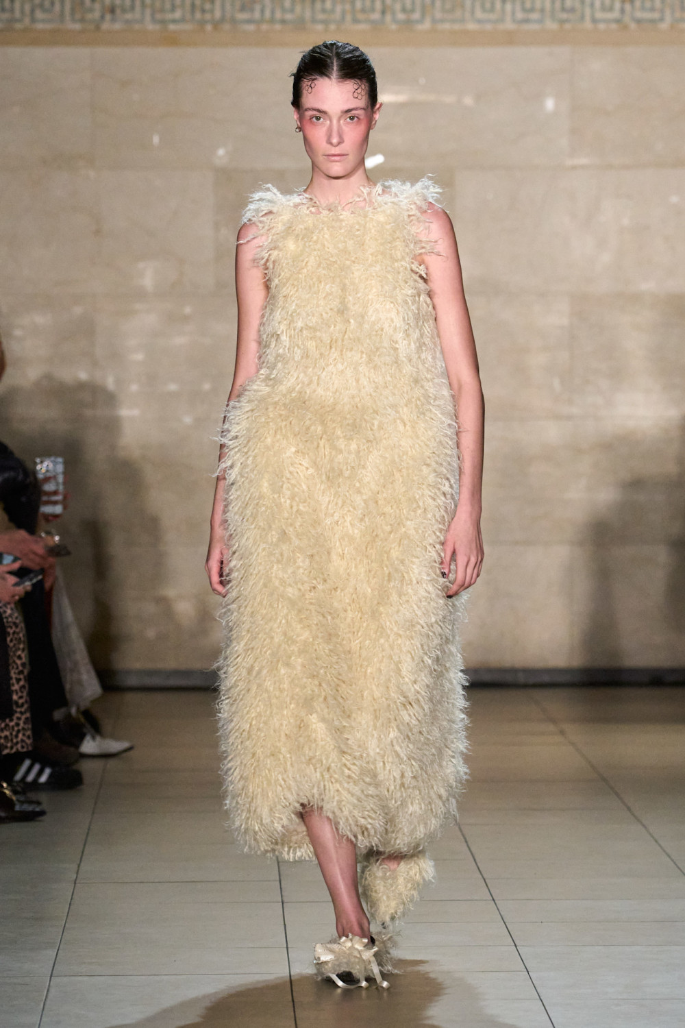 В этой коллекции она смело соединяет эпохи, текстуры и образы. Строгие пиджаки гармонично дополняют рукава-буфы, придающие им легкость, трикотажные леггинсы неожиданно соседствуют с пушистыми болеро, скрывающими под собой бра, а минималистичное платье-комбинация оживает благодаря тонким воланам на подоле. Даже обувь становится частью этой художественной игры: туфли, отделанные овчиной, добавляют образам тактильную глубину и ощущение домашнего уюта.