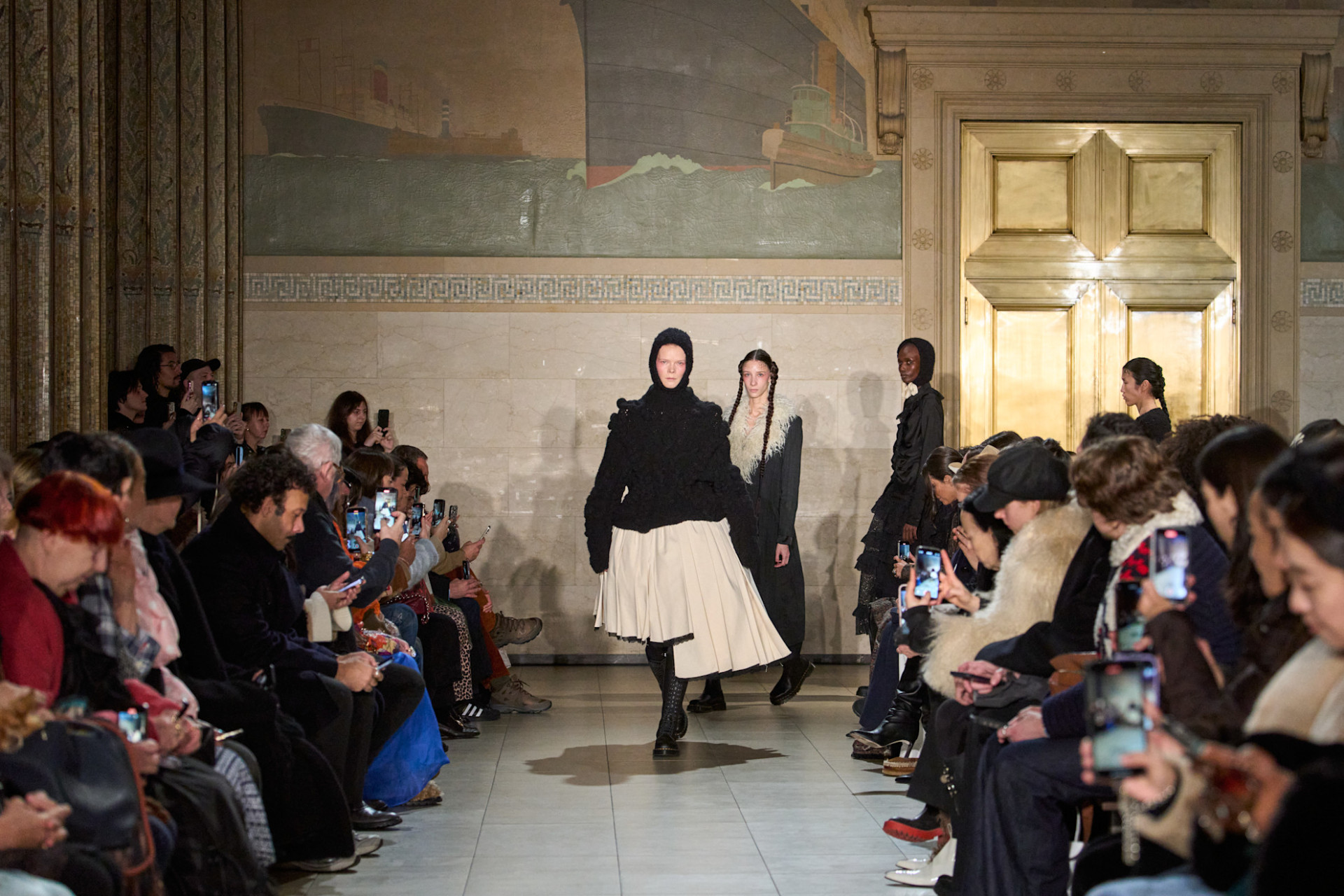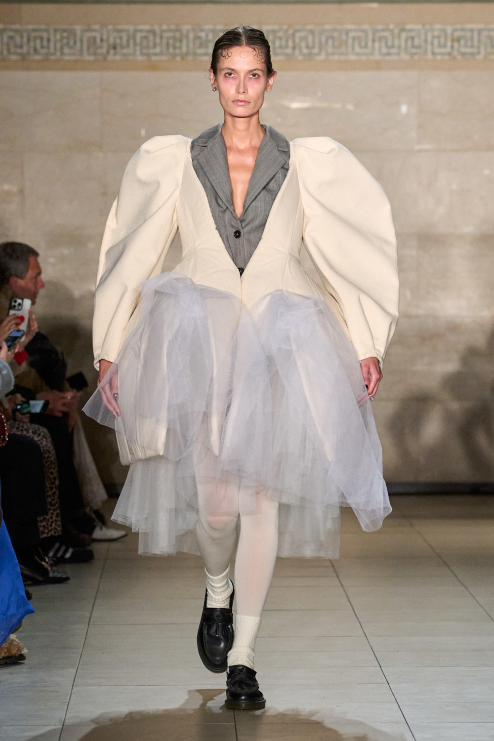 Открывающий образ — объемный свитер, словно переплетающийся с балаклавой, и асимметричная юбка со складками, отсылающая к шотландским килтам, — задал тон всему шоу. За ним последовала череда нарядов, вдохновленных викторианской эпохой: корсеты и каркасные конструкции, многослойный тюль и тончайшее кружево — все это не просто игра с историческими мотивами, а переосмысление традиций в современной интерпретации.
