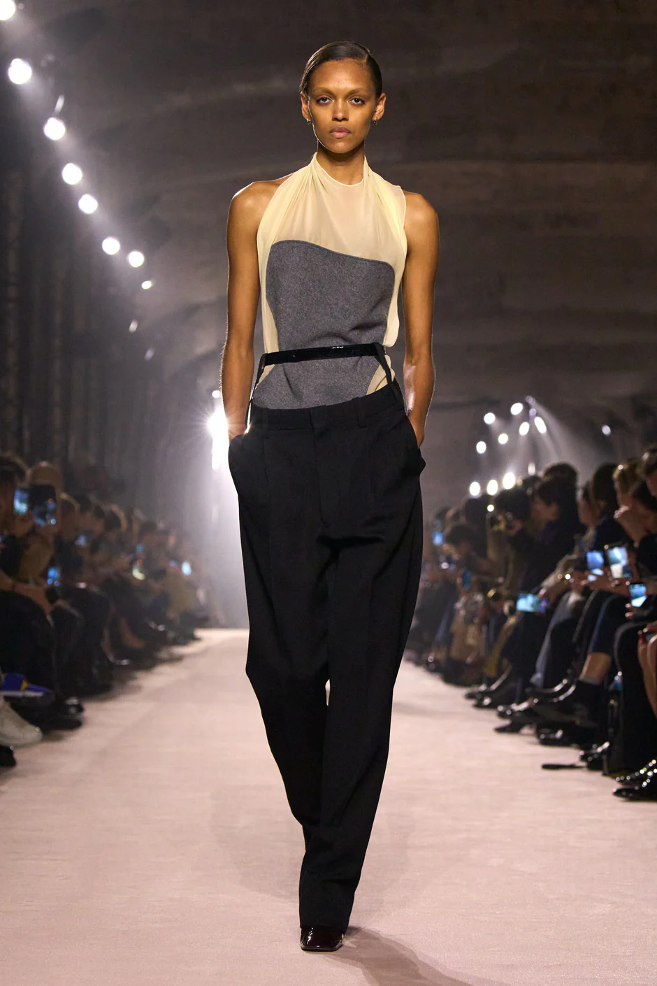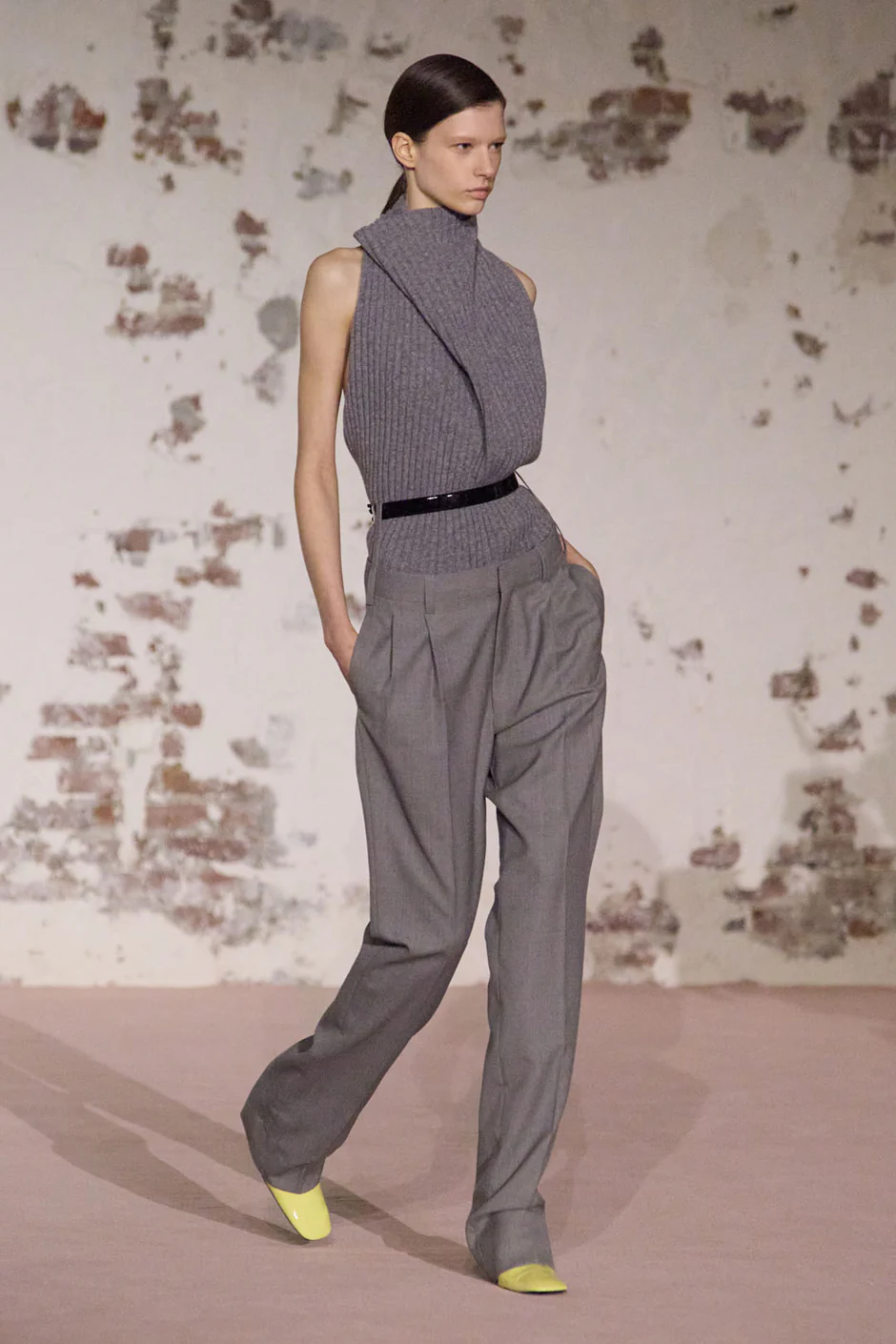 «Я хотела уйти от навязчивого стремления к идеалу и показать радость случайных находок», — поделилась Виктория. В этом настроении и были созданы расслабленные брюки в мужском стиле, будто бы небрежно зафиксированные на талии импровизированным движением. Им в пару она предложила укороченные трикотажные топы и пиджаки на голое тело — смело, но утонченно.