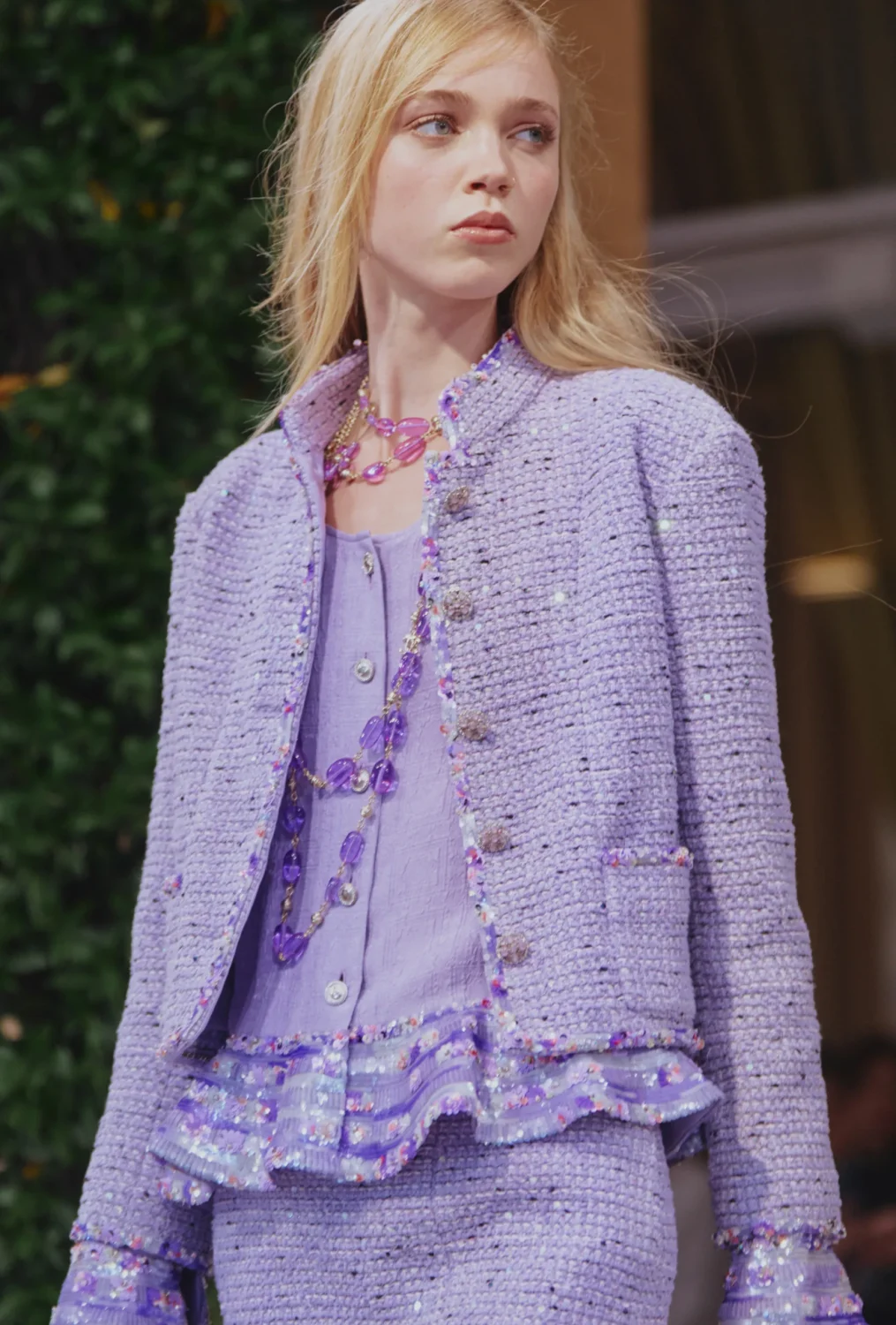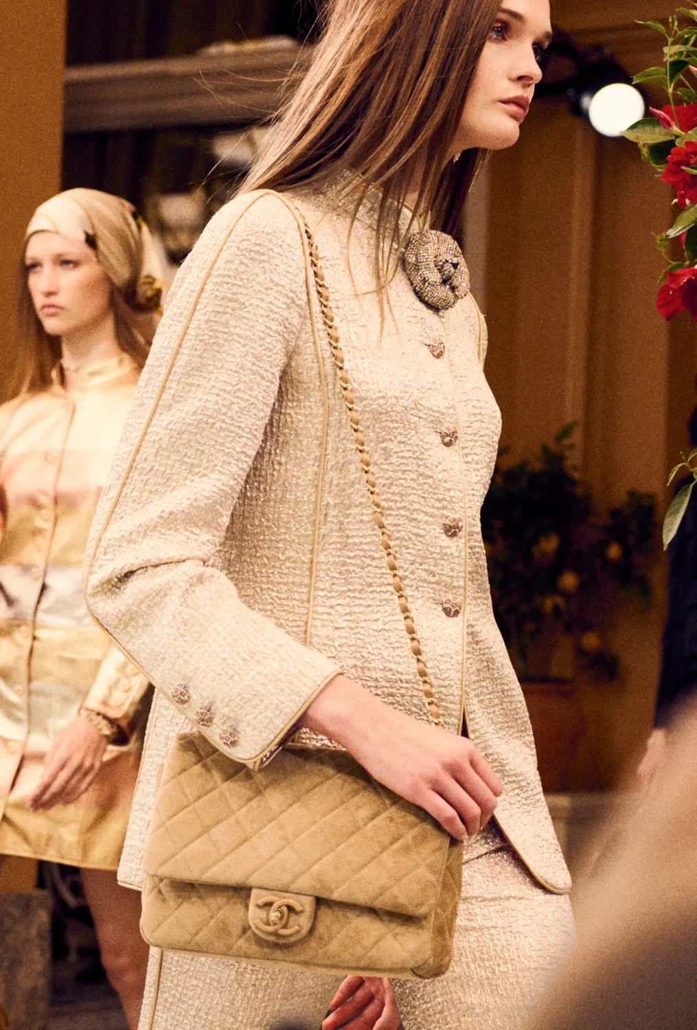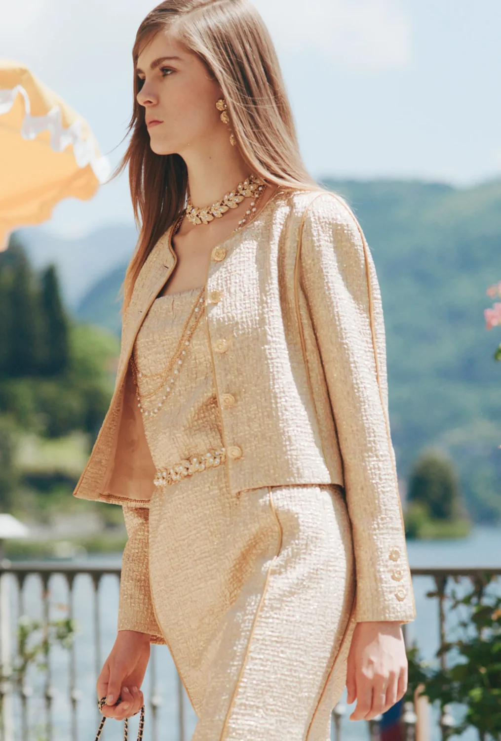 А еще — черный твидовый костюм, усыпанный разноцветными блестками, как ночное небо на Ривьере. И комбинезоны из ламе — один оранжевый, другой розовый — блестящие до невозможности, как вечер, когда все только начинается. Вот такой Chanel предложил нам отпуск: с легкой драмой, блеском и бесконечной верой в то, что можно быть разной. Но всегда — собой.