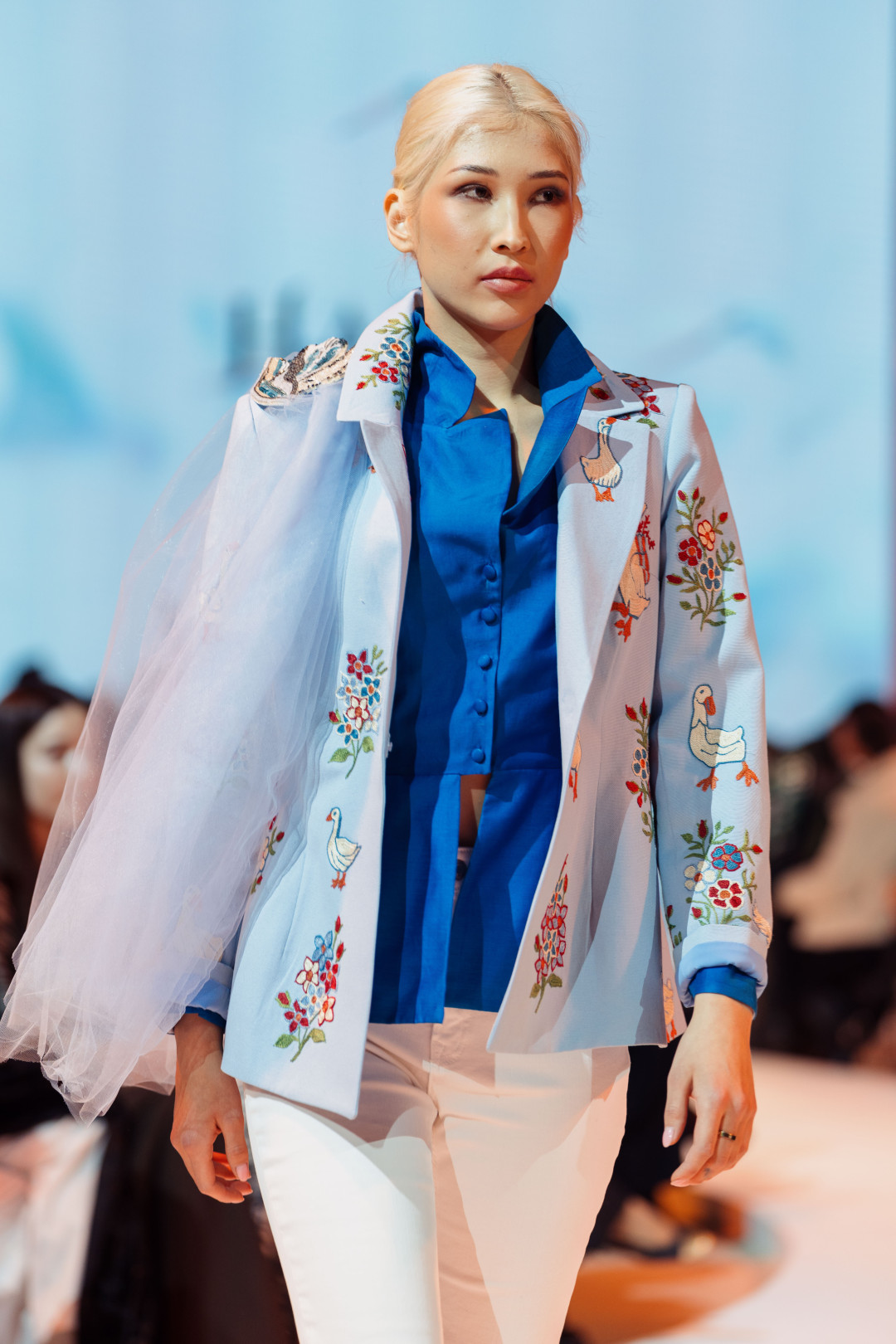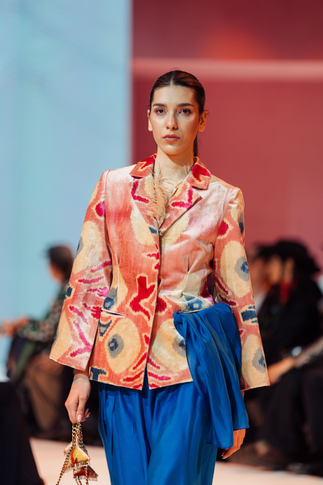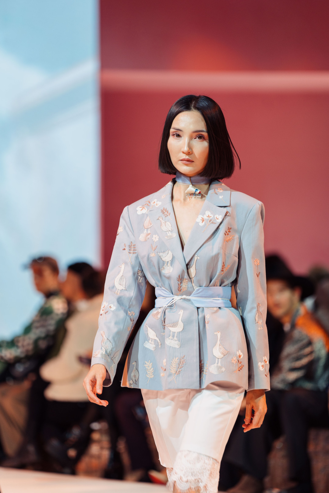 Коллекция, представленная на VFWT, раскрывалась постепенно, предлагая зрителю рассматривать ее слой за слоем. Сначала на подиуме появился жакет, украшенный тонкими хлопковыми веточками. Деталь аккуратная, почти скромная, но именно она задавала тон — подсказывала, что подлинная красота часто живет в штрихах. Этот мотив переходил в следующий образ — голубой костюм строгого силуэта с вышитыми гусями и садовыми линиями. А после него в пространстве дефиле возникли жакеты из шелка-иката в красно-розовой гамме и пальто с золотистыми акцентами. Образы звучали насыщенно, но при этом спокойно, потому что за каждым решением чувствовались вкус и продуманность.