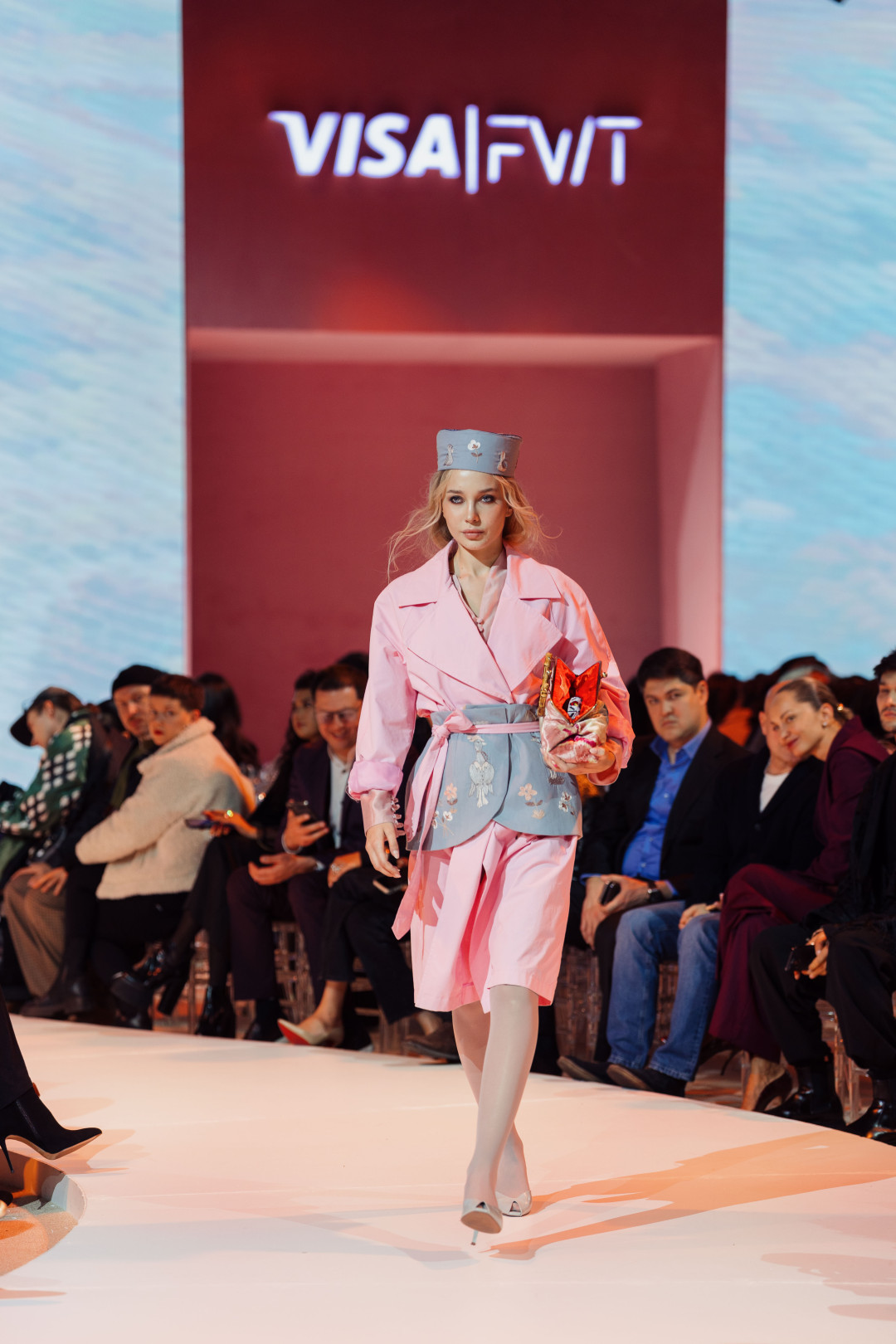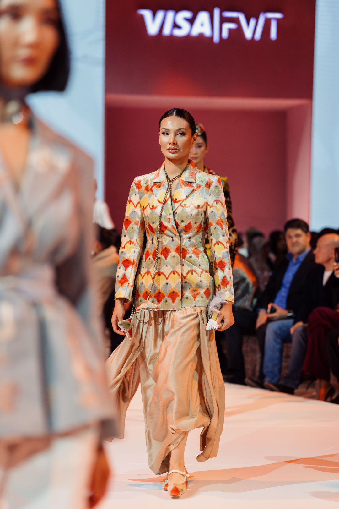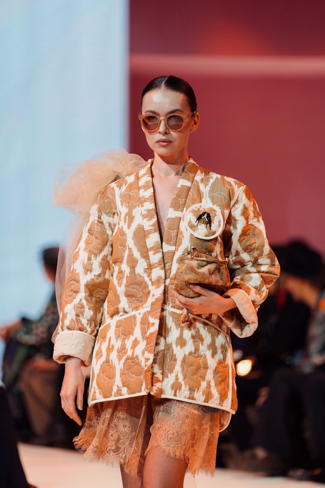 Коллекция, представленная на VFWT, раскрывалась постепенно, предлагая зрителю рассматривать ее слой за слоем. Сначала на подиуме появился жакет, украшенный тонкими хлопковыми веточками. Деталь аккуратная, почти скромная, но именно она задавала тон — подсказывала, что подлинная красота часто живет в штрихах. Этот мотив переходил в следующий образ — голубой костюм строгого силуэта с вышитыми гусями и садовыми линиями. А после него в пространстве дефиле возникли жакеты из шелка-иката в красно-розовой гамме и пальто с золотистыми акцентами. Образы звучали насыщенно, но при этом спокойно, потому что за каждым решением чувствовались вкус и продуманность.
