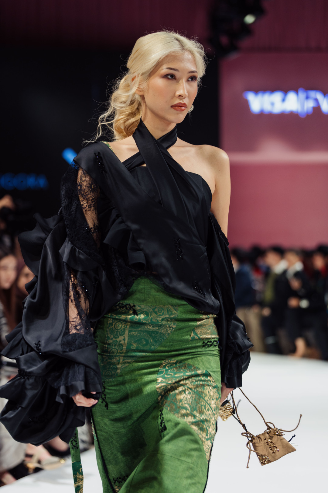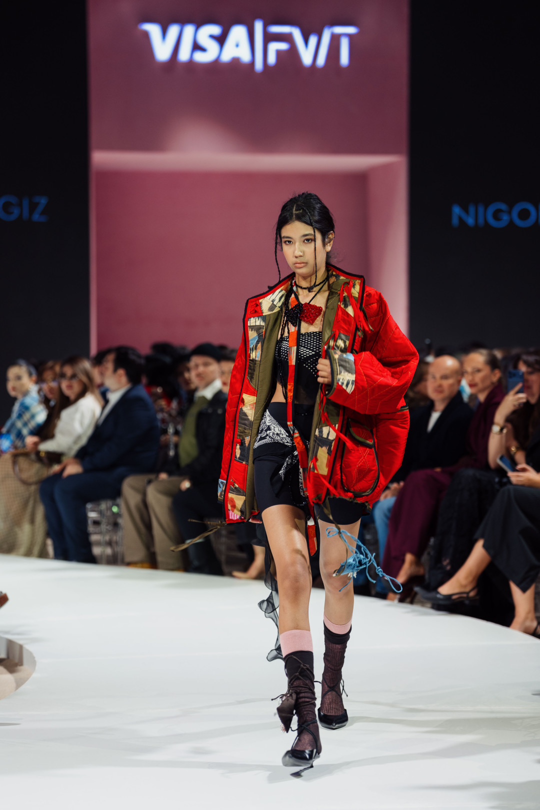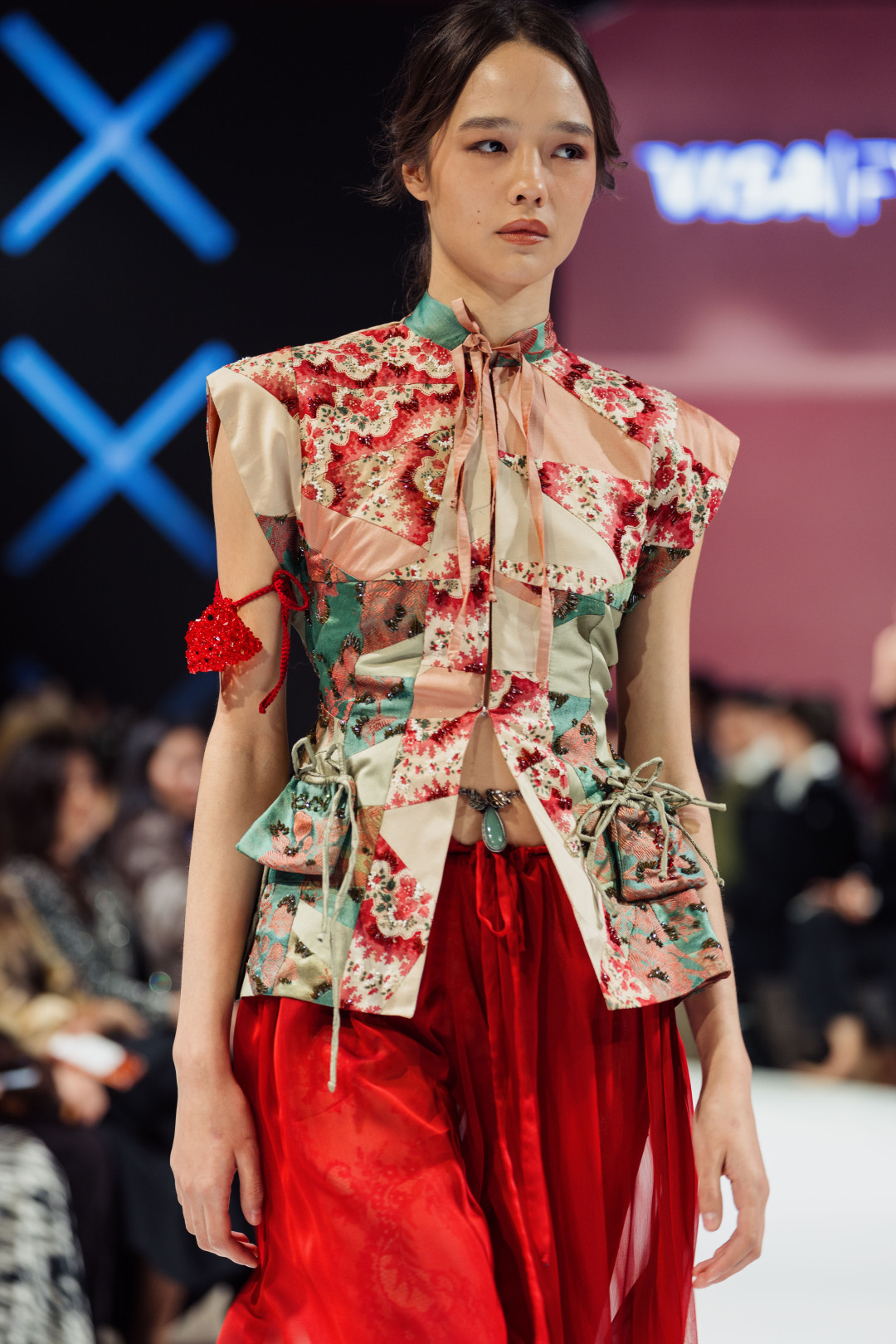 На подиуме одна из моделей появилась в светлой блузе, дополненной тяжелой золотистой парчой, свободно задрапированной вокруг бедер, словно импровизированным саронгом. Другая — в красной куртке с восточными мотивами и байкерскими шортами — в комбинации, которая в другом контексте выглядела бы слишком смело, но здесь раскрылась особенно гармонично. В этом образе угадывалась женщина, способная переключать роли так же легко, как струится ткань в умелых руках. Нельзя не отметить и лоскутный топ-холтер, сплетенный из зеленых и розовых отрывков ткани. Он становился наглядным примером того, что винтаж способен двигаться вперед, превращаясь в источник вдохновения для новых смыслов.